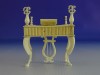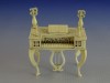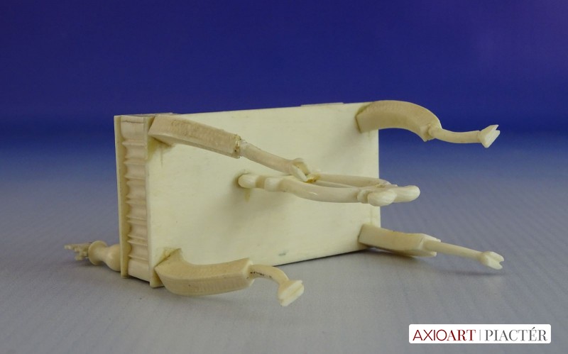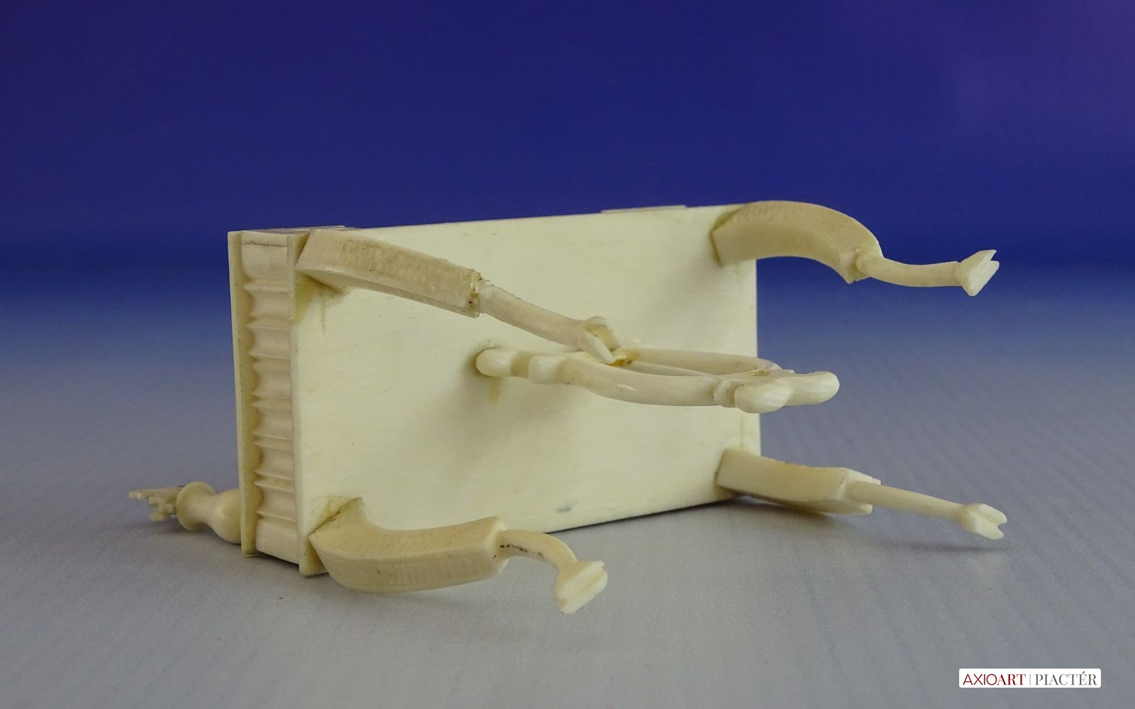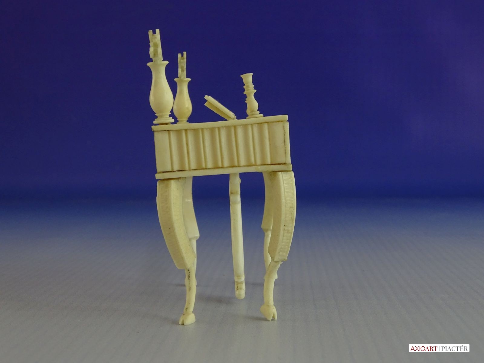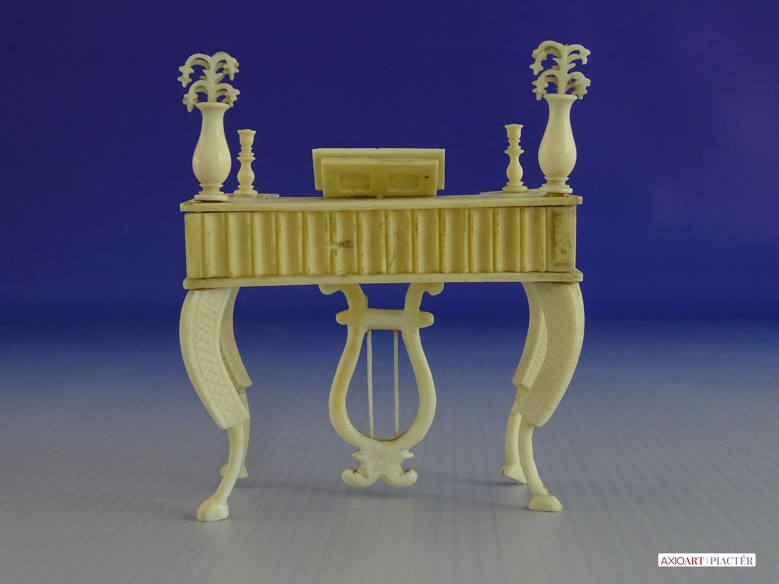 [0B005/Z041] Antik, kisméretű, elképesztően részletgazdag kidolgozású, áttört díszes csont zongora. Rajta vázában virágok, gyertyatartók és kottatartó látható. Magasság: 7.5 cm Szélesség: 3.7 cm Hosszúság: 6.5 cm Súly: 0.03 kg