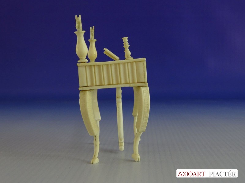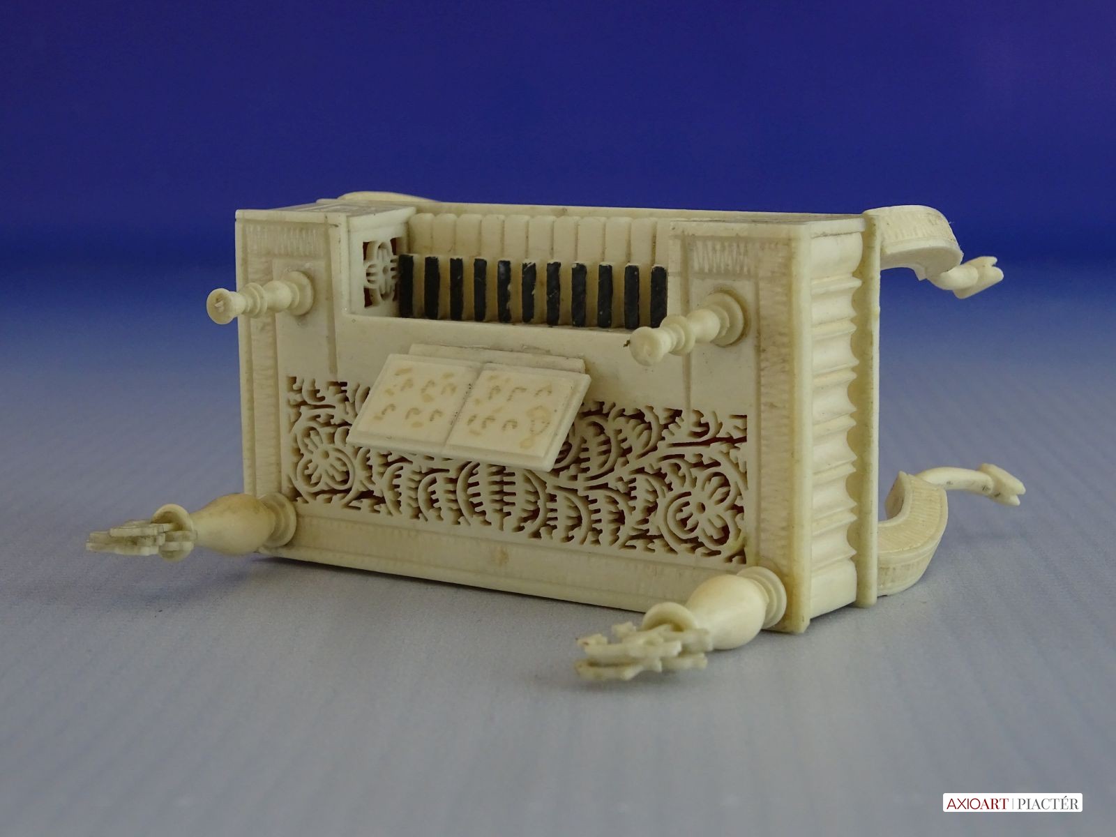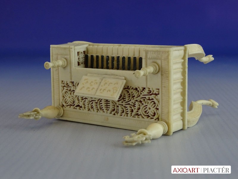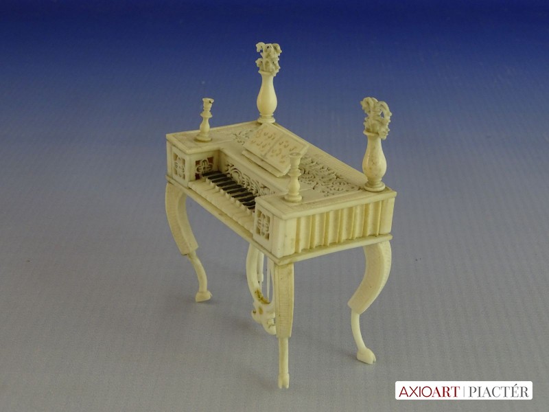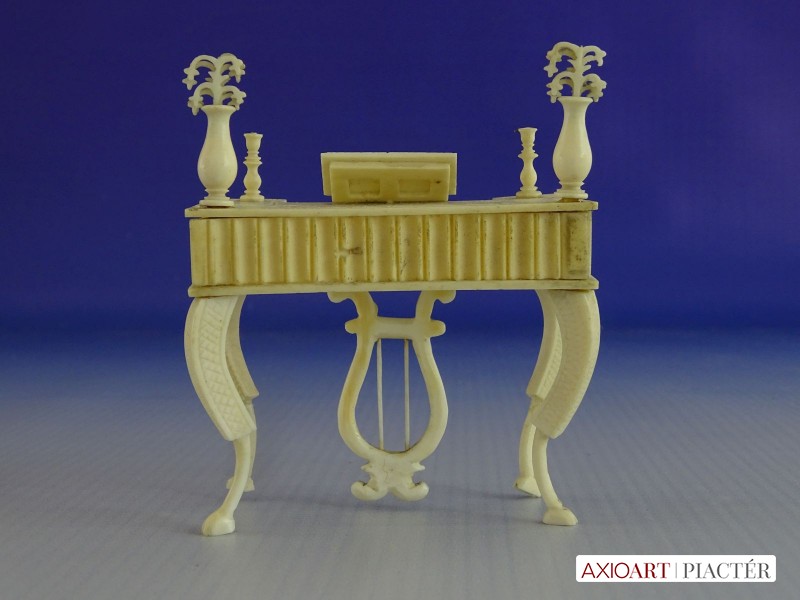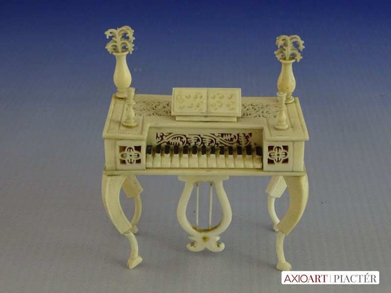 Antik, kisméretű, elképesztően részletgazdag kidolgozású, áttört díszes csont zongora. Rajta vázában virágok, gyertyatartók és kottatartó látható.