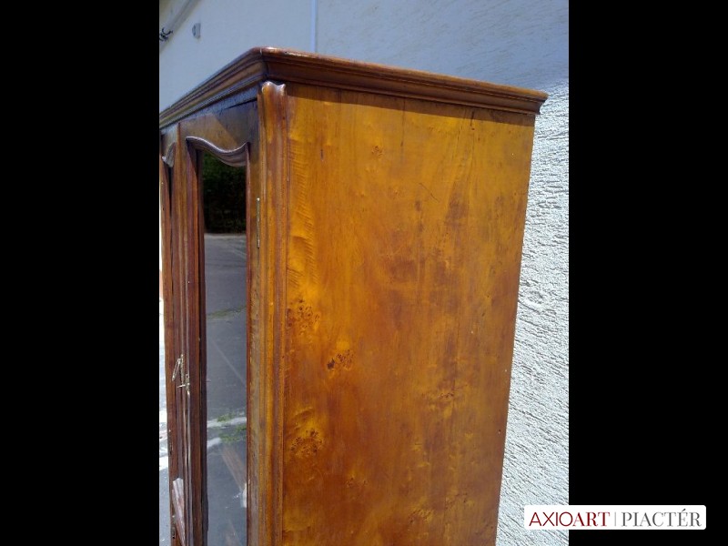 [D360/UZ-K] 1880 körüli neobarokk 3 polcos, üveges vitrin. Háta osztott, gyalult deszkás. Nagyon szép darab. A gyökérfurnér szinte teljesen ép, a fronton hibátlan, oldalán hátul egy 5 cm-es darab hiányzik. A vitrin felújítatlan, eredeti állapotban van, zárja és a zárcímek megvannak, a zár működik. Kulcs megvan hozzá. Magasság: 177 cm Szélesség: 95 cm Hosszúság: 46 cm