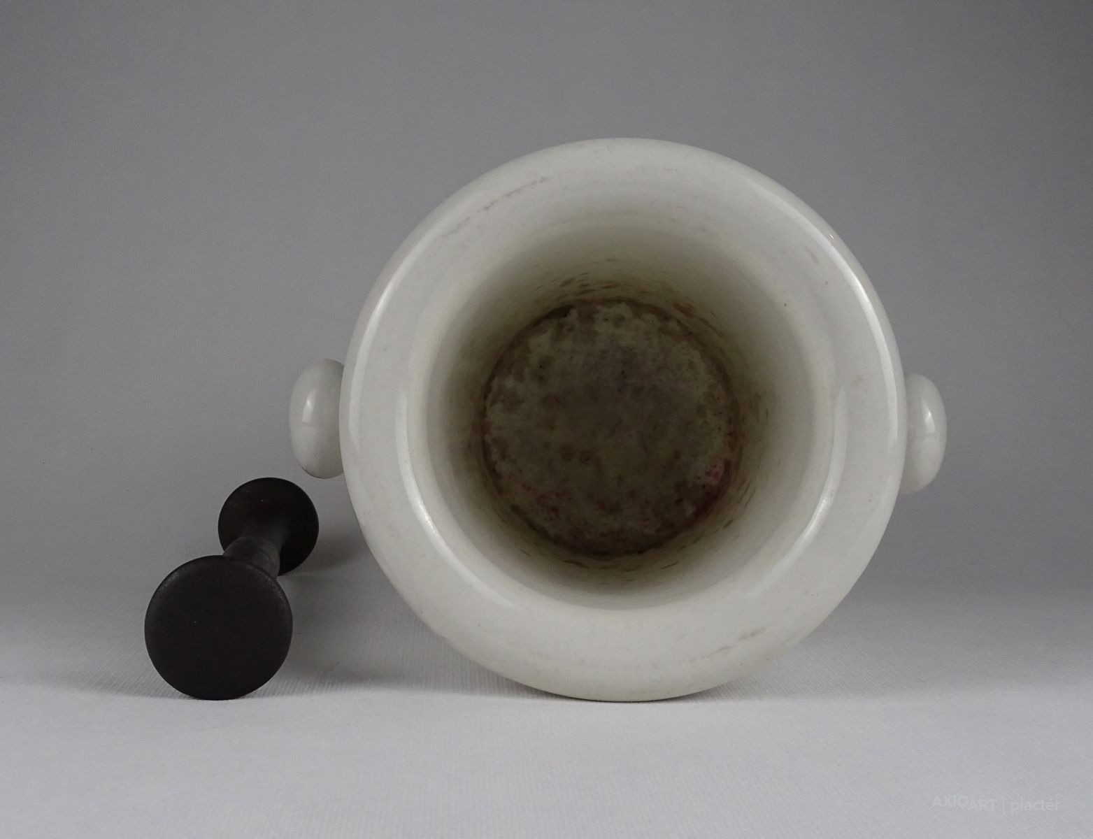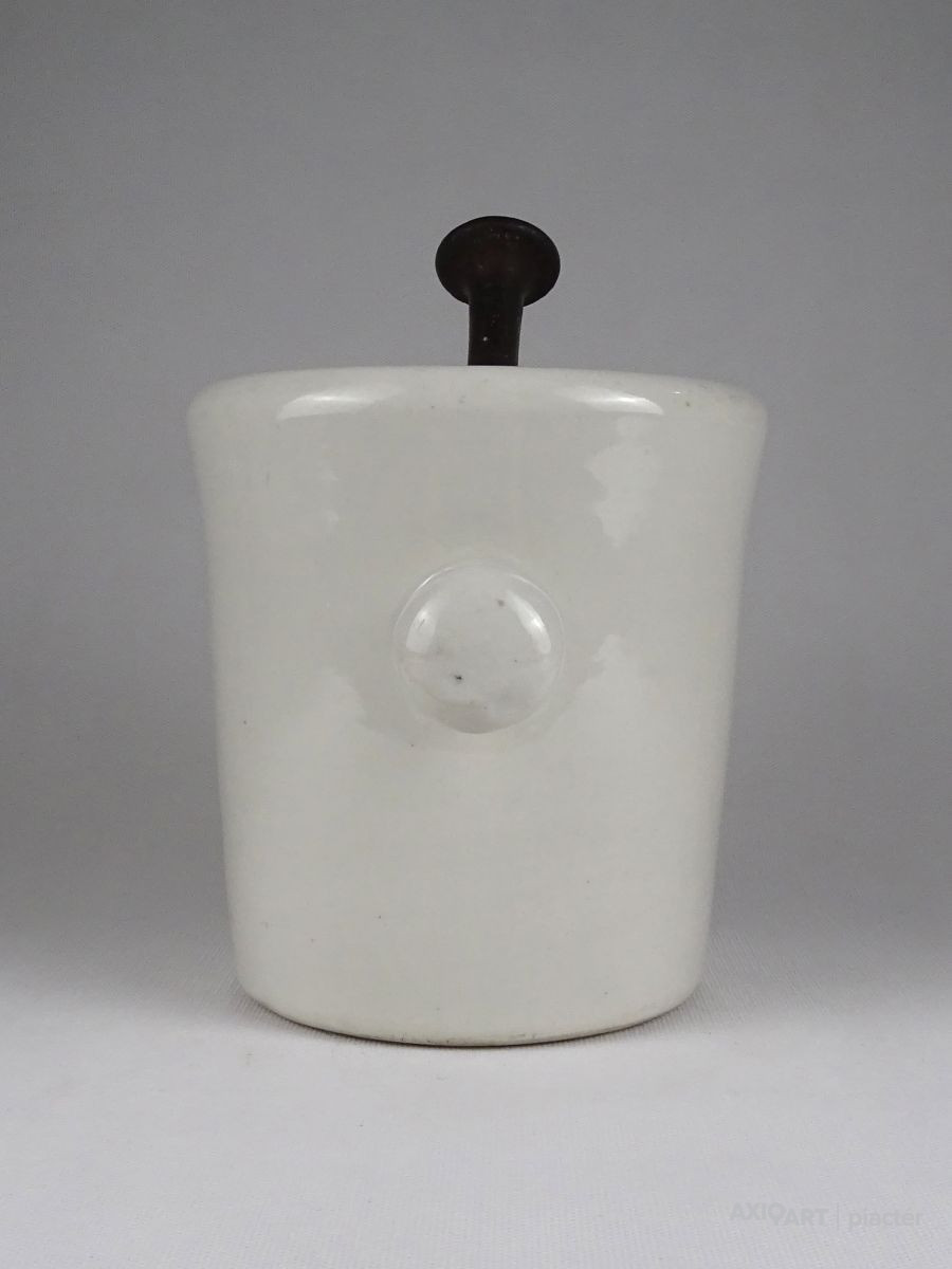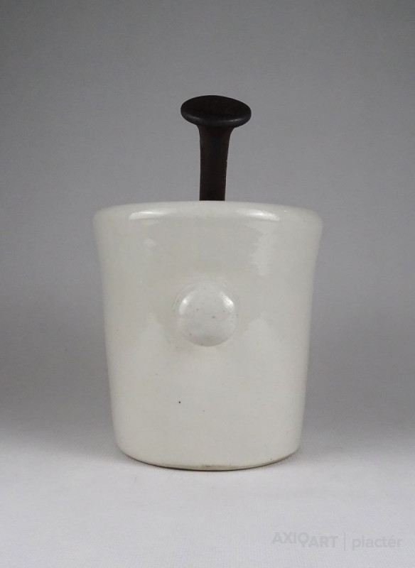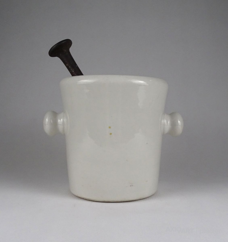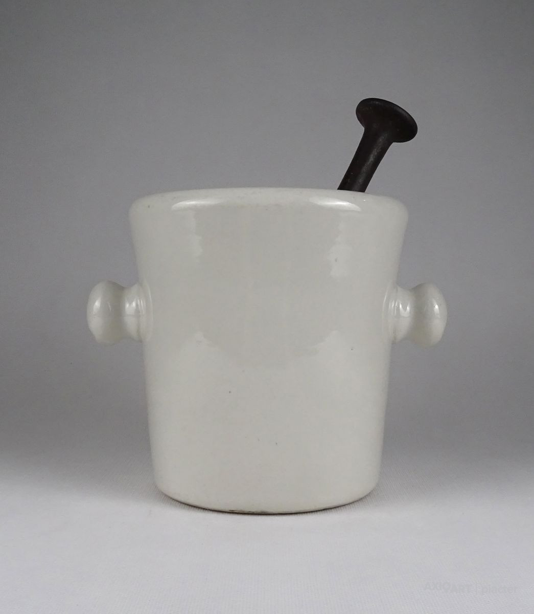 Antik, hibátlan állapotú, nagyméretű, jelzett, fehér színű, gömbfüles, vastag falú porcelán mozsár törővel. vas törő tartozik hozzá.