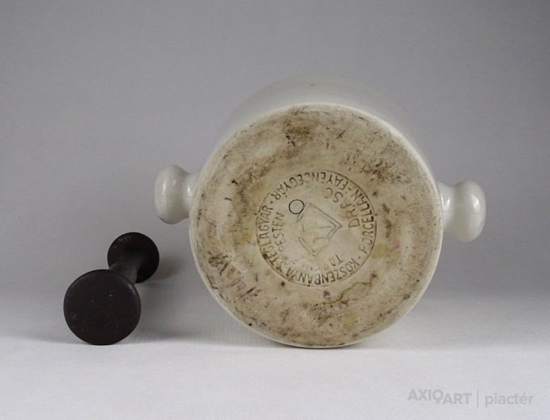 [1T120/Z035] Antik, hibátlan állapotú, nagyméretű, jelzett, fehér színű, gömbfüles, vastag falú porcelán mozsár törővel. vas törő tartozik hozzá. Alján jelzés, felirat: DRASCHE PORCELLÁN-FAYENCE GYÁR KŐSZÉNBÁNYA 'S TÉGLAGYÁR TÁRSULAT PESTEN Magasság: 16.5 cm Szélesség: 16 cm Hosszúság: 21.5 cm Súly: 4.225 kg