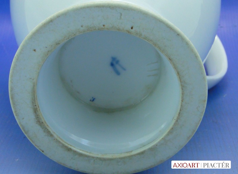 [0A747/X058] Gyönyörű, antik, hibátlan állapotú, diszkrét kék díszítésű jelzett porcelán teás kanna, tea kiöntő a 19. századból. Alján halványkék kardos Elbogeni jelzés. Ezt a jelzést 1815-1873 között használta a gyártó! Magasság: 23.5 cm Szélesség: 13 cm Súly: 0.98 kg