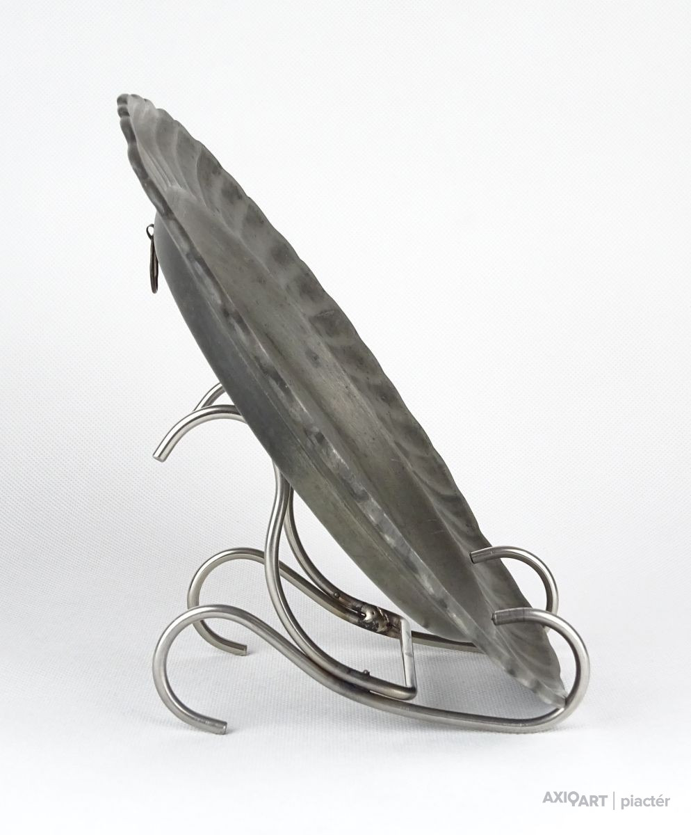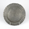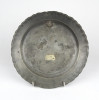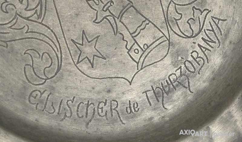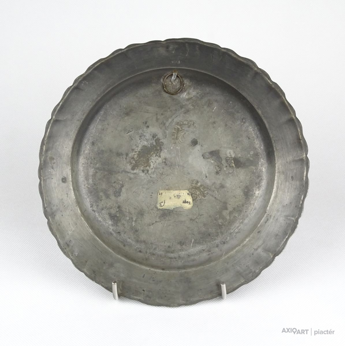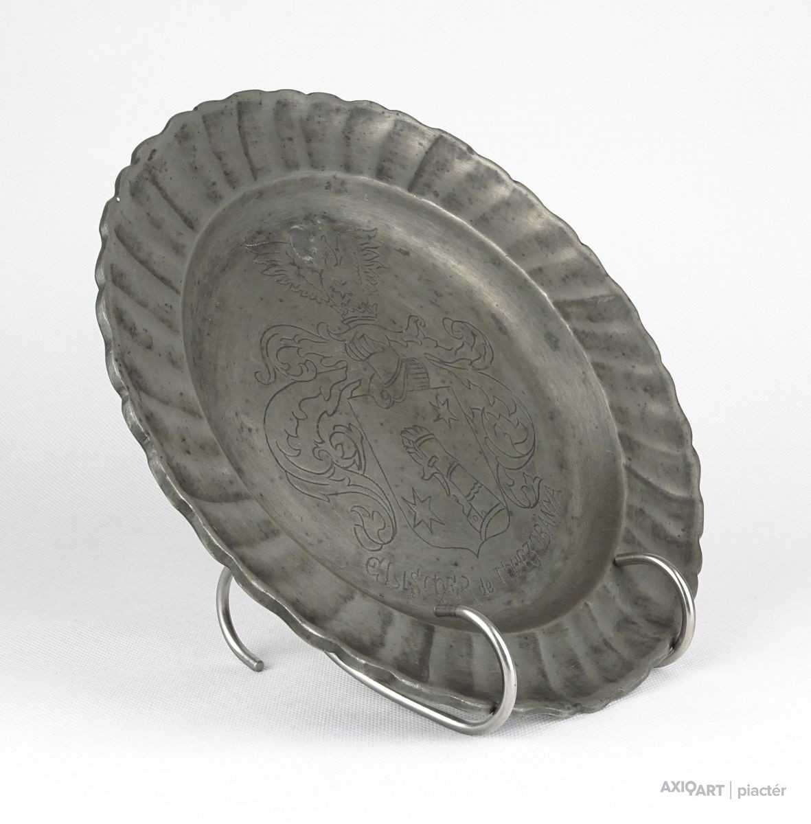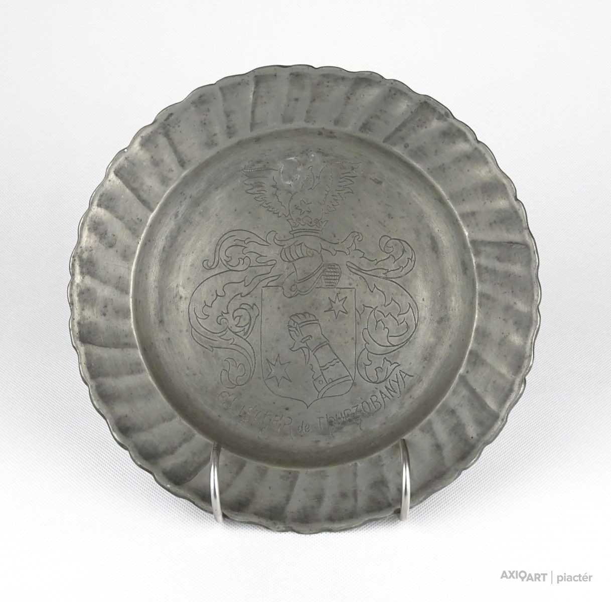 Antik, szép állapotú, fodros szélű jelzett óntányér, a 18. századból. Közepében címer: korona felett bagoly, címerpajzsban lovag páncélos karja, csillagokkal.