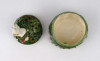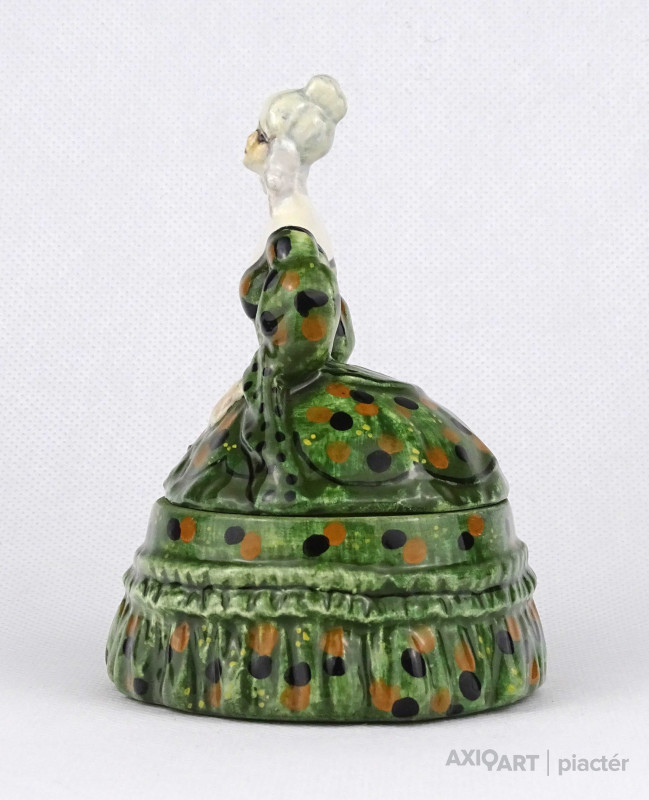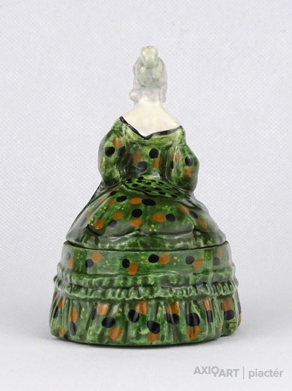 Antik előkelő hölgyet formáló, figurális majolika fedeles bonbonier 11.5 cm