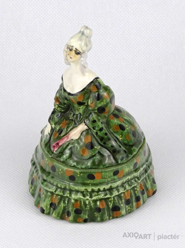 Antik, hibátlan állapotú, jelzetlen, barokk öltözetű előkelő hölgyet formáló figurális majolika fedeles bonbonier. A figura nyaka restaurátor által szakszerűen javított.