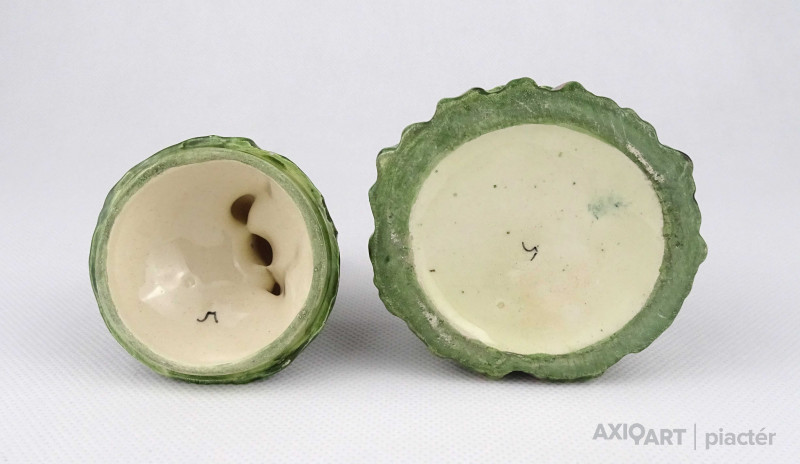 [1X606/Z022] Antik, hibátlan állapotú, jelzetlen, barokk öltözetű előkelő hölgyet formáló figurális majolika fedeles bonbonier. A figura nyaka restaurátor által szakszerűen javított. Magasság: 11.5 cm Szélesség: 7.5 cm Hosszúság: 8.3 cm Súly: 0.125 kg