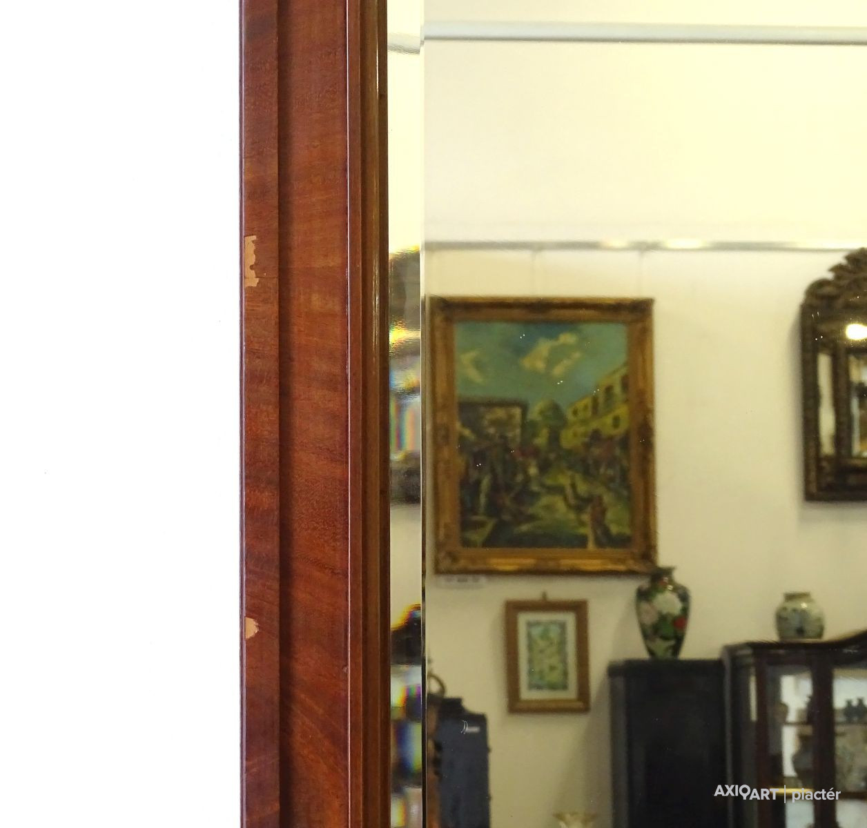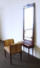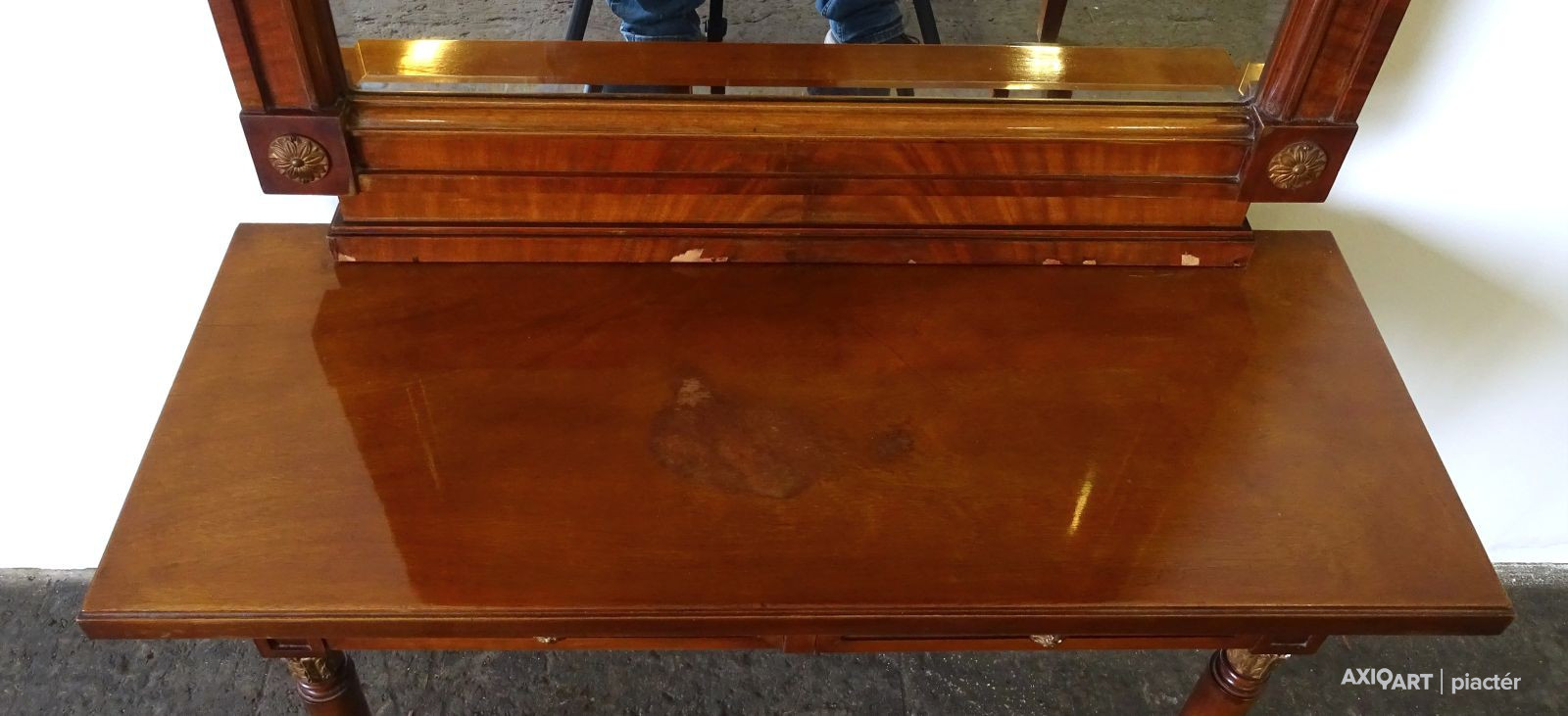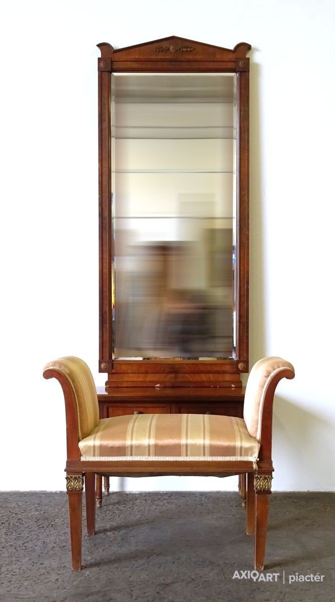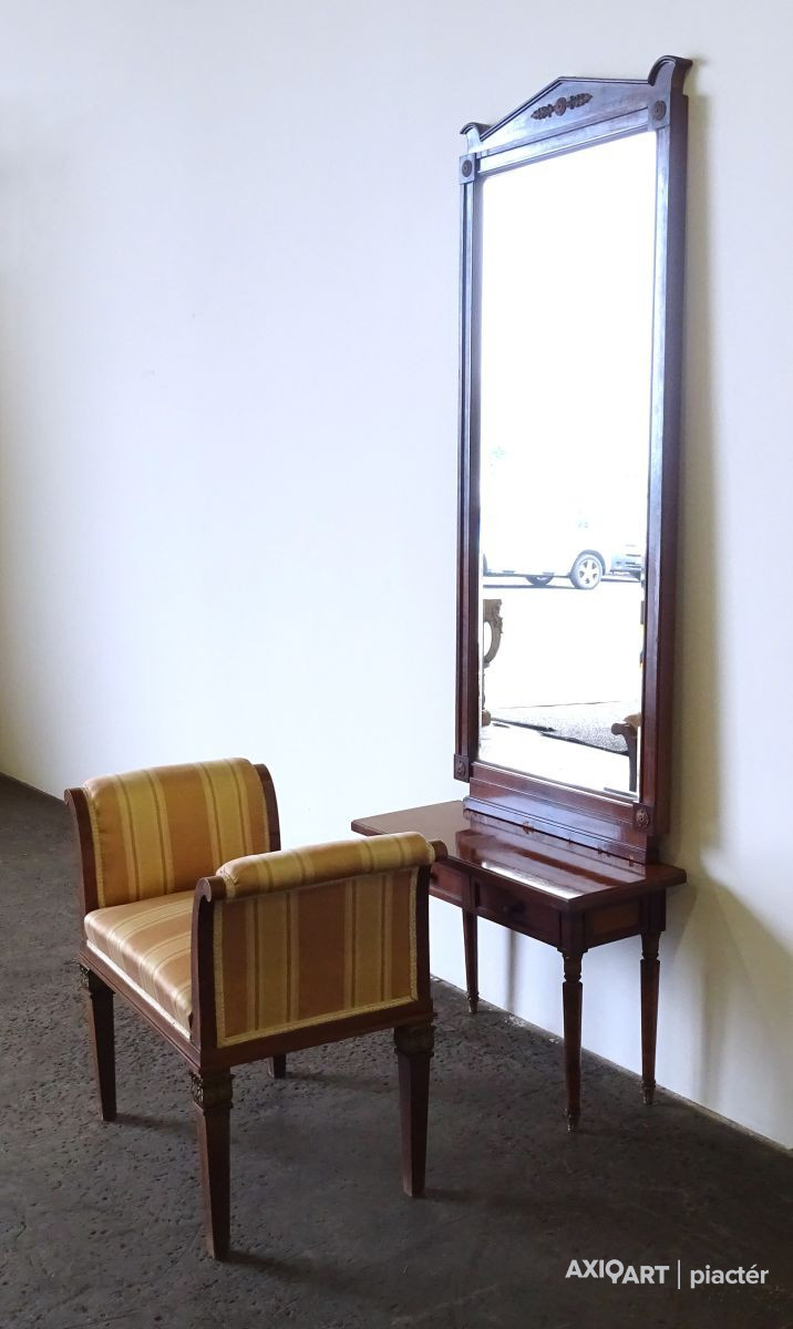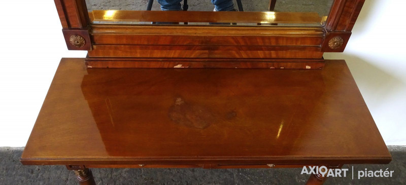 - 1 darab kétfiókos kis asztal, rajta levehető metszett tükör (210 cm magas, 78.5 cm széles, 30 cm mély. A tükör látható mérete: 130.5 x 56.5 cm)