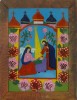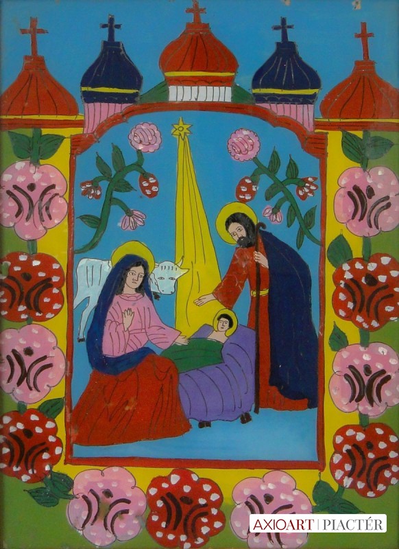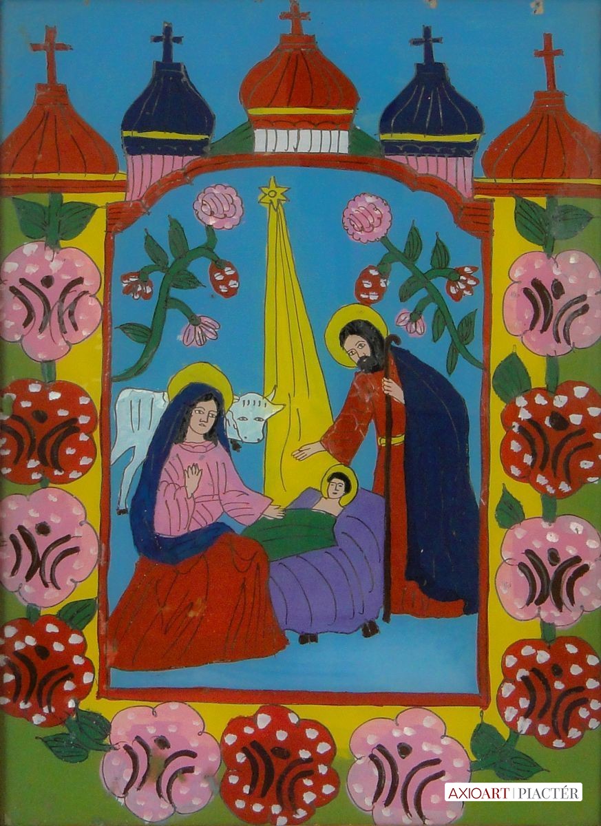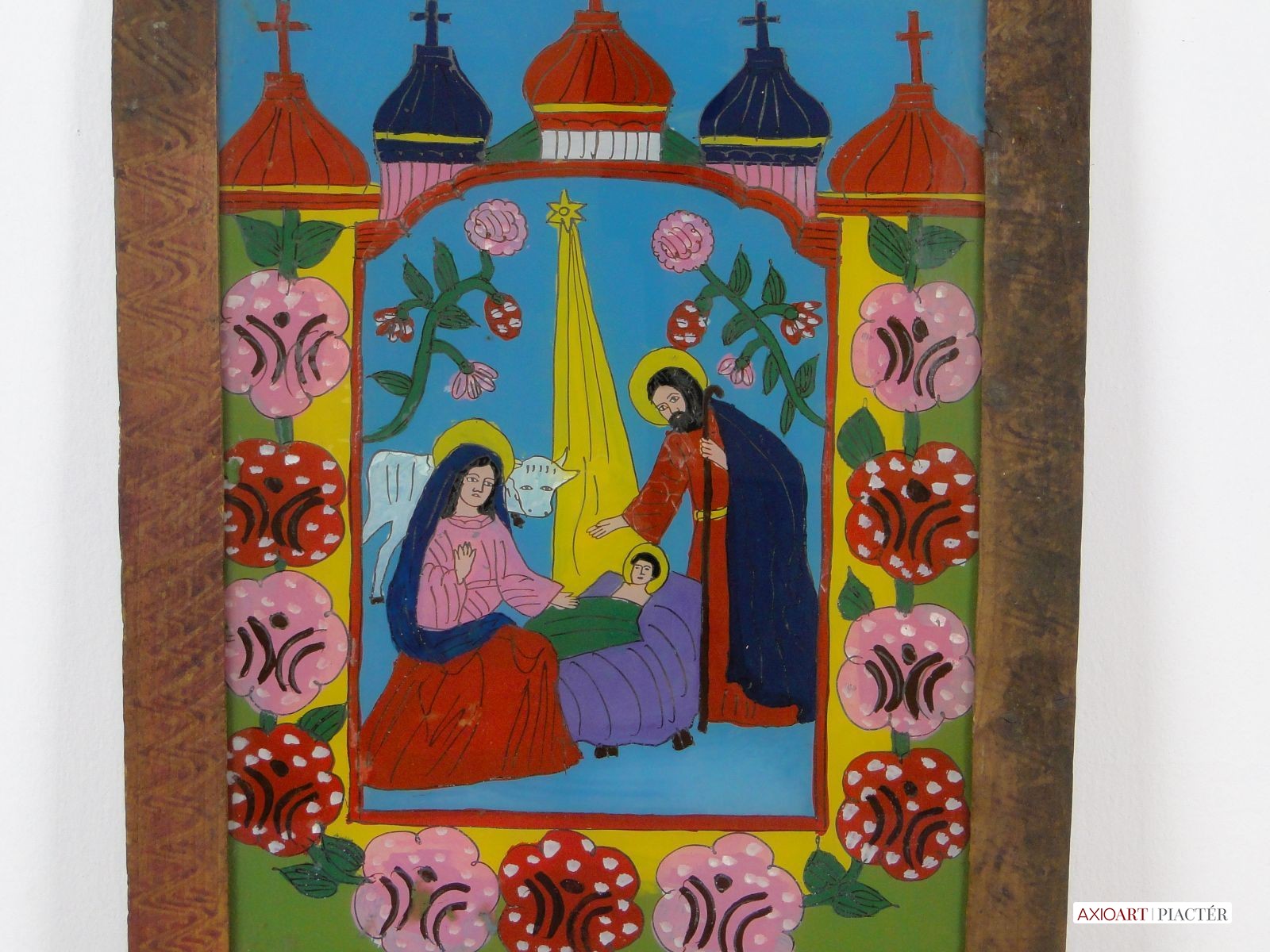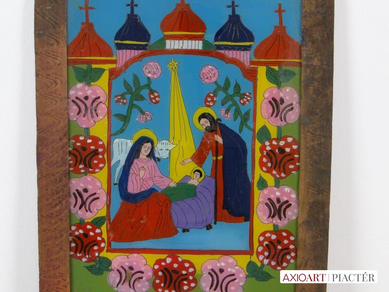 [0E976/016] Színes üveg ikon, hibátlan állapotú, XIX. század vége, díszes floderozott keretben. Válogatott, néprajzi gyűjteményből származó anyag. Magasság: 47 cm Szélesség: 37 cm Súly: 0.956 kg
