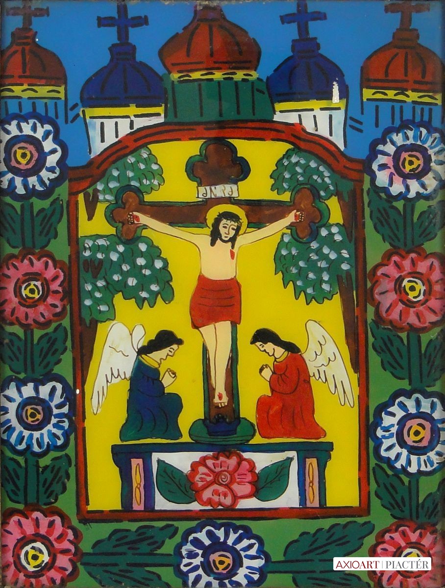 Antik erdélyi üveg ikon : Jézus a kereszten