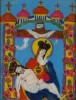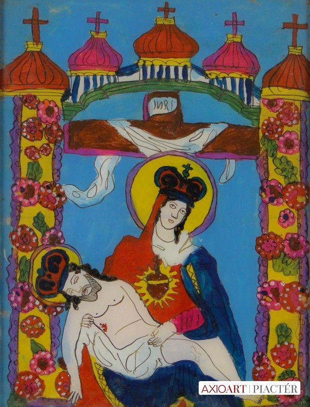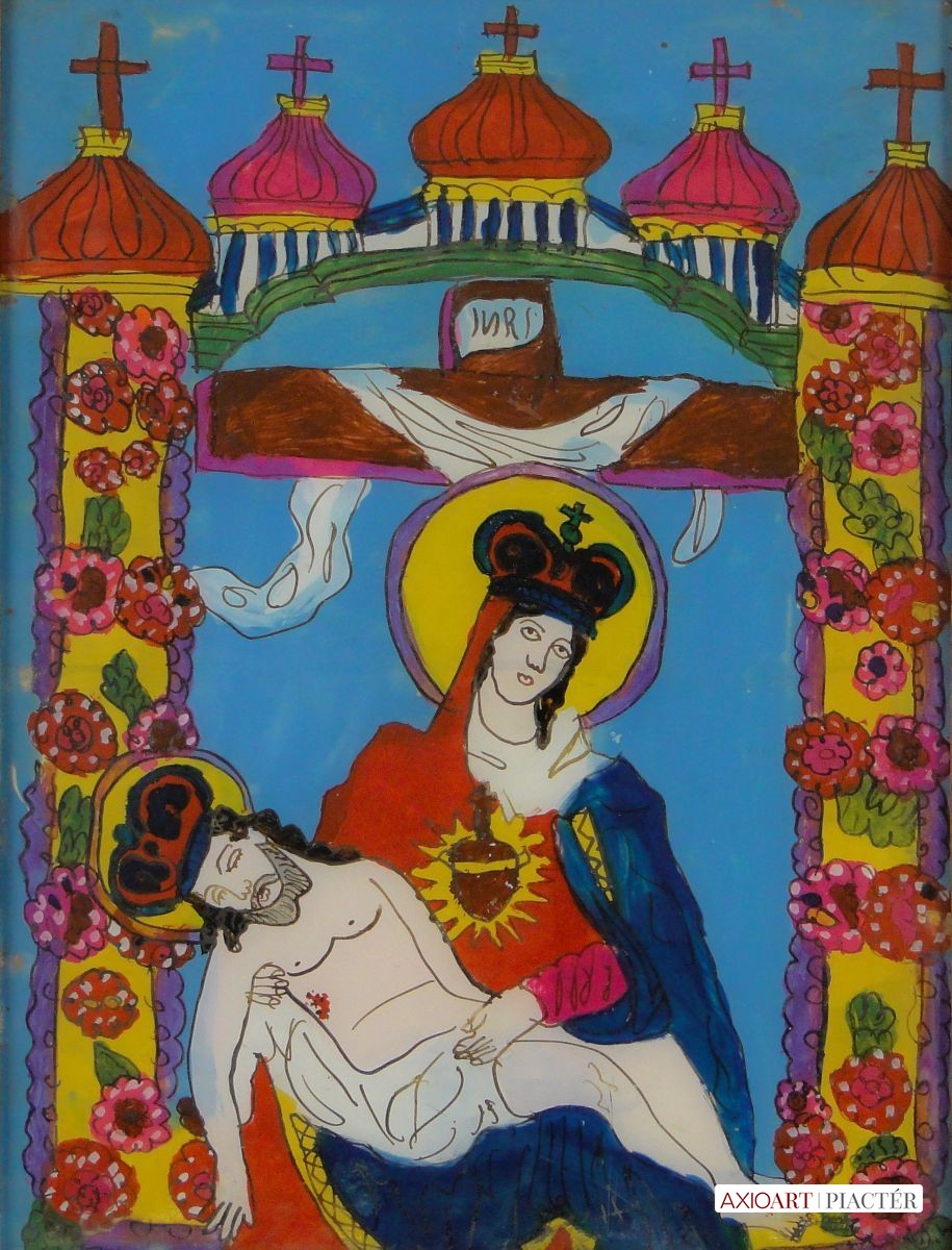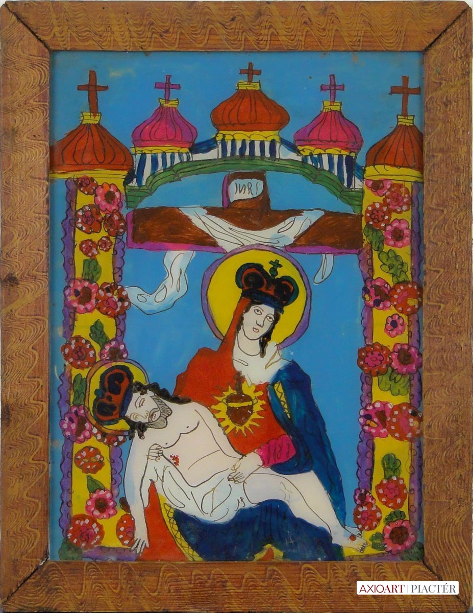 [0E989/023] Színes üveg ikon, hibátlan állapotú, XIX. század vége, szép floderozott keretben. Válogatott, néprajzi gyűjteményből származó anyag. Magasság: 47 cm Szélesség: 36.5 cm Súly: 0.88 kg
