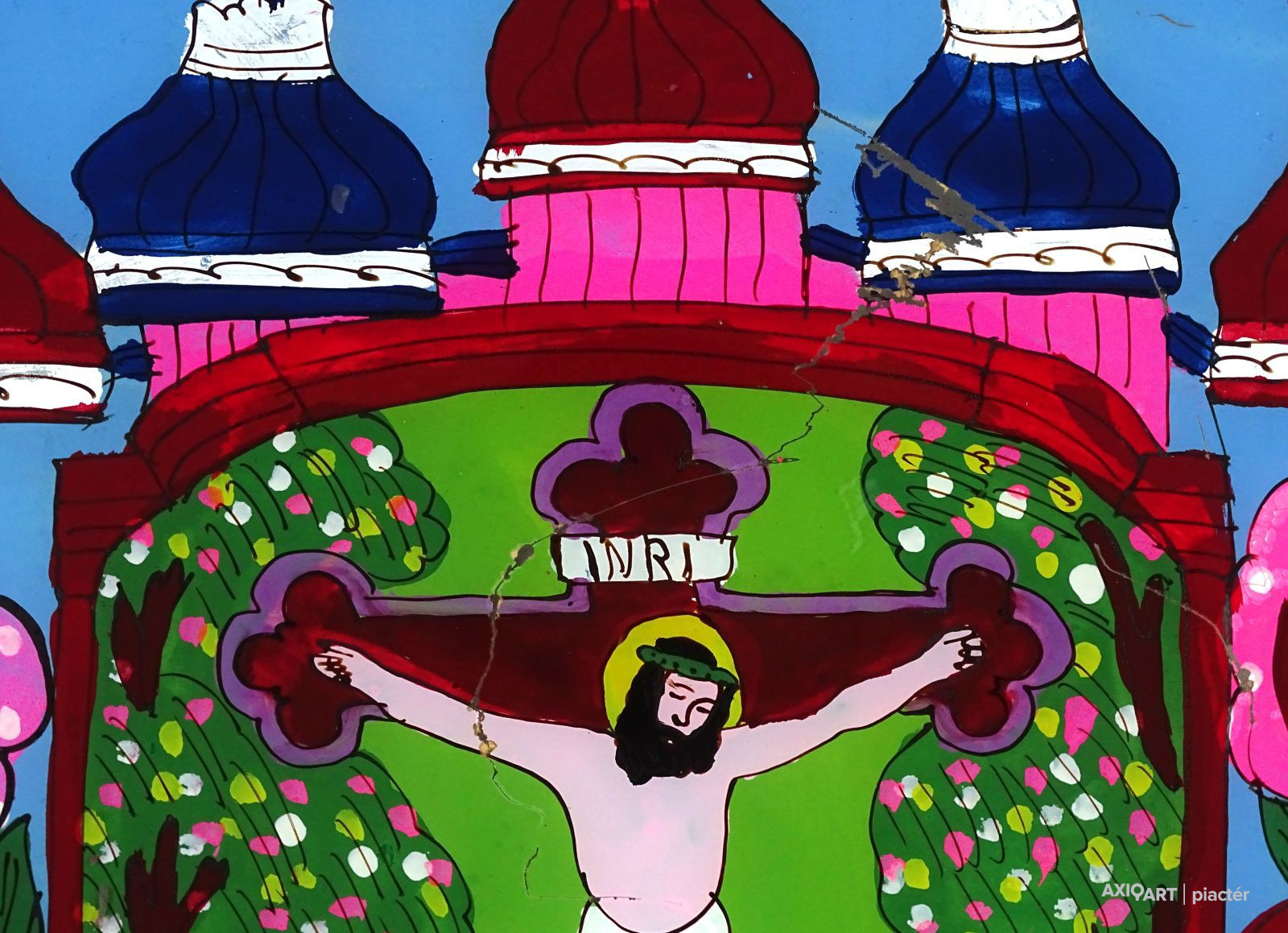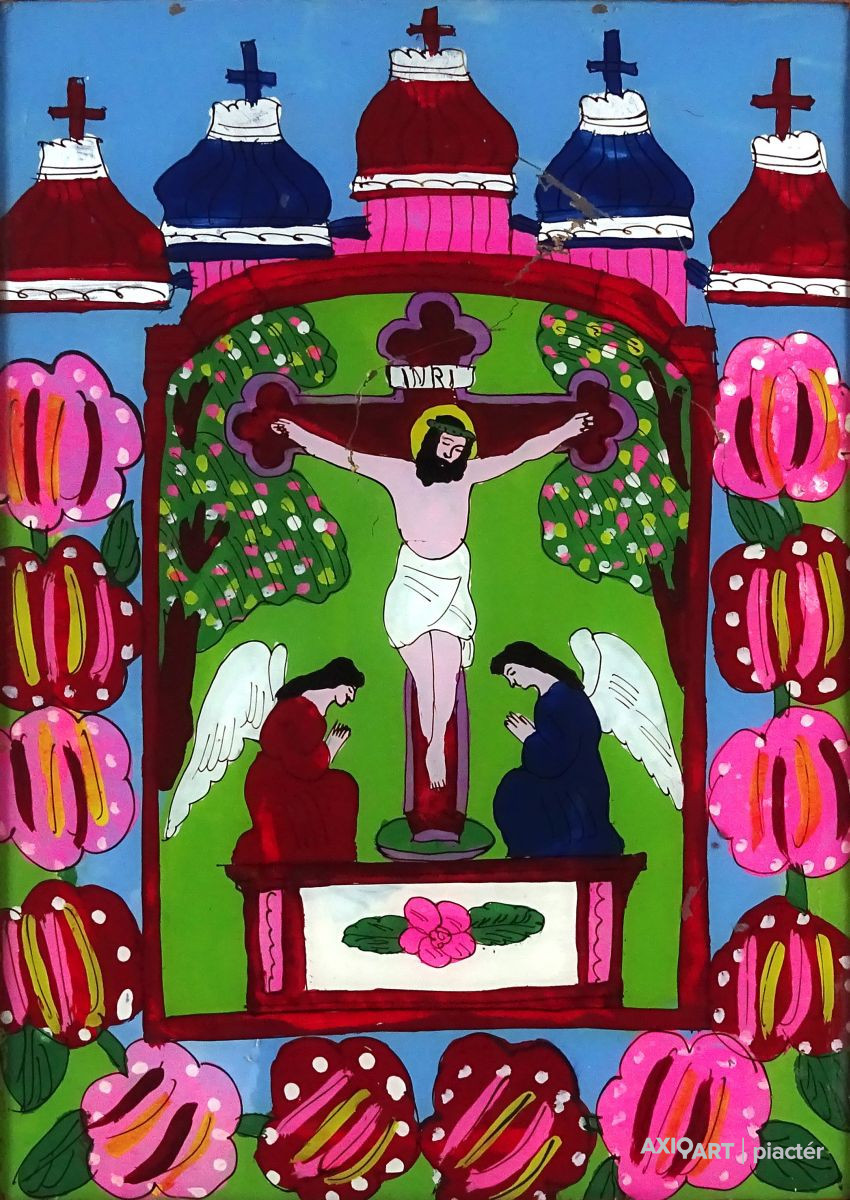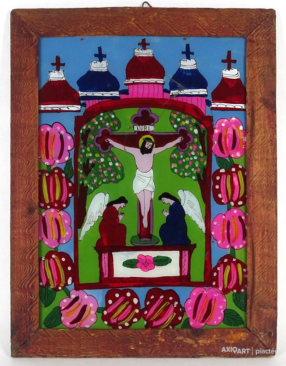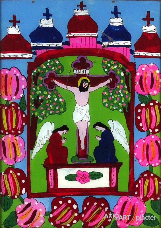 Antik erdélyi üveg ikon Krisztus a kereszten két anyal ábrázolással 46 x 37 cm