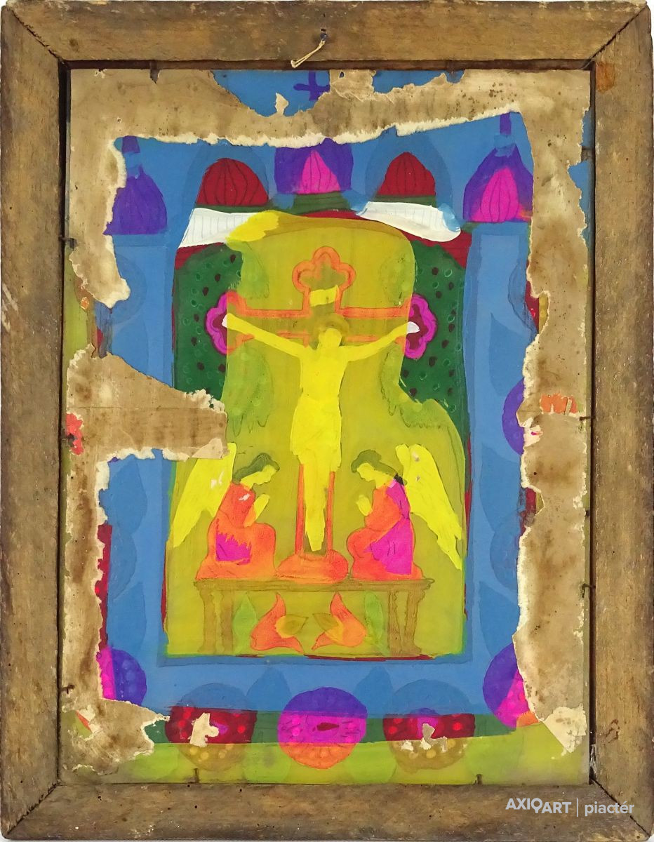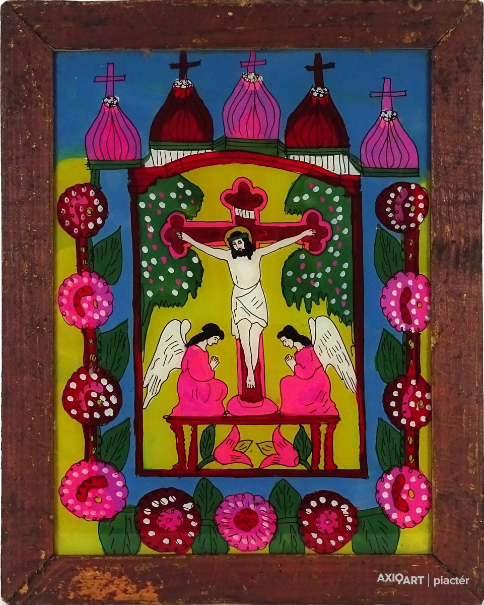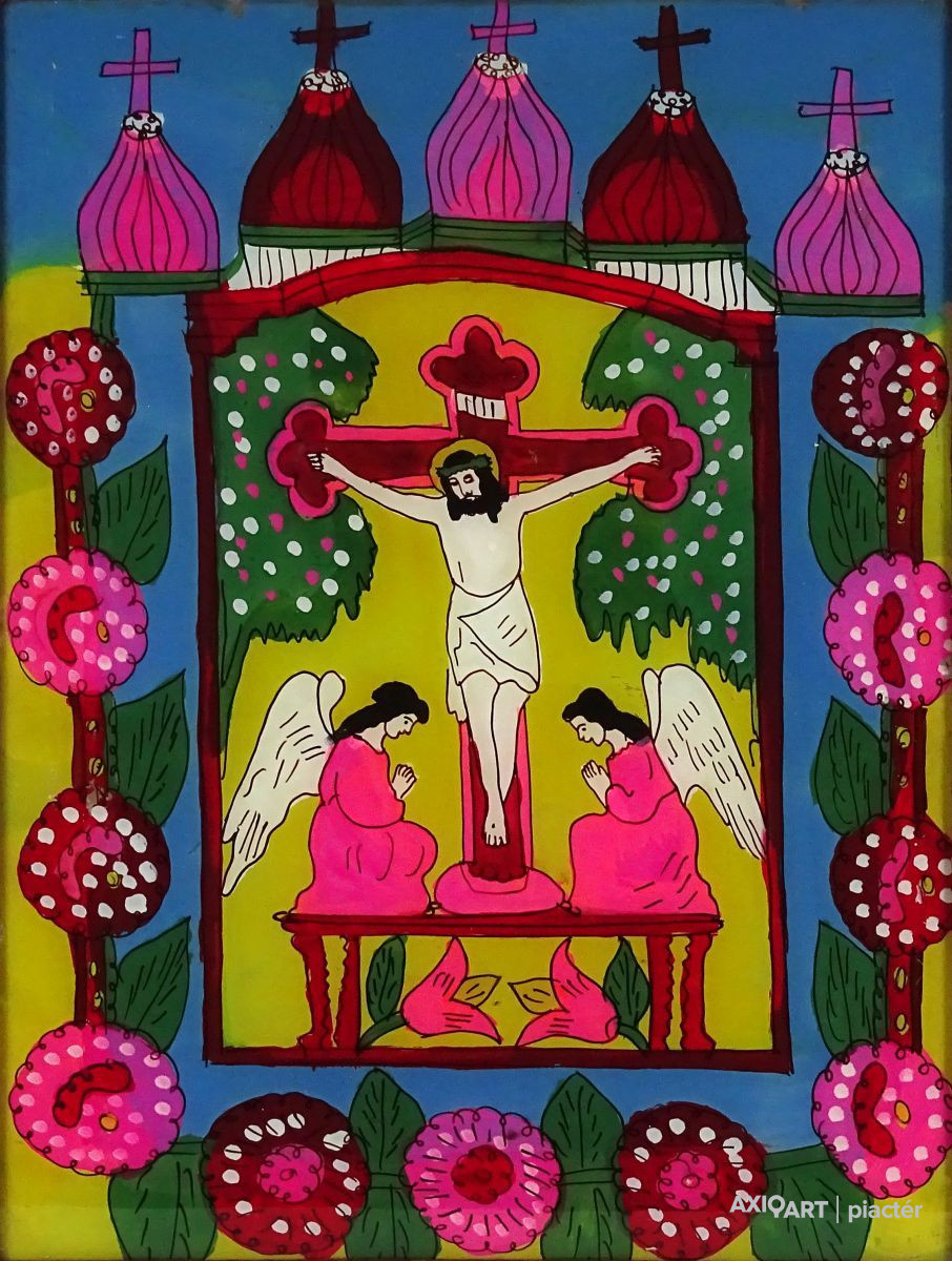 Antik erdélyi üveg ikon Krisztus a kereszten két anyallal ábrázolva 46 x 37 cm