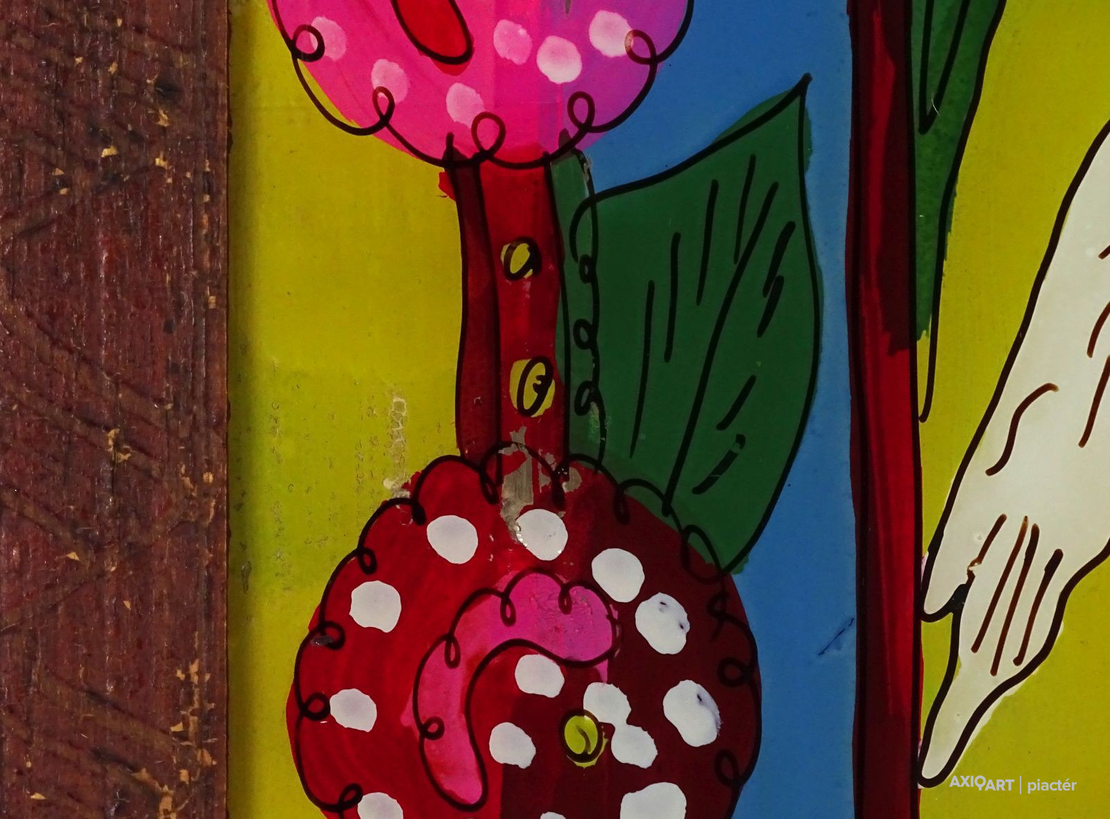 [1Y029/Z018] Olaj farost festmény, üveglap mögött, hibátlan képcsarnokos keretben. Hátoldalán Képcsarnok Vállalat papír címkéje: A művész neve: SCHÉNER MIHÁLY A kép címe: TÁJ Magasság: 66.5 cm Szélesség: 86 cm Súly: 6.54 kg Schéner Mihály festő, grafikus, szobrász, keramikus, bábtervező Medgyesegyháza, 1923-01-9 Elhalálozott: Budapest, 2009. május 11. Honlap: http://www.kormendigaleria.hu/kiadvany.html 1942-1947: Magyar Képzőművészeti Főiskola, tanára: Rudnay Gyula. 1978: Munkácsy-díj; 1984: érdemes művész; 1989: kiváló művész; 1995: Kossuth-díj. 1992-től a Magyar Művészeti Akadémia, 1993-tól a Széchenyi Irodalmi és Művészeti Akadémia tagja. 1956-ig tanított. 1982: Nagyatádi Faszobrász Alkotótelep, 1985: Nemzetközi Acélszobrász Alkotótelep, Dunaújváros. A stílusában felismerhető, mégis sokféle műtárgyat létrehozó ~ gazdag, állandóan alakuló életműve a folyton változó világban helyét kereső, az alkotói szabadságot megvalósító XX. századi képzőművész példázata lehetne. Magát expresszív-szürrealista alkotónak nevezi. Egyaránt dolgozik festékkel, textillel, fával, fémmel. Rajzol, szerkeszt, farag, épít, gyúr, varr és ragaszt, felhasználja a mézesbábok öntőformáit. Festő, rajzoló, textilszobor- és bábkészítő, fazekas, asztalos, esztergályos. Háromlépcsős folyamatban gondolkozik: rajzban tervez, majd fest, szobrot készít, “formába önt”, mindig a végső plasztikai megoldást keresi. Ami állandó és mégis játékosan változékony megjelenésű Schéner művészetében, az a gyermekkori emlékek által meghatározott népi mesterségek iránti tiszteletet kifejező motívumkincs, a tárgyi folklór formakészlete, amely már-már kézjegyként ismétlődik munkáin. Mitologikussá nőtt képzelete új lényeket teremt, pl: a Pigulát, amely disznótestű, emberfejű teremtmény. Schéner festményein a szürrealista motívumokat konstruktív szerkezetbe rendezi, a geometriát és az organikus természeti motívumokat egyaránt beépíti műveibe. A népi, népművészeti formakincsből merített lovas huszárok, betyárok, szegénylegények cifra szűr mentéje, piros csákója, fekete csizmája, az önálló életet élő zsinórdíszek és mézeskalács bábok, a kiskocsik a gyermekkori vásárok, búcsúk színes forgatagába vezet. A primér motívumokat aztán felváltják a vastagon felhordott felületbe karcolt jelek, vonalhálózatok, amelyek a játszó gyermek homokba rajzolt ábráit, a pásztorember fába vésett üzeneteit, az ősember barlang falába rótt mágikus jeleneteit idézik meg. A művész pillanatnyi érdeklődésének megfelelően a színek búvópatakként tűnnek el és jelennek meg ismét. A 60-as években leginkább a formákkal való játék érdekelte, a festmények felülete egyre gazdagodott: a táblaképek felületén applikációk jelentek meg, vagy lemállasztott rétegek hagyták maguk után hiányukat, motívumok nélküli ősformák, archetipikus képzetek bukkantak fel művészetében. A véletlenszerűnek látszó rétegekkel való játék azonban tudatos komponálás eredménye, amely később nyilvánvaló ritmusnak és formai szerkesztettségnek adja át a helyét, mint a Törvénytáblák c. sorozaton. A különböző művészi kifejezési formák egymásra termékenyítő hatással vannak, át- meg áthatják egymást. Textilszobrai, amelyekkel új műfajt teremtett, ugyanazzal az automatikus, expresszív-szürrealista módszerrel készülnek, mint festményei. A hagyományosan a népművészetben alkalmazott anyag, a filc lehetőséget ad a népi formakincs felelevenítésére, amely azonban a művész különös szürrealista átiratában jelenik meg. A szívekkel kivarrt, zsinórdíszes Posztókotlós c. művén mézesbábok lógnak, hátán huszárok lovagolnak. Egész sor textilből készült kéz-plasztikát alkot, amelyeket az ujjakra rávarrt díszekkel öltöztet, személyesít meg. A színes-különös világból aztán ~ újra puritán képi és formai rendbe juttatja el a nézőt, majd nemsokára tépett, gyűrt, vágott, csorgatott, repedezni hagyott szenvedélyesen vonagló képi felületeket hagy hátra. Schéner készített apró gyermekjátékokat, térstruktúra-tereket, mászókákat is. A magyar népi formák mellett szürreális játékaiban gyakran alkalmaz görög mitológiai alakokat, “elkentaurosodott” lovakat, Gorgó-fejeket, sellőket, hárpiákat, Pán-ábrázolásokat. Schéner nemcsak saját művészetéről publikál, hanem művésztársairól is számos írása jelenik meg, elsősorban az Új Auróra c. folyóiratban, amelynek egy ideig főmunkatársa volt. Irodalom kiállítása, Magyar Építőművészet, 1962/4. Húsz év után, Művészet, 1965/4. BOZÓKY M.: ~, Tiszatáj, 1968/5. PERNECZKY G.: Nincs uborkaszezon, Élet és Irodalom, 1969. augusztus 8. BARÁNSZKY-JÓB L.: ~, Művészet, 1969/9. LÁSZLÓ GY.: ~ kaposvári kiállítása, Jelenkor, 1969/4. MAJOR M.: Pásztorok, betyárok, huszárok - kezek, Tükör, 1970. szeptember 15. FRANK J.: Bemutatjuk ~t, Élet és Irodalom, 1972. május 6. ról kiállítása ürügyén, Képzőművészeti Almanach, Budapest, 1972 Sötétkék kokasok, Élet és Irodalom, 1973. szeptember 9. MAJOR M.: ~ játékai, Élet és Irodalom, 1974. július 27. BARTA J.: Egy különös művész, Alföld, 1974/6. VADAS J.: Szárnykészítők, Élet és Irodalom, 1975. október 4. JUHÁSZ F.: A halál ellen játszani, Élet és Irodalom, 1975. május 17. PAP G.: Kincsek és műkincsek, Művészet, 1975/6. P. SZŰCS J.: Az utak kettéválnak, Művészet, 1978/3. Békési művészet, Művészet, 1978/7. SZAMOSI F.: ~ [kismonográfia], Budapest, 1978 VADAS J.: Játék a játékkal, Élet és Irodalom, 1979. augusztus 18. NÉMETH L.: ~ műveiről, Művészet, 1979/4. MIKLÓS P.: Mit akar ez a múzeum?, Művésze