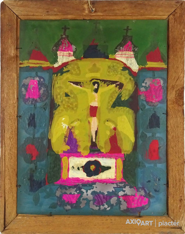 Antik erdélyi üveg ikon Krisztus a kereszten két anyallal ábrázolva 47 x 37 cm