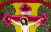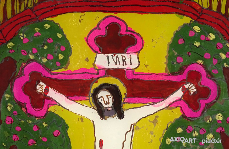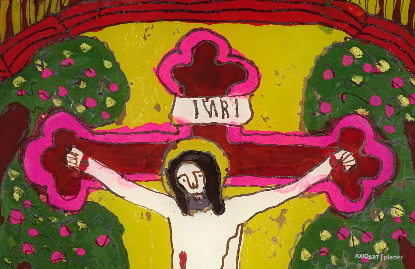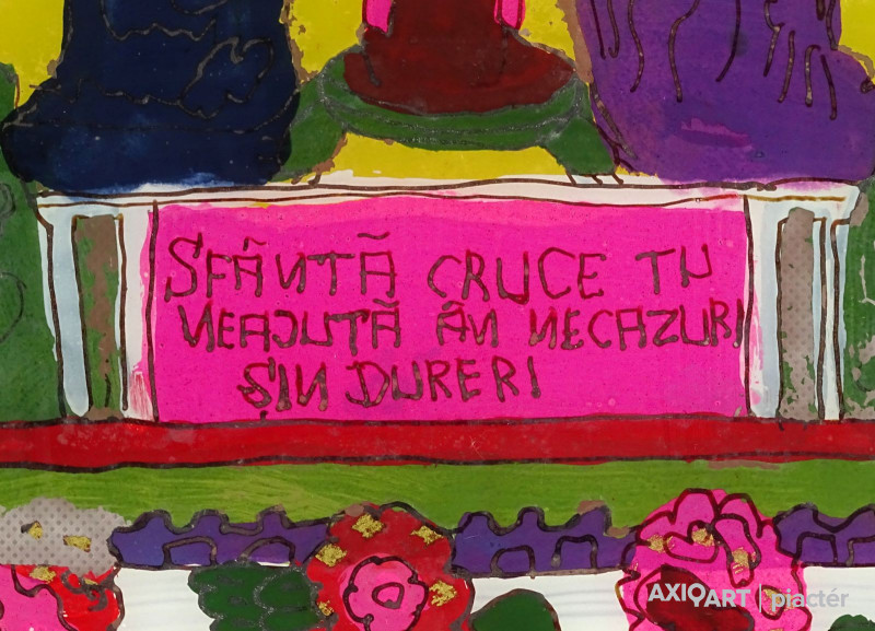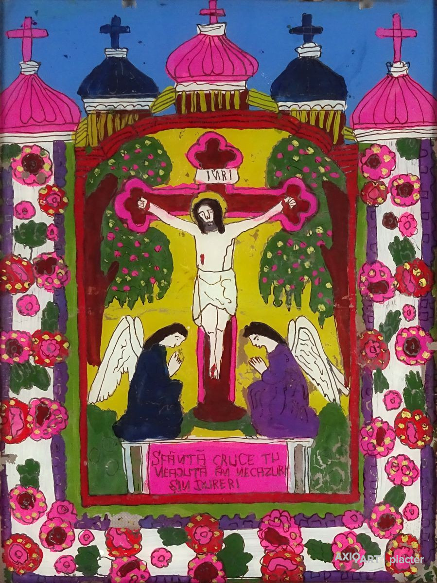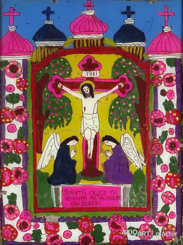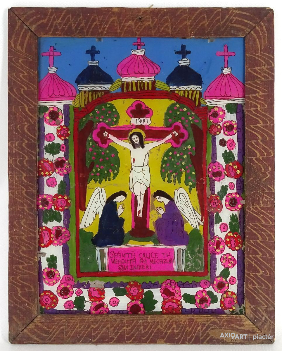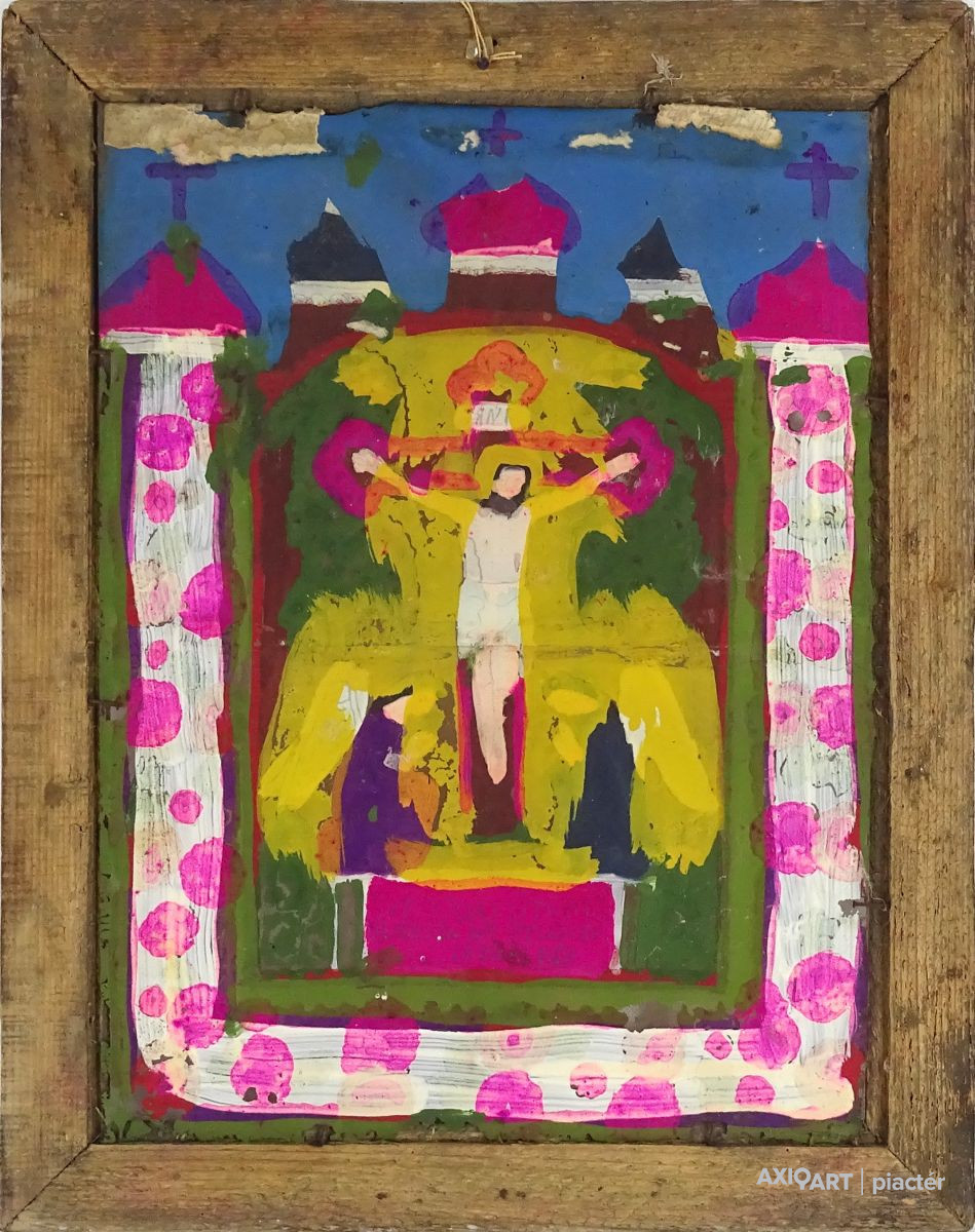 [1K399/007] Színes kézzel festett üveg ikon a XIX. század végéről. Válogatott, néprajzi gyűjteményből származó anyag. Magasság: 47 cm Szélesség: 37 cm Súly: 0.79 kg
