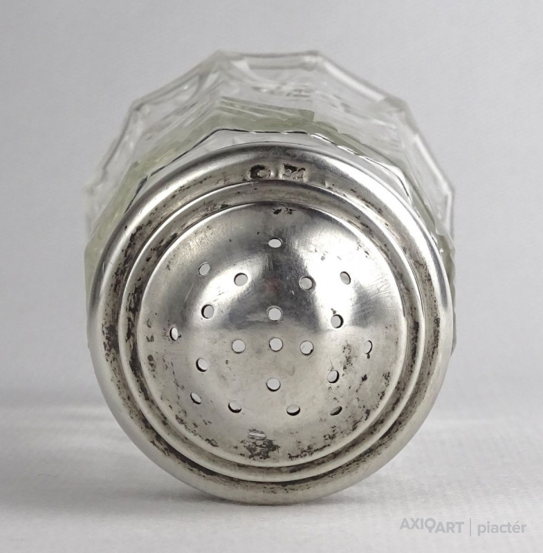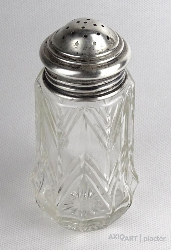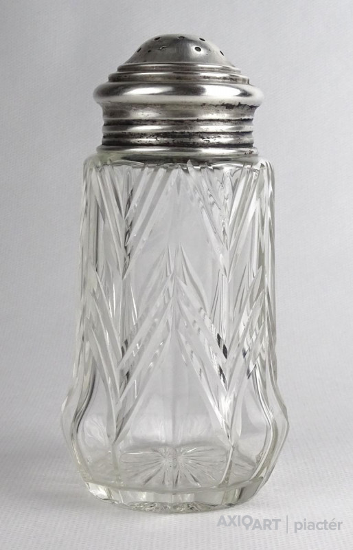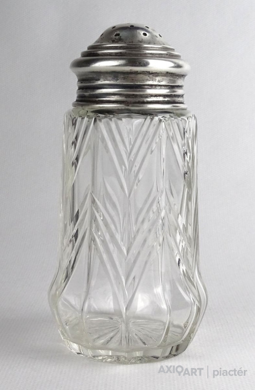 Antik nagy méretű ezüst fejes cukortartó, cukorszóró, fűszertartó. Az ezüst kupakon 800-as finomságú agárfejes ezüst jelzés található mesterjegy mellett.
