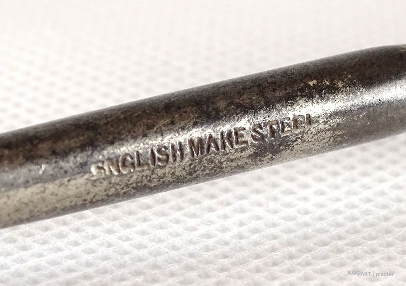 [1A937/IRODA] Antik ezüstözött cipőgomboló eszköz a XIX. századból. Jelzések, feliratok: ENGLISH MAKE STEEL Súly: 0.04 kg Cipőgomboló – 19. századi alapeszköz Ma már azt sem igen tudjuk mire való ez a fura, kampós végű valami, de régen trendi kellék volt. A viktoriánus időszak sokgombos világában nélkülözhetetlen tárgy lett. És volt külön ruha-, kesztyű- valamint gallérgomboló is. A viktoriánus kor vonzódott az innováció minden formájához, ezért akkoriban ezerféle apró kütyüt terveztek az élet megkönnyítésére és a kifinomultság jelzésére (bár, ha meggondoljuk, ez ma is pont így van). Ilyen gadget volt a cipőgomboló is, ami mindennapos háztartási kellék lett. A legkorábbi írásos említés 1611-ből való, elmagyarázza, hogy a gomboló olyan eszköz, amellyel a gombot át lehet húzni a gomblyukon. Használata nem lett általános, de a 17. és 18. században a felső osztálybeliek azért használtak ilyent, díszes volt, és természetesen aranyból, ezüstből, egyéb drága anyagokból készítették. A cipőgomboló akkor terjedt el lavinaszerűen Európában, amikor az 1880-as években a magas szárú, gombos női cipők jöttek divatba. A 19. század második felében a puha bőrcipőket váltották fel a merev bőrből készült, erős tartású darabok, amelyek ráadásul közvetlenül követték a láb vonalát, hogy kihangsúlyozzák a bokát (még a selyembrokátból készültek is szorosak voltak). A gomblyukkészítéshez ekkor már gépet alkalmaztak, semmi akadálya sem volt hát, hogy sok apró gombbal záródjanak a divatos lábbelik, de ezeket kézzel kínszenvedés volt begombolni, így a gomboló hamar népszerű lett.   Meg kell jegyezni, hogy türelmetlen használat esetén az eszköz inkább kárt okozott, mint hasznot: kiszakította a gombot, vagy feltépte a gomblyukat, de ez a néha előforduló kellemetlenség nem akadályozta meg, hogy trendi személyes tárggyá váljon. Itt már nem az arisztokrácia szeszélyéről beszélünk, a középosztálybeliek is tömegesen használták. Állandóan maguknál tartották, utazáshoz is nélkülözhetetlennek tekintették. Mérete szerint többnyire akkora volt, mint egy villa, de a nyele lehetett akár 60 cm hosszú is. Ezt a hosszú változatot a kövér nők (akik ugye a fölös hájréteg miatt nem tudtak lehajolni a cipőjükig) gombolójának csúfolták, pedig csak kényelmesebbé tette a műveletet. Egyáltalán nem kellett egyébként kövérnek lenni, elég volt egy jó szoros fűző, és máris elérhetetlen távolságba került a cipő. Persze férfiak és gyerekek is használták a cipőgombolót. Ők is magas szárú cipőben jártak, plusz bokavédőt (kamásli) vagy lábszárvédőt is viseltek, amit szintén be kellett gombolni. Gyakori volt a két egységből – cipőkanál és gomboló – álló kombó. A nyeleket sokszor elefántcsontból, gyöngyházból vagy ezüstből készítették, és ki is díszítették, egyénivé tették. A gyerekeknek színes, játékos, főként állatfejes nyéllel készíttették a cipőgombolót. De miért voltak olyan aprócska eszközök is, amikkel biztosan nem lehetett cipőt gombolni? A sokgombos világban, a ruhák és a hosszú kesztyűk is rengeteg gombbal záródtak. Nem volt egyszerű begombolni a merev, keményített férfi inggallérokat és mandzsettákat sem. Az utóbbiakhoz főként hurok végződésű gallérgombolókat alkalmaztak. Ez a helyes példány például achát nyéllel készült. Némelyik kis gomboló végére karikát is erősítettek, hogy a hölgyek övláncukra, övükre vagy nyakláncukra fűzhessék. Divatos volt az összehajtható gomboló is. A fénykép rátétes darabokat pedig szívesen adták ajándékba. Az első világháború sok mindent megváltoztatott. A férfiak katonáskodása idején a nők tömegesen dolgozni kezdtek, viseletük átalakult: a szalonban ücsörgéshez tökéletes ruházat a munkához nem volt praktikus, másmilyen, egyszerűbb darabokat hordtak, kevesebb gombbal. De a harctéren a lövészárok-hadviselés által állóháborúra kényszerített, egy helyben rostokoló katonák között a cipőgomboló népszerű maradt. Sok tárgyat készítettek szabad idejükben a helyben hozzáférhető eszközökből, köztük a töltényhüvely nyelű gomboló divatos tárgynak számított. Hazaküldték szuvenírként az otthon maradt feleségnek, kedvesnek. Gombos kesztyű, gombos magas szárú cipő (főleg gyerekeknek, mert úgy tartották, erősíti a bokát) és gombos kamásli persze még a háború után is volt, de egyre kevesebb. Az 1920-as évekre aztán a divat elfordult a sokgombos, magas szárú női cipőktől, a divathölgyek csatos vagy maximum egy gombos lábbeliben ropták a charlestont. A cipzár elterjedése pedig végleg megpecsételte a cipőgomboló sorsát.      Forrás: https://trendmano.blog.hu/2015/12/07/cipogombolo_19_szazadi_alapeszkoz