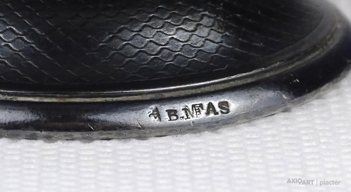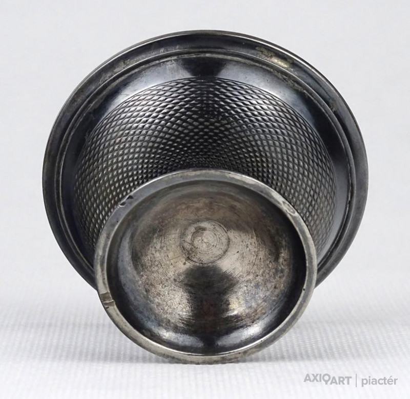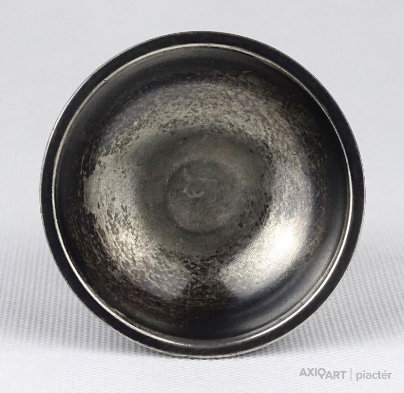 [1J067/X164] Antik, szép állapotú, patinás ezüstözött csésze, kis méretű kehely. A talp peremén beütött jelzés: BMF AS Magasság: 4 cm Szélesség: 7 cm Súly: 0.065 kg