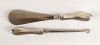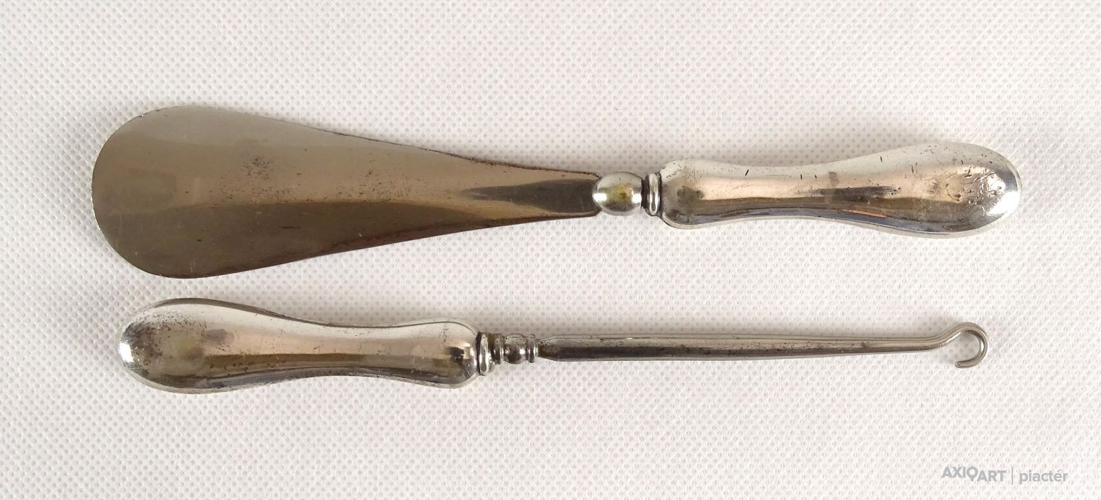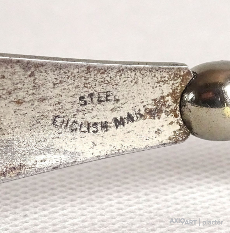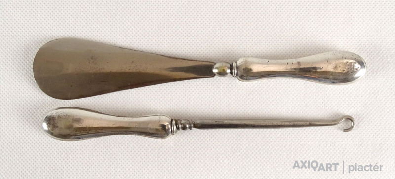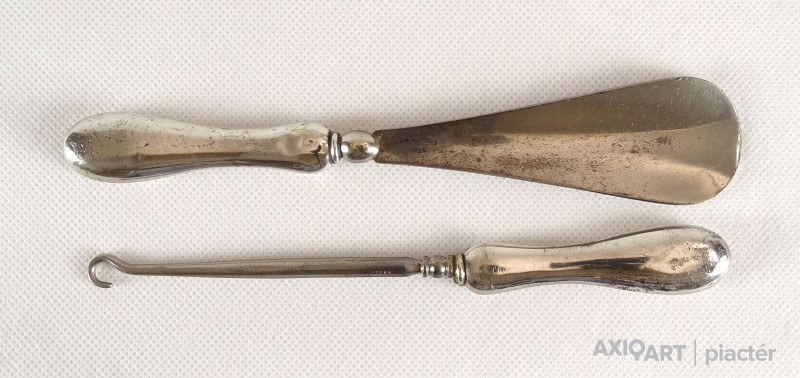 [1A927/IRODA] Gyönyörű antik ezüstözött fejű eszközök. Angol eszközök XIX. századból. Jelzések, feliratok: STEEL ENGLISH MAKE Súly: 0.075 kg Cipőgomboló – 19. századi alapeszköz Ma már azt sem igen tudjuk mire való ez a fura, kampós végű valami, de régen trendi kellék volt. A viktoriánus időszak sokgombos világában nélkülözhetetlen tárgy lett. És volt külön ruha-, kesztyű- valamint gallérgomboló is. A viktoriánus kor vonzódott az innováció minden formájához, ezért akkoriban ezerféle apró kütyüt terveztek az élet megkönnyítésére és a kifinomultság jelzésére (bár, ha meggondoljuk, ez ma is pont így van). Ilyen gadget volt a cipőgomboló is, ami mindennapos háztartási kellék lett. A legkorábbi írásos említés 1611-ből való, elmagyarázza, hogy a gomboló olyan eszköz, amellyel a gombot át lehet húzni a gomblyukon. Használata nem lett általános, de a 17. és 18. században a felső osztálybeliek azért használtak ilyent, díszes volt, és természetesen aranyból, ezüstből, egyéb drága anyagokból készítették. A cipőgomboló akkor terjedt el lavinaszerűen Európában, amikor az 1880-as években a magas szárú, gombos női cipők jöttek divatba. A 19. század második felében a puha bőrcipőket váltották fel a merev bőrből készült, erős tartású darabok, amelyek ráadásul közvetlenül követték a láb vonalát, hogy kihangsúlyozzák a bokát (még a selyembrokátból készültek is szorosak voltak). A gomblyukkészítéshez ekkor már gépet alkalmaztak, semmi akadálya sem volt hát, hogy sok apró gombbal záródjanak a divatos lábbelik, de ezeket kézzel kínszenvedés volt begombolni, így a gomboló hamar népszerű lett.   Meg kell jegyezni, hogy türelmetlen használat esetén az eszköz inkább kárt okozott, mint hasznot: kiszakította a gombot, vagy feltépte a gomblyukat, de ez a néha előforduló kellemetlenség nem akadályozta meg, hogy trendi személyes tárggyá váljon. Itt már nem az arisztokrácia szeszélyéről beszélünk, a középosztálybeliek is tömegesen használták. Állandóan maguknál tartották, utazáshoz is nélkülözhetetlennek tekintették. Mérete szerint többnyire akkora volt, mint egy villa, de a nyele lehetett akár 60 cm hosszú is. Ezt a hosszú változatot a kövér nők (akik ugye a fölös hájréteg miatt nem tudtak lehajolni a cipőjükig) gombolójának csúfolták, pedig csak kényelmesebbé tette a műveletet. Egyáltalán nem kellett egyébként kövérnek lenni, elég volt egy jó szoros fűző, és máris elérhetetlen távolságba került a cipő. Persze férfiak és gyerekek is használták a cipőgombolót. Ők is magas szárú cipőben jártak, plusz bokavédőt (kamásli) vagy lábszárvédőt is viseltek, amit szintén be kellett gombolni. Gyakori volt a két egységből – cipőkanál és gomboló – álló kombó. A nyeleket sokszor elefántcsontból, gyöngyházból vagy ezüstből készítették, és ki is díszítették, egyénivé tették. A gyerekeknek színes, játékos, főként állatfejes nyéllel készíttették a cipőgombolót. De miért voltak olyan aprócska eszközök is, amikkel biztosan nem lehetett cipőt gombolni? A sokgombos világban, a ruhák és a hosszú kesztyűk is rengeteg gombbal záródtak. Nem volt egyszerű begombolni a merev, keményített férfi inggallérokat és mandzsettákat sem. Az utóbbiakhoz főként hurok végződésű gallérgombolókat alkalmaztak. Ez a helyes példány például achát nyéllel készült. Némelyik kis gomboló végére karikát is erősítettek, hogy a hölgyek övláncukra, övükre vagy nyakláncukra fűzhessék. Divatos volt az összehajtható gomboló is. A fénykép rátétes darabokat pedig szívesen adták ajándékba. Az első világháború sok mindent megváltoztatott. A férfiak katonáskodása idején a nők tömegesen dolgozni kezdtek, viseletük átalakult: a szalonban ücsörgéshez tökéletes ruházat a munkához nem volt praktikus, másmilyen, egyszerűbb darabokat hordtak, kevesebb gombbal. De a harctéren a lövészárok-hadviselés által állóháborúra kényszerített, egy helyben rostokoló katonák között a cipőgomboló népszerű maradt. Sok tárgyat készítettek szabad idejükben a helyben hozzáférhető eszközökből, köztük a töltényhüvely nyelű gomboló divatos tárgynak számított. Hazaküldték szuvenírként az otthon maradt feleségnek, kedvesnek. Gombos kesztyű, gombos magas szárú cipő (főleg gyerekeknek, mert úgy tartották, erősíti a bokát) és gombos kamásli persze még a háború után is volt, de egyre kevesebb. Az 1920-as évekre aztán a divat elfordult a sokgombos, magas szárú női cipőktől, a divathölgyek csatos vagy maximum egy gombos lábbeliben ropták a charlestont. A cipzár elterjedése pedig végleg megpecsételte a cipőgomboló sorsát.      Forrás: https://trendmano.blog.hu/2015/12/07/cipogombolo_19_szazadi_alapeszkoz