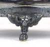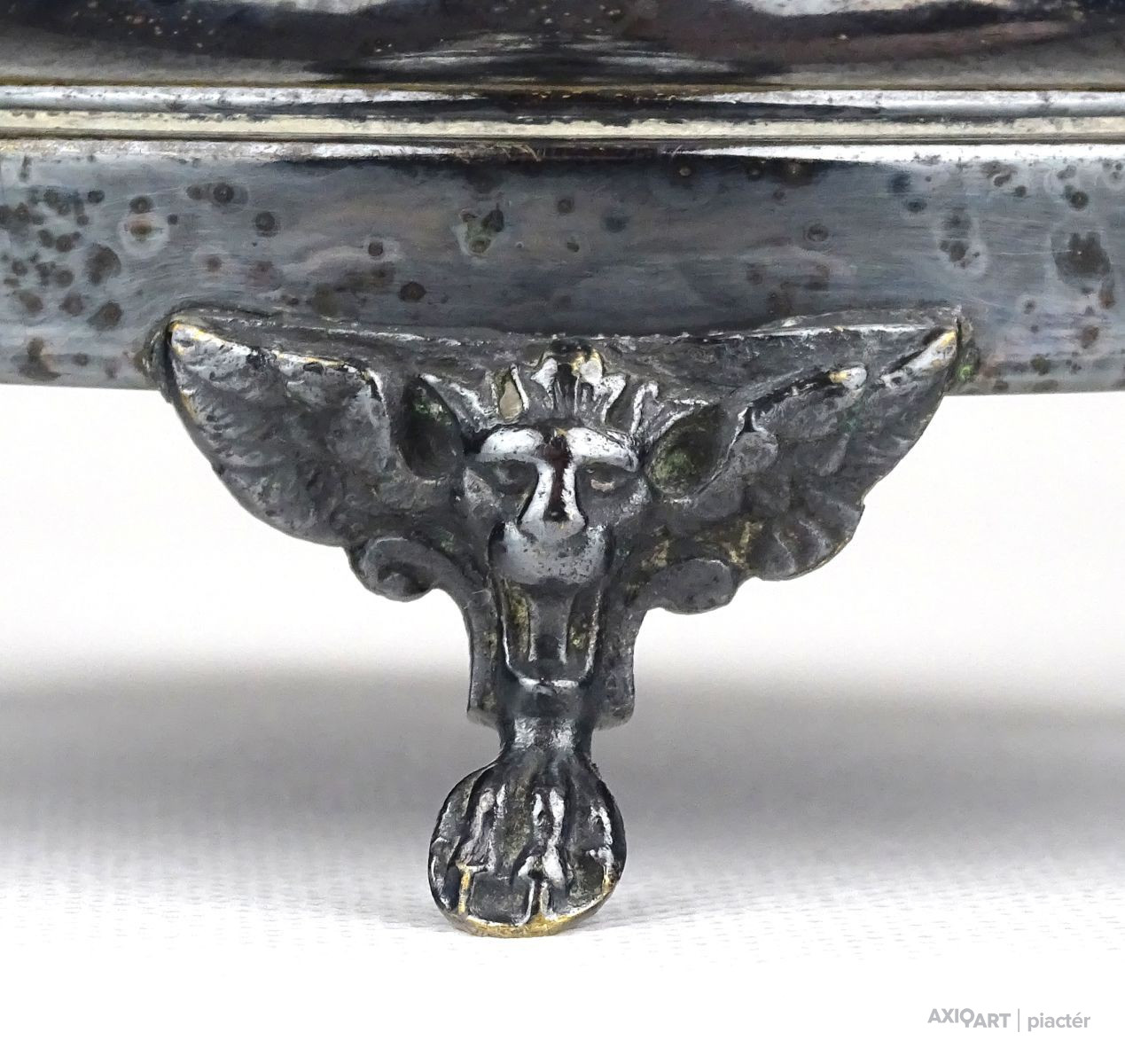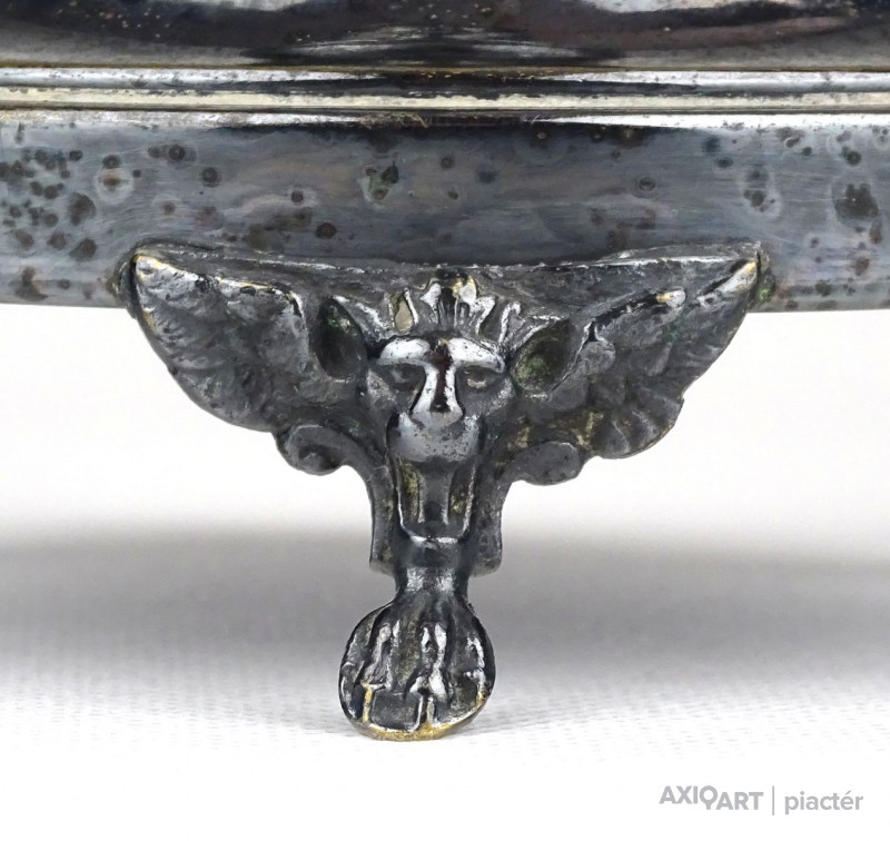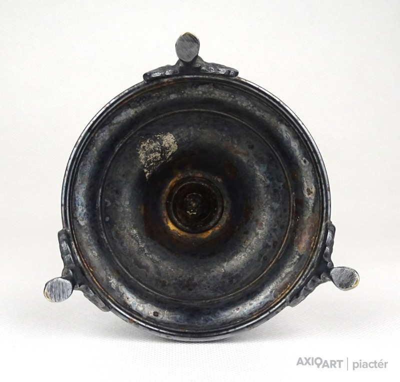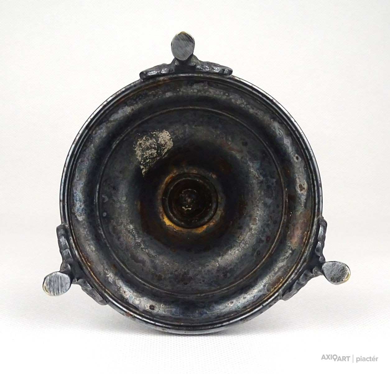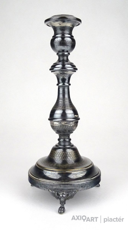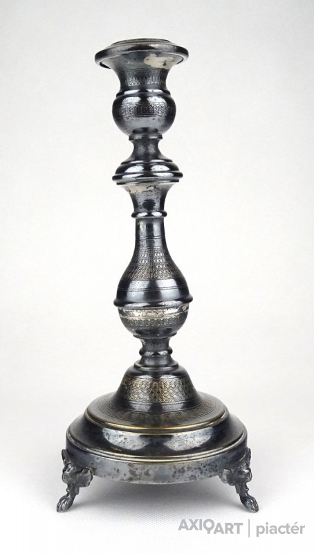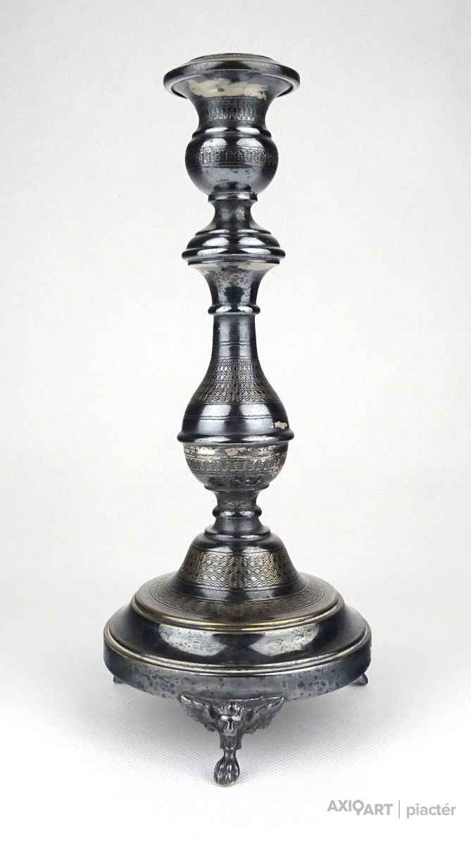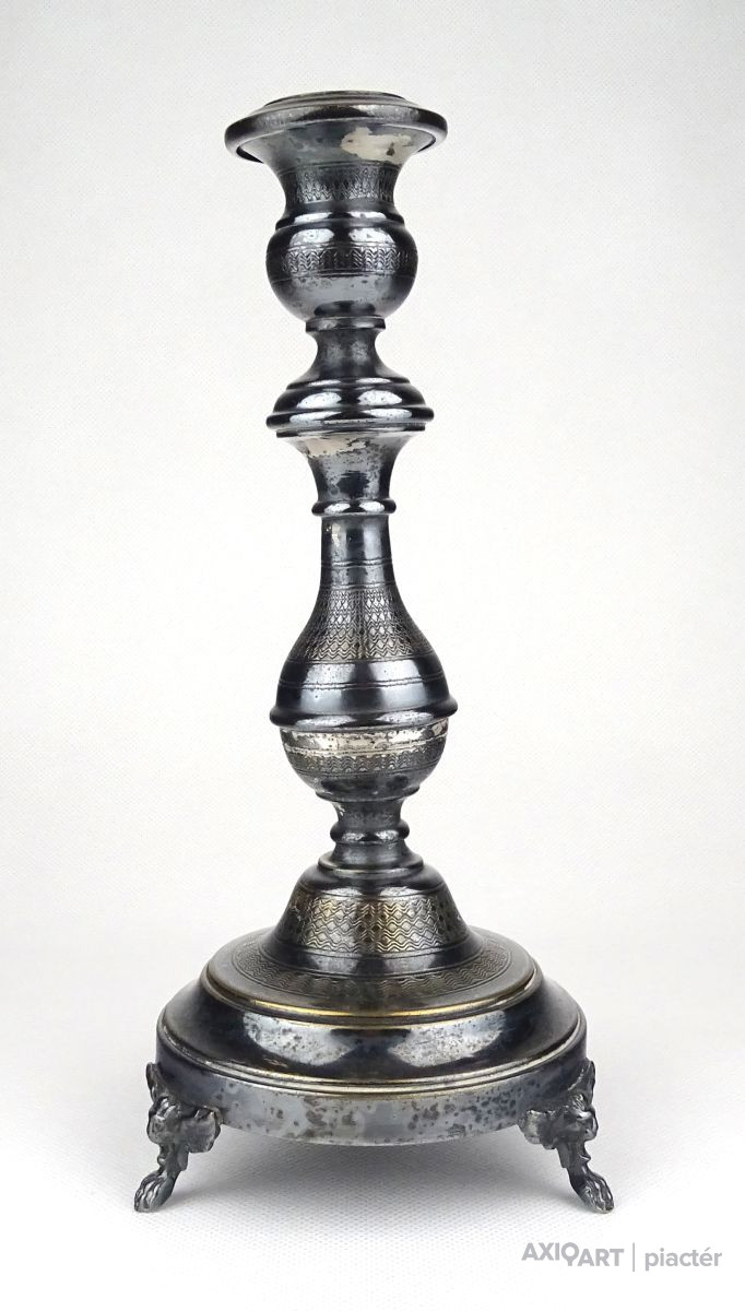 Antik jelzett, három lábon álló, patinás, ezüstözött gyertyatartó.