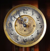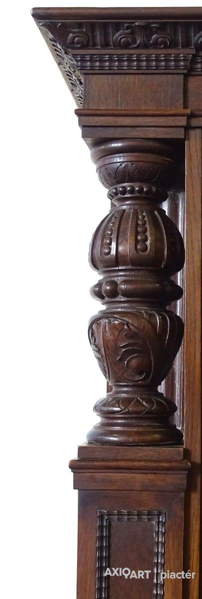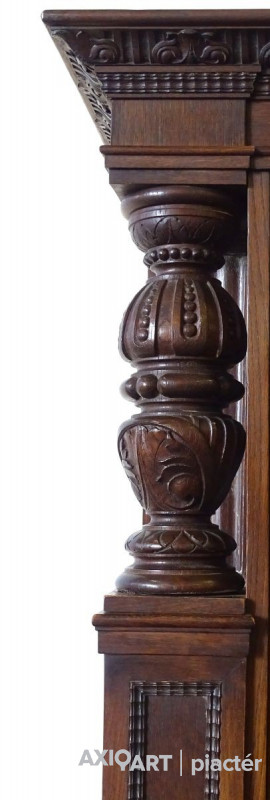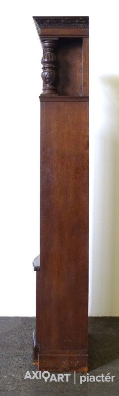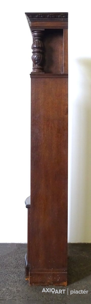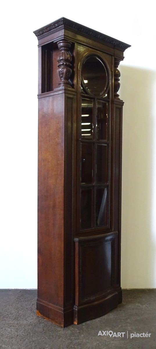 [1B660/UZ-K] Régi, működő állapotban lévő három súlyos, három kulcsos másodpercmutatós óraszerkezettel rendelkező negyedütős állóóra. Faragott oszlopos díszítésű. Üvege metszett, csiszolt. Az óra teljesen hiánytalan, felhúzó kulcsa is megvan. Alsó részén kisebb furnérhibák találhatók. Jelzés: GB Magasság: 213 cm Szélesség: 75 cm