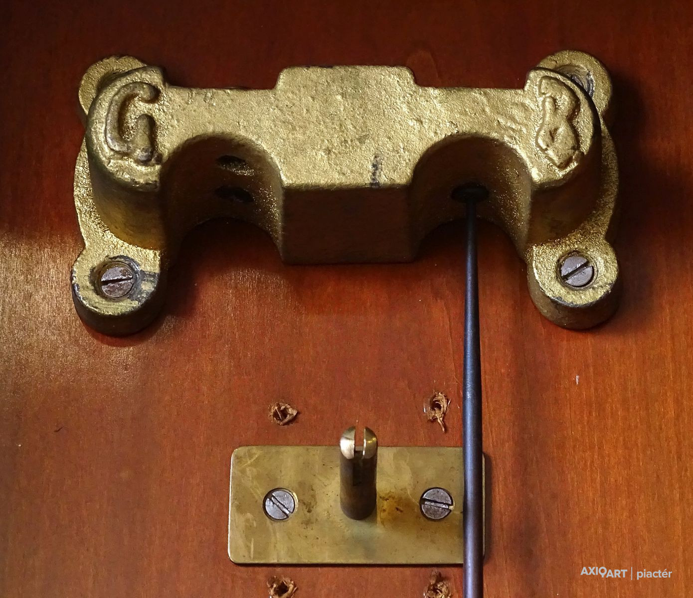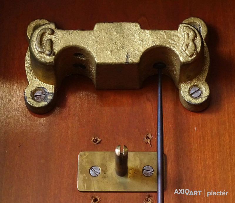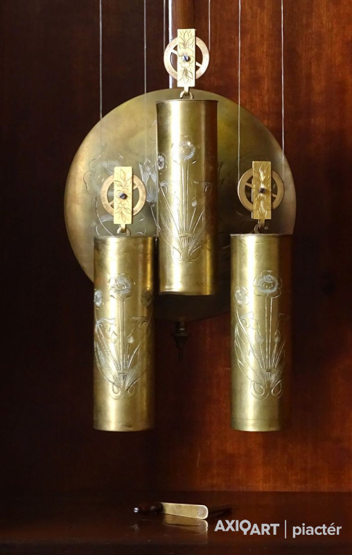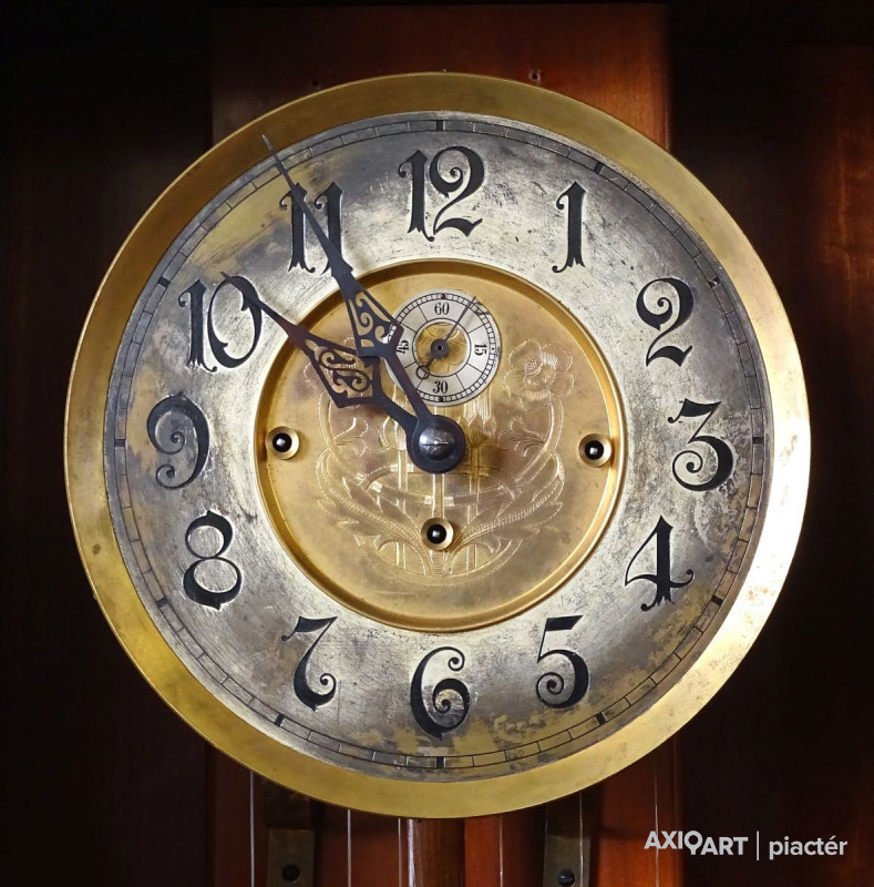 Régi, működő állapotban lévő három súlyos, három kulcsos másodpercmutatós óraszerkezettel rendelkező negyedütős állóóra. Faragott oszlopos díszítésű. Üvege metszett, csiszolt. Az óra teljesen hiánytalan, felhúzó kulcsa is megvan. Alsó részén kisebb furnérhibák találhatók.