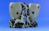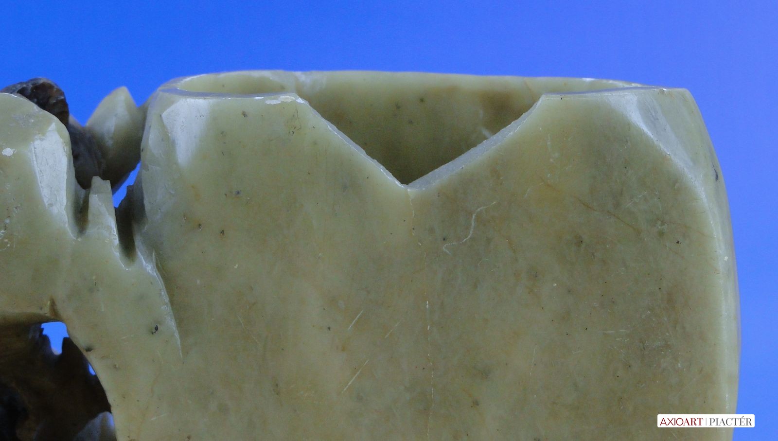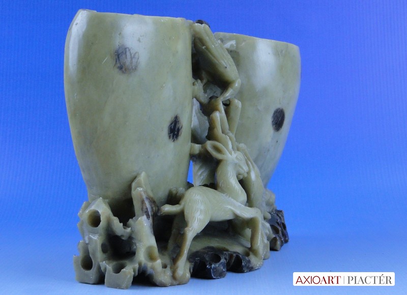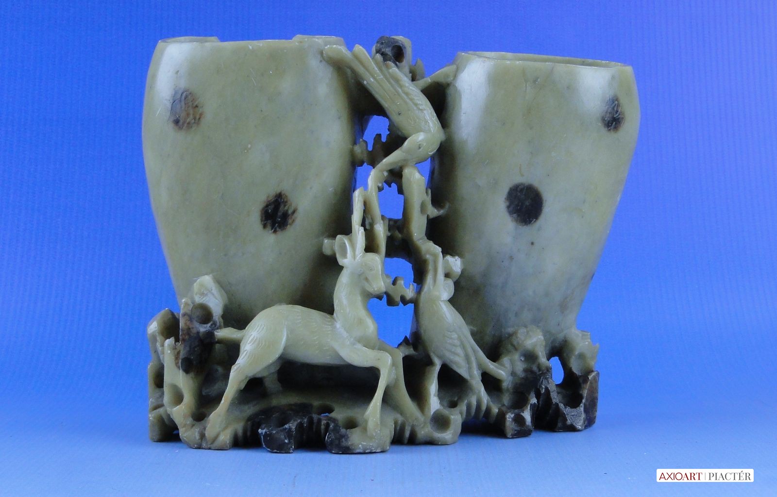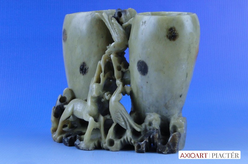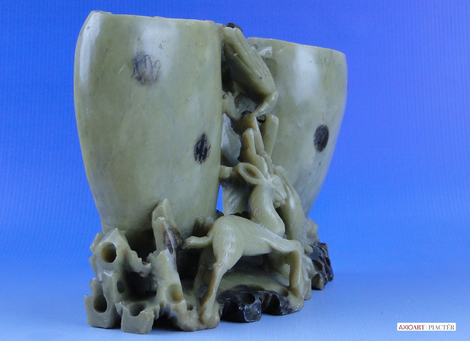[0D662/BX-2] Cca. 100 éves korú, dúsan faragott antik zsírkő kettes virágtartó váza dísztárgy. Rendkívüli, extra, gyűjteménybe való állatos zsírkő faragvány. Szarvas és több madár, paradicsommadár látható rajta. A bal oldali váza peremén sérülés látható, lásd: fotó. Magasság: 12.5 cm Szélesség: 16 cm Súly: 0.897 kg