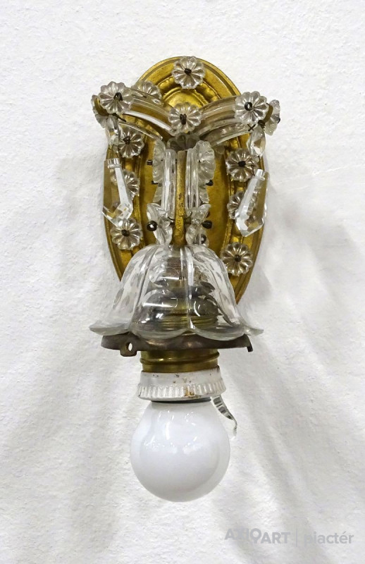 Antik, dupla karos papírmasé gyertyákban végződő kisméretű foglalattal rendelkező, falra akasztással rendelkező fali kar. Aranyozása kopottas.