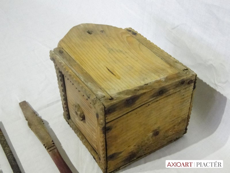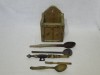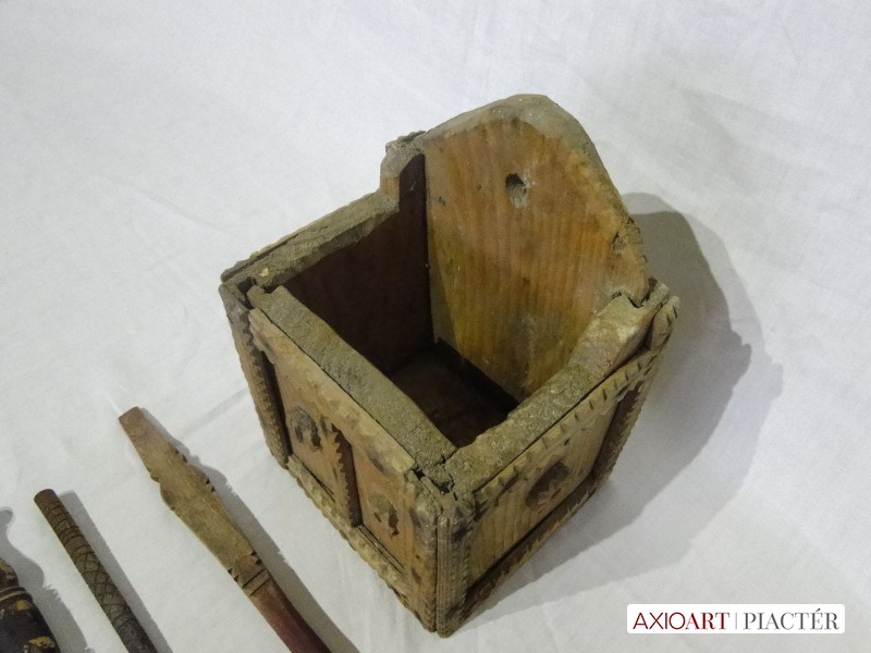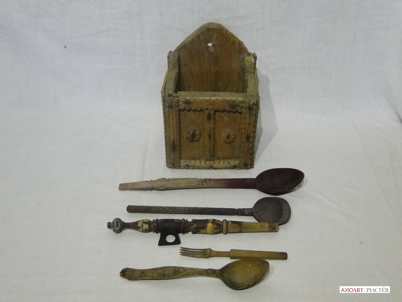 [6118/UZ-N] Nagyon ritka, gyűjteménybe való darab. Alföldi, valószínűleg Békés megyei fa faragott falra akasztható kanáltartó. Benne 5 darab faragott kanál, villa és egyéb konyhai eszközök. A benne lévő kanalak nyelei faragottak, díszesek. Egyiken hal minta, egy faragott nyelű fakanál, szintén faragott villa és egy ismeretlen konyhai eszköz. Szép, néprajzi gyűjteménybe való készlet. Súly: 1.1 kg A falitéka magassága 24 cm, szélessége 14 cm, hossza 17 cm. A legnagyobb kanál hossza 33 cm. A legkisebb villa hossza 16 cm.