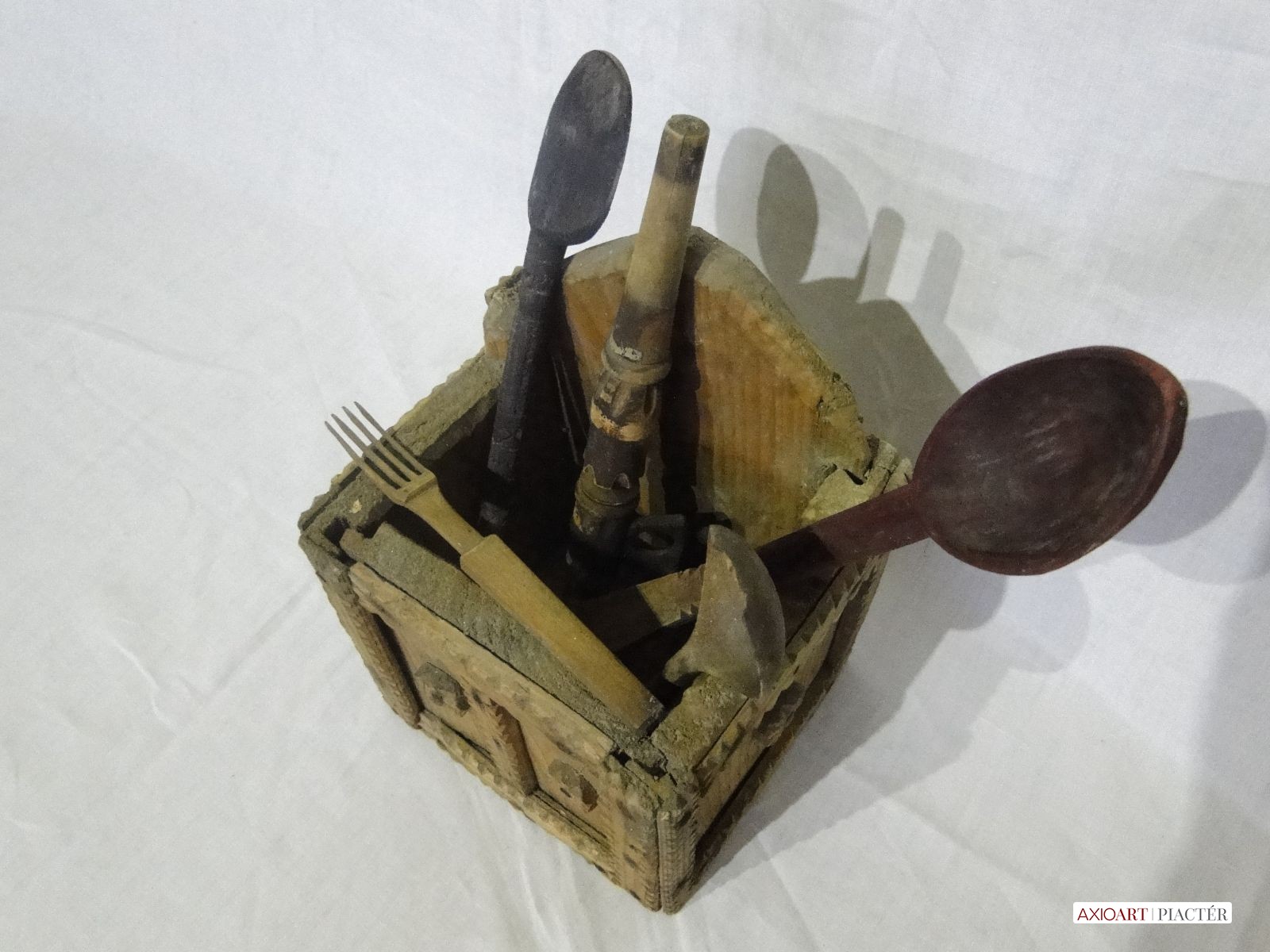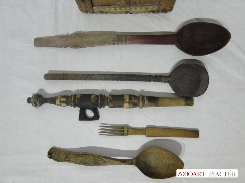 A benne lévő kanalak nyelei faragottak, díszesek. Egyiken hal minta, egy faragott nyelű fakanál, szintén faragott villa és egy ismeretlen konyhai eszköz.