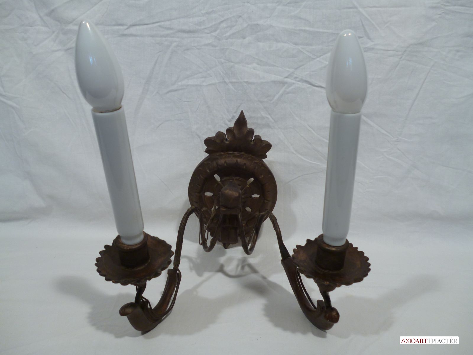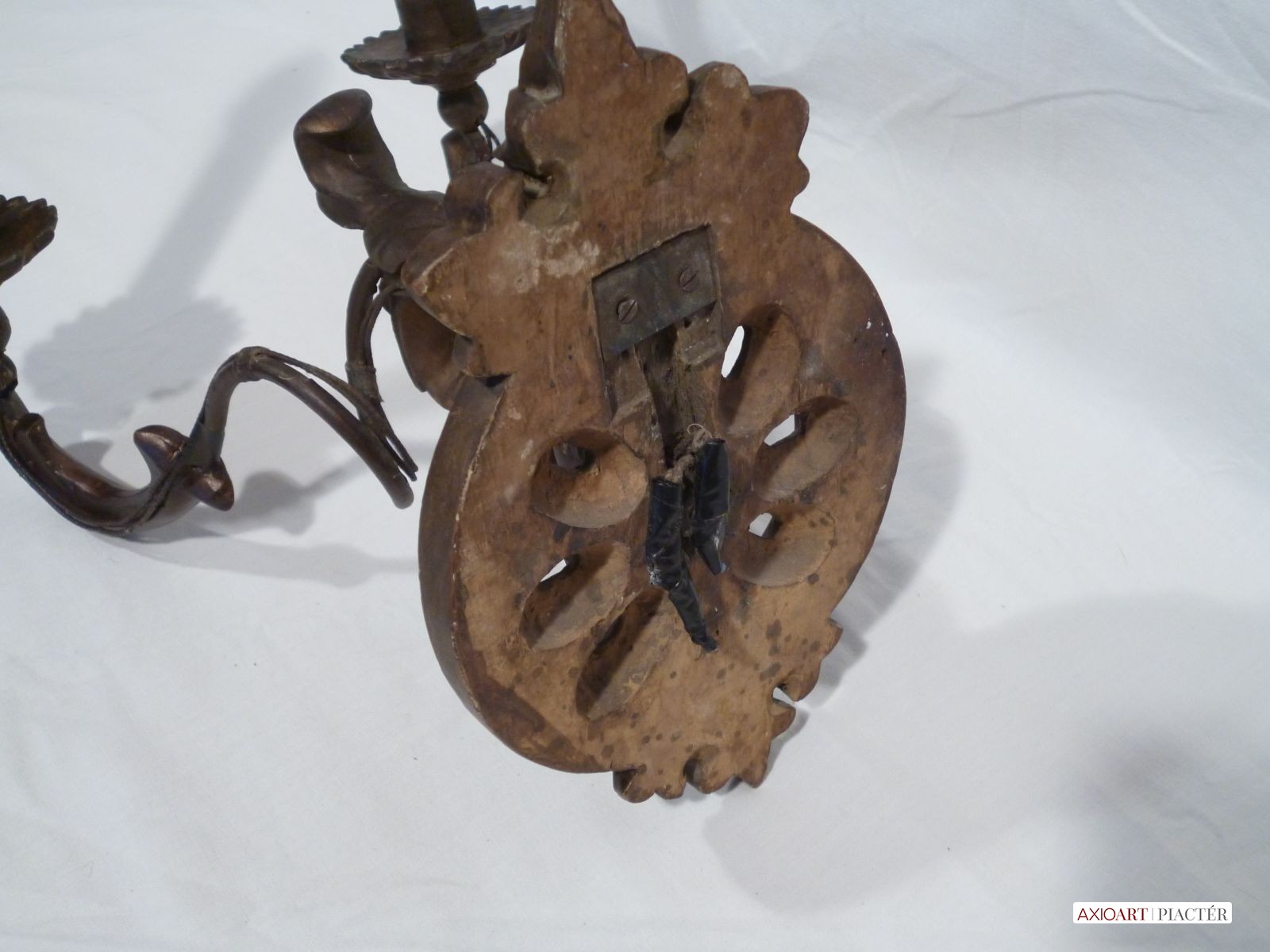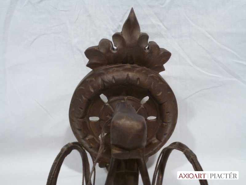 [3480/X040] Antik bevezetékelt faragott fa, 2 égős falikar. Szép állapotú, bronzirozott fa. Szélesség: 27 cm Hosszúság: 30 cm Súly: 0.712 kg Falra felfekvő rész magassága 25 cm.