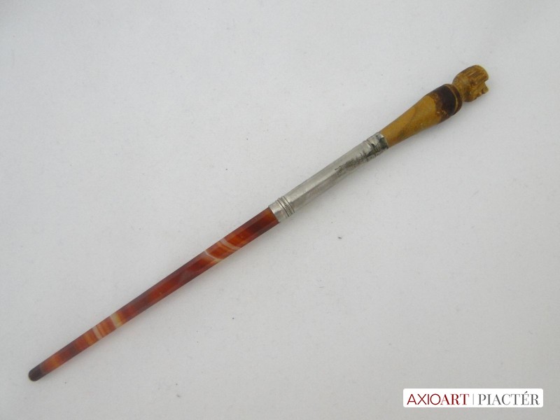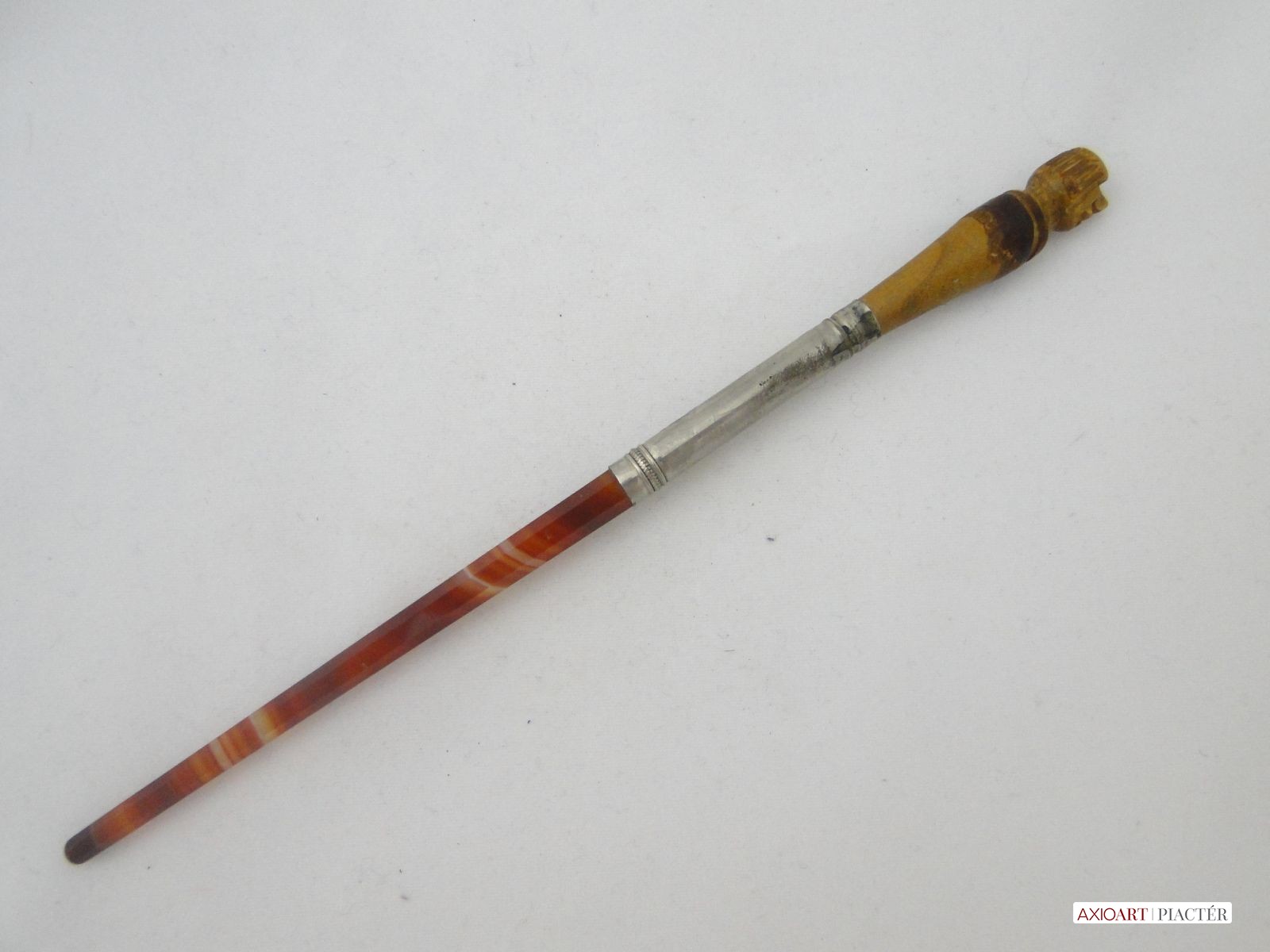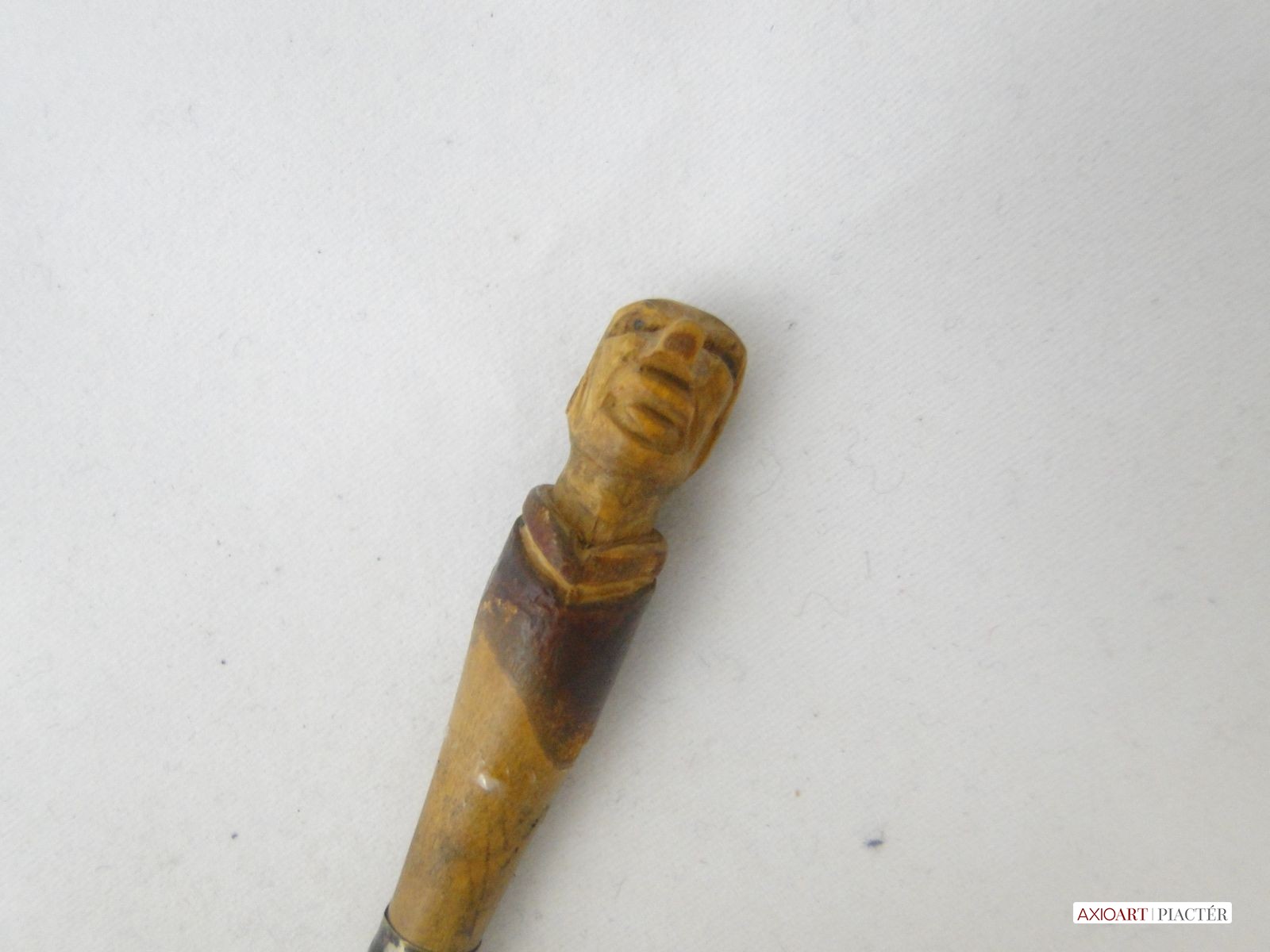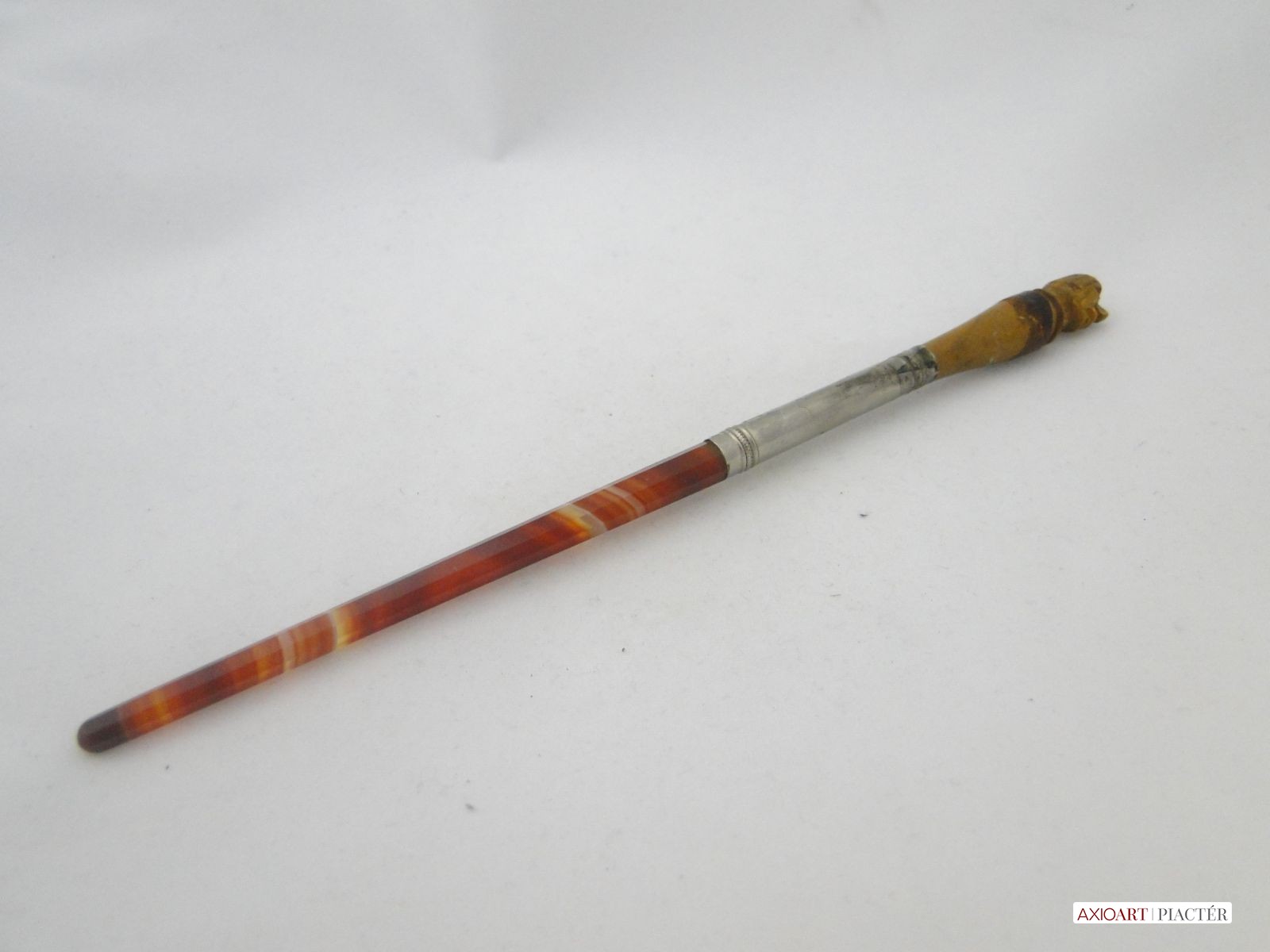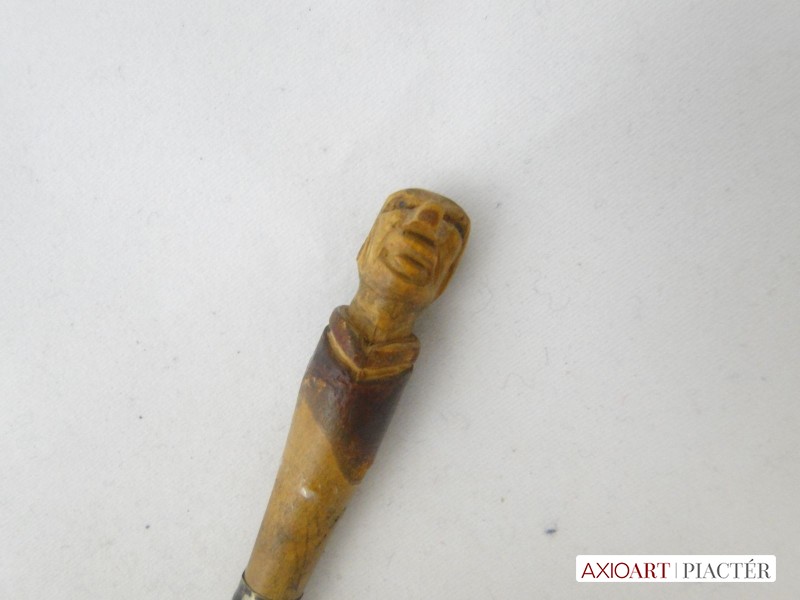 [5699/X024/7] Gyönyörű hibátlan állapotú faragott emberfejes, fából készült rézfoglalatos kisméretű antik, nagyon régi töltőceruza, grafit ceruza borostyán jellegű sok lapra csiszolt díszes üveg, hidegkő foglalatban. A töltőceruza ma is működőképes. Hosszúság: 18 cm Súly: 0.011 kg