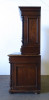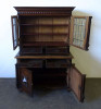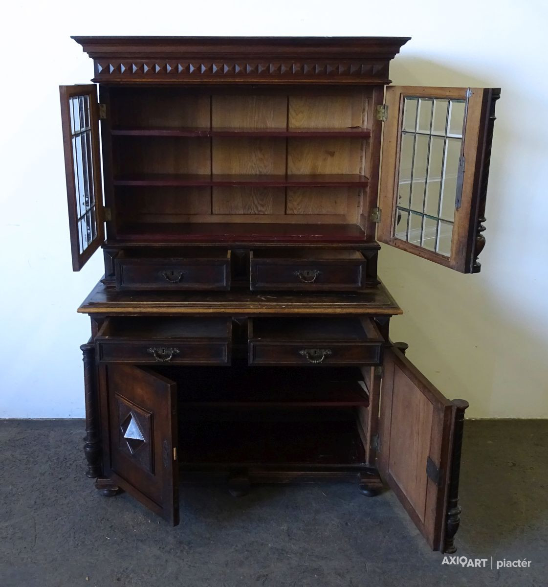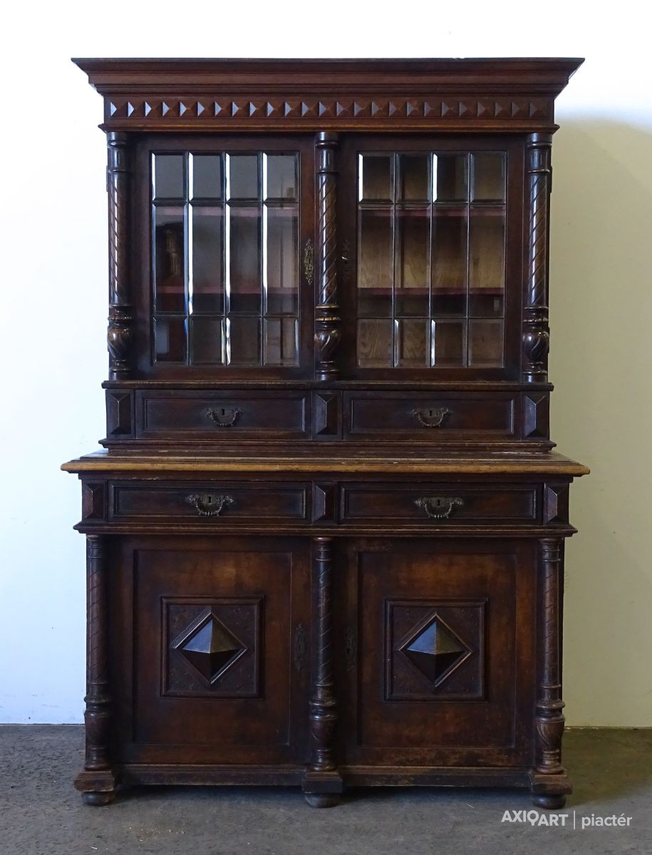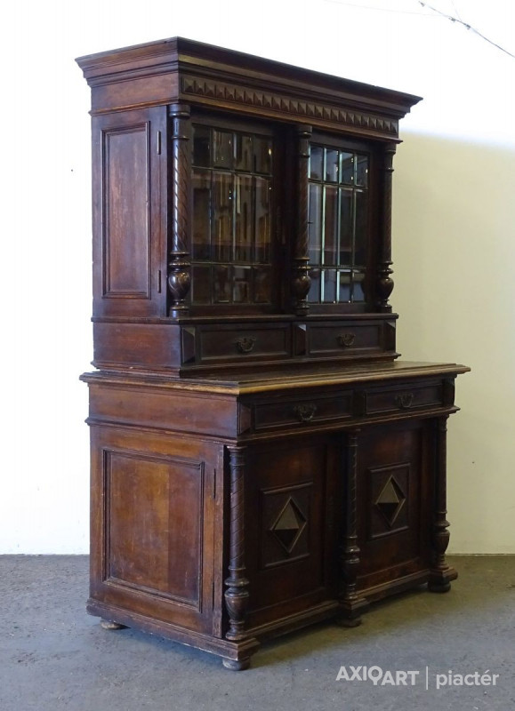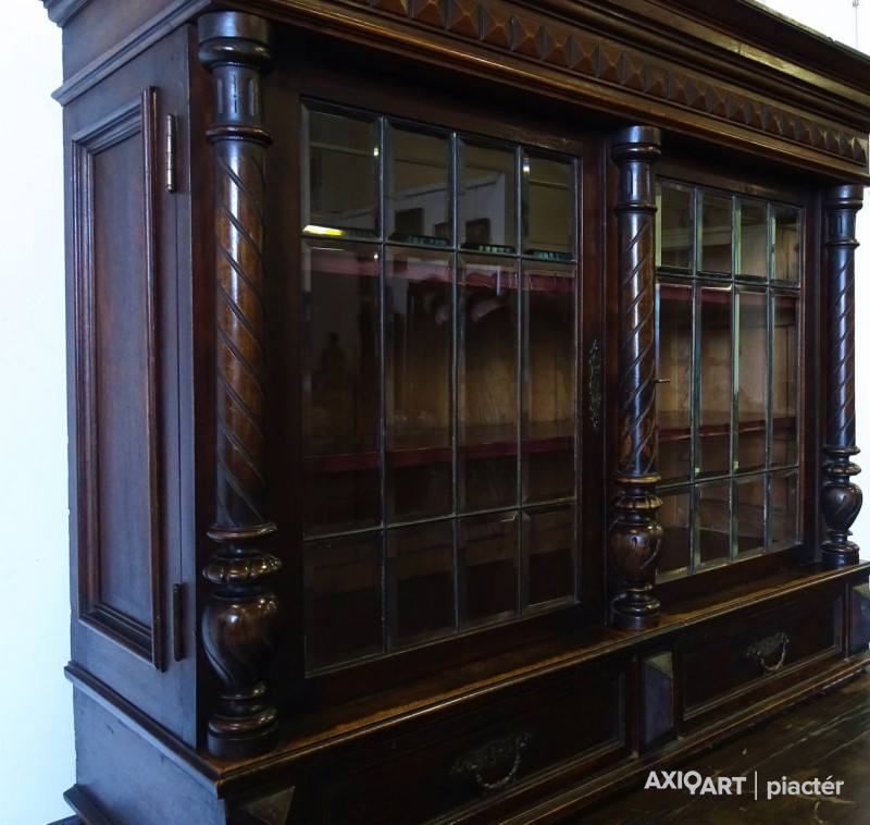 [1R270/UZ-K] Antik, dúsan faragott, flamand stílusú, oszlopos tálaló szekrény az 1800-as évek végéről. Réz veretei egységesek. Felső része faragott három oszlopos, két ajtajában összesen 24 darab hibátlan állapotú vastag, metszett üveg található. összesen négy fiókkal rendelkezik a szekrény. Felső része levehető a kétajtós alsó részről. Szép, veretes állapotú darab. Magasság: 190 cm Szélesség: 130 cm