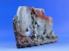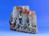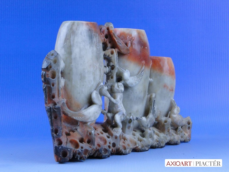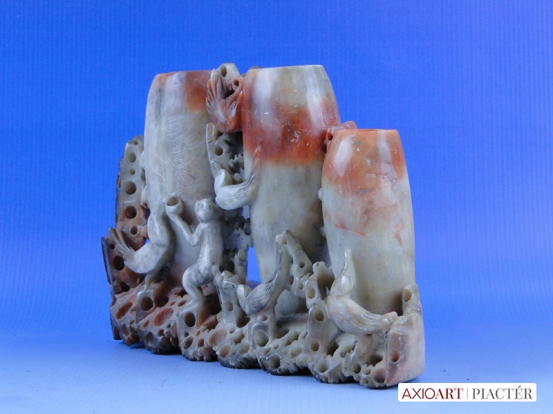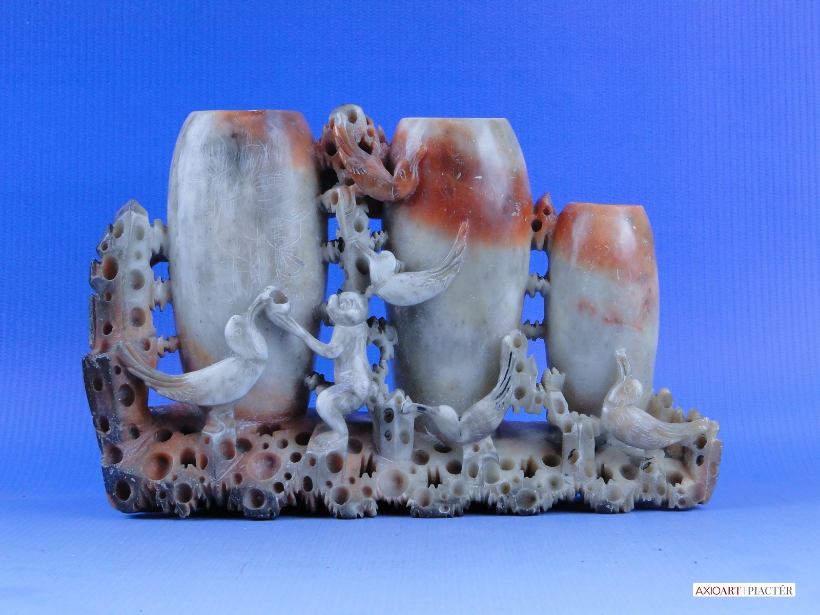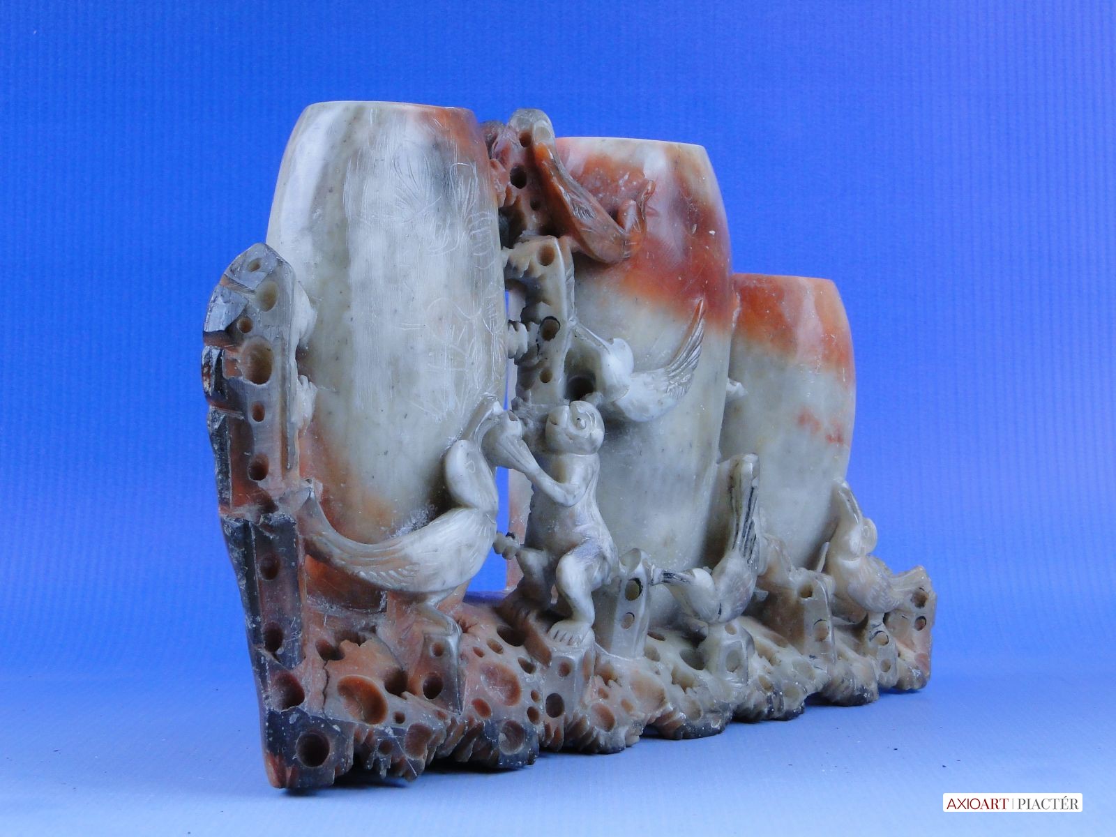 [0D661/BX-2] Cca. 100 éves korú, dúsan faragott antik zsírkő hármas virágtartó váza dísztárgy. Rendkívüli, extra, gyűjteménybe való állatos zsírkő faragvány. Majom és több madár, paradicsommadár látható rajta. Magasság: 12.5 cm Szélesség: 20 cm Súly: 0.932 kg