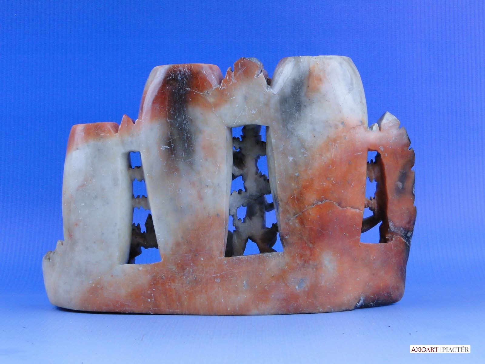 Cca. 100 éves korú, dúsan faragott antik zsírkő hármas virágtartó váza dísztárgy.