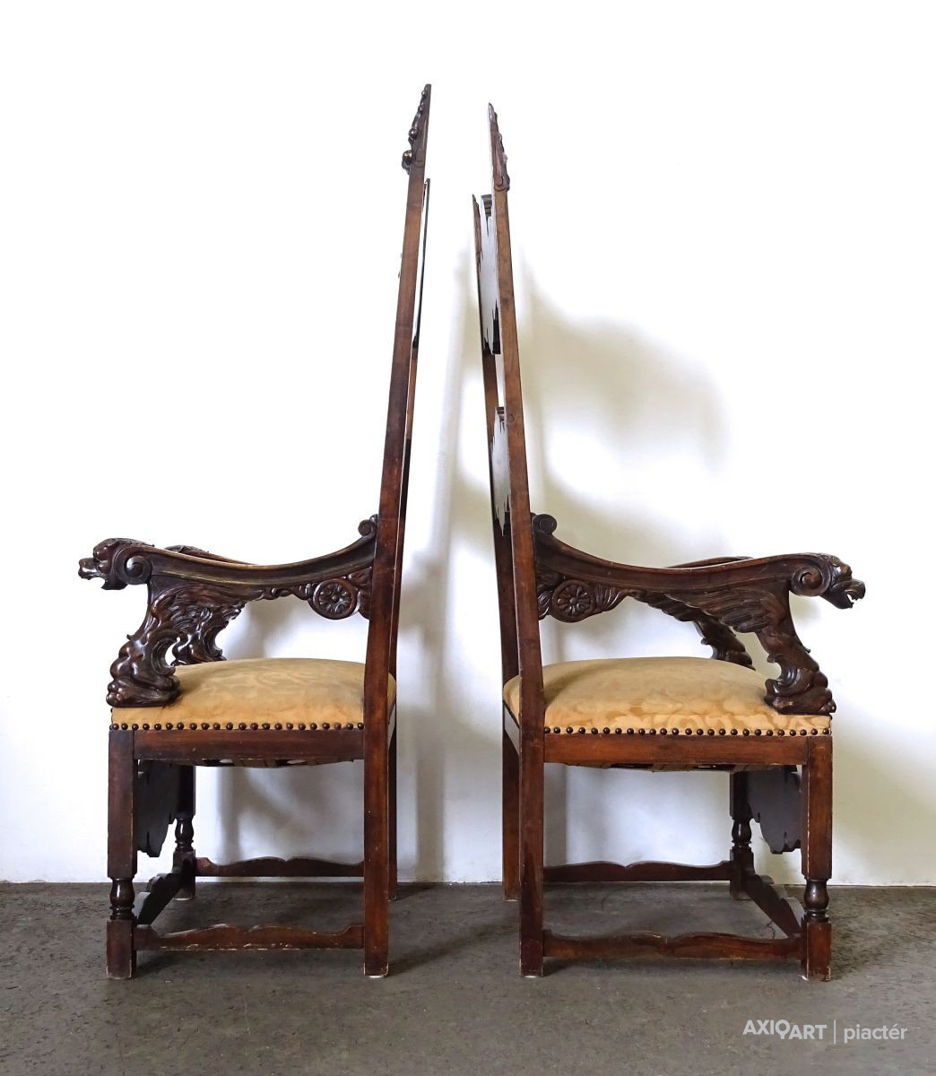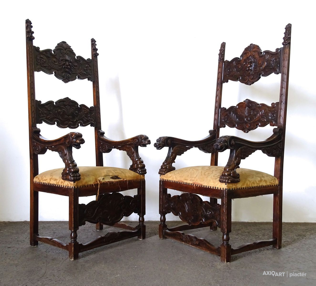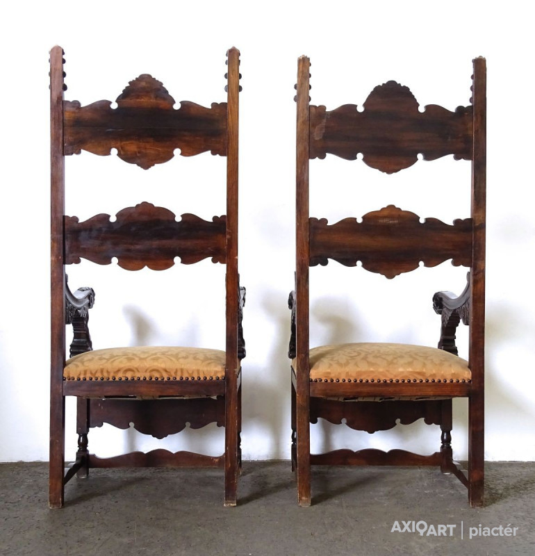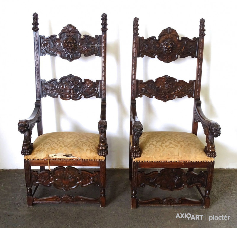 Gyönyörű antik trónszék pár, hatalmas támlás székek. Háttámla közepe faragott oroszlánfejjel díszített. A karfa végei szintén oroszlánfejben végződnek. Nagyon dúsan faragott, díszített, közel egyforma méretű darabok. 1830-1850 körüli darabok. Kastélybútorok!