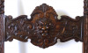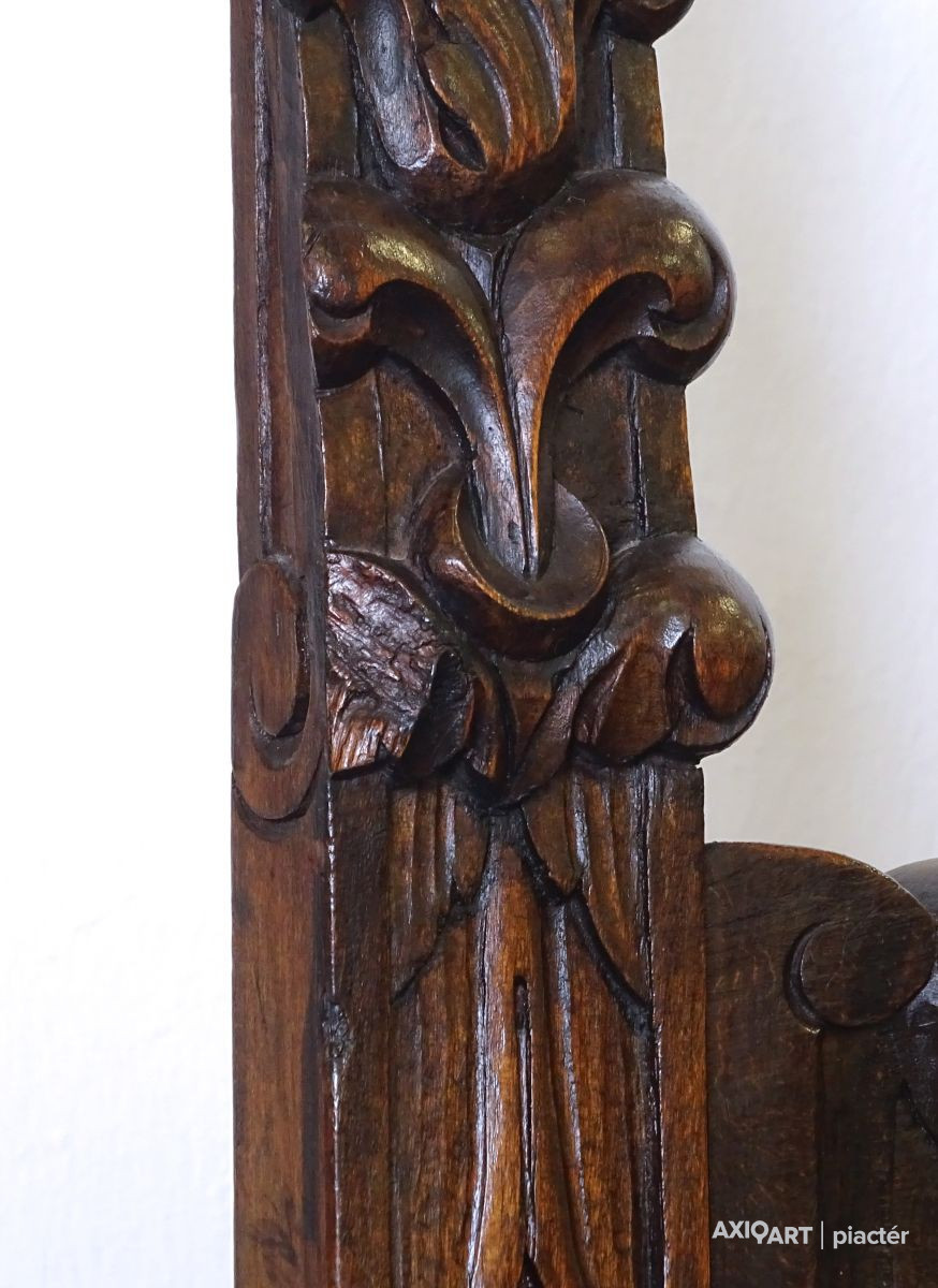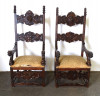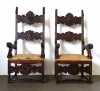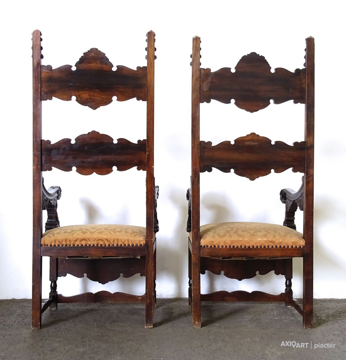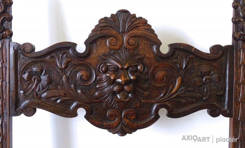 Gyönyörű antik trónszék pár, hatalmas támlás székek. Háttámla közepe faragott oroszlánfejjel díszített. A karfa végei szintén oroszlánfejben végződnek. Nagyon dúsan faragott, díszített, közel egyforma méretű darabok. 1830-1850 körüli darabok. Kastélybútorok!