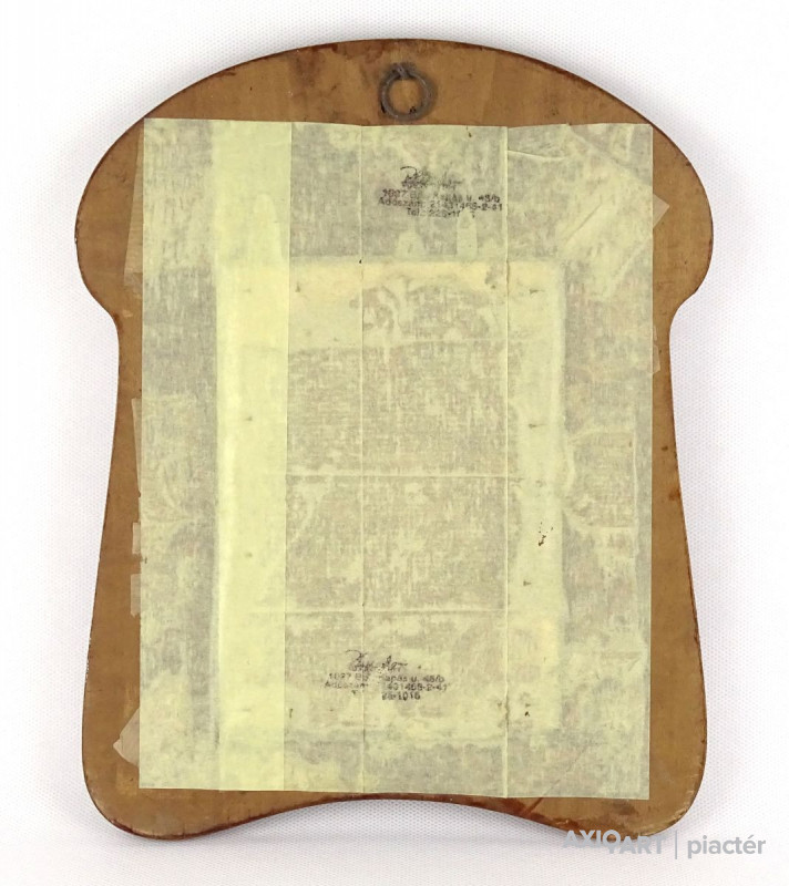 [1Y029/Z018] Olaj farost festmény, üveglap mögött, hibátlan képcsarnokos keretben. Hátoldalán Képcsarnok Vállalat papír címkéje: A művész neve: SCHÉNER MIHÁLY A kép címe: TÁJ Magasság: 66.5 cm Szélesség: 86 cm Súly: 6.54 kg Schéner Mihály festő, grafikus, szobrász, keramikus, bábtervező Medgyesegyháza, 1923-01-9 Elhalálozott: Budapest, 2009. május 11. Honlap: http://www.kormendigaleria.hu/kiadvany.html 1942-1947: Magyar Képzőművészeti Főiskola, tanára: Rudnay Gyula. 1978: Munkácsy-díj; 1984: érdemes művész; 1989: kiváló művész; 1995: Kossuth-díj. 1992-től a Magyar Művészeti Akadémia, 1993-tól a Széchenyi Irodalmi és Művészeti Akadémia tagja. 1956-ig tanított. 1982: Nagyatádi Faszobrász Alkotótelep, 1985: Nemzetközi Acélszobrász Alkotótelep, Dunaújváros. A stílusában felismerhető, mégis sokféle műtárgyat létrehozó ~ gazdag, állandóan alakuló életműve a folyton változó világban helyét kereső, az alkotói szabadságot megvalósító XX. századi képzőművész példázata lehetne. Magát expresszív-szürrealista alkotónak nevezi. Egyaránt dolgozik festékkel, textillel, fával, fémmel. Rajzol, szerkeszt, farag, épít, gyúr, varr és ragaszt, felhasználja a mézesbábok öntőformáit. Festő, rajzoló, textilszobor- és bábkészítő, fazekas, asztalos, esztergályos. Háromlépcsős folyamatban gondolkozik: rajzban tervez, majd fest, szobrot készít, “formába önt”, mindig a végső plasztikai megoldást keresi. Ami állandó és mégis játékosan változékony megjelenésű Schéner művészetében, az a gyermekkori emlékek által meghatározott népi mesterségek iránti tiszteletet kifejező motívumkincs, a tárgyi folklór formakészlete, amely már-már kézjegyként ismétlődik munkáin. Mitologikussá nőtt képzelete új lényeket teremt, pl: a Pigulát, amely disznótestű, emberfejű teremtmény. Schéner festményein a szürrealista motívumokat konstruktív szerkezetbe rendezi, a geometriát és az organikus természeti motívumokat egyaránt beépíti műveibe. A népi, népművészeti formakincsből merített lovas huszárok, betyárok, szegénylegények cifra szűr mentéje, piros csákója, fekete csizmája, az önálló életet élő zsinórdíszek és mézeskalács bábok, a kiskocsik a gyermekkori vásárok, búcsúk színes forgatagába vezet. A primér motívumokat aztán felváltják a vastagon felhordott felületbe karcolt jelek, vonalhálózatok, amelyek a játszó gyermek homokba rajzolt ábráit, a pásztorember fába vésett üzeneteit, az ősember barlang falába rótt mágikus jeleneteit idézik meg. A művész pillanatnyi érdeklődésének megfelelően a színek búvópatakként tűnnek el és jelennek meg ismét. A 60-as években leginkább a formákkal való játék érdekelte, a festmények felülete egyre gazdagodott: a táblaképek felületén applikációk jelentek meg, vagy lemállasztott rétegek hagyták maguk után hiányukat, motívumok nélküli ősformák, archetipikus képzetek bukkantak fel művészetében. A véletlenszerűnek látszó rétegekkel való játék azonban tudatos komponálás eredménye, amely később nyilvánvaló ritmusnak és formai szerkesztettségnek adja át a helyét, mint a Törvénytáblák c. sorozaton. A különböző művészi kifejezési formák egymásra termékenyítő hatással vannak, át- meg áthatják egymást. Textilszobrai, amelyekkel új műfajt teremtett, ugyanazzal az automatikus, expresszív-szürrealista módszerrel készülnek, mint festményei. A hagyományosan a népművészetben alkalmazott anyag, a filc lehetőséget ad a népi formakincs felelevenítésére, amely azonban a művész különös szürrealista átiratában jelenik meg. A szívekkel kivarrt, zsinórdíszes Posztókotlós c. művén mézesbábok lógnak, hátán huszárok lovagolnak. Egész sor textilből készült kéz-plasztikát alkot, amelyeket az ujjakra rávarrt díszekkel öltöztet, személyesít meg. A színes-különös világból aztán ~ újra puritán képi és formai rendbe juttatja el a nézőt, majd nemsokára tépett, gyűrt, vágott, csorgatott, repedezni hagyott szenvedélyesen vonagló képi felületeket hagy hátra. Schéner készített apró gyermekjátékokat, térstruktúra-tereket, mászókákat is. A magyar népi formák mellett szürreális játékaiban gyakran alkalmaz görög mitológiai alakokat, “elkentaurosodott” lovakat, Gorgó-fejeket, sellőket, hárpiákat, Pán-ábrázolásokat. Schéner nemcsak saját művészetéről publikál, hanem művésztársairól is számos írása jelenik meg, elsősorban az Új Auróra c. folyóiratban, amelynek egy ideig főmunkatársa volt. Irodalom kiállítása, Magyar Építőművészet, 1962/4. Húsz év után, Művészet, 1965/4. BOZÓKY M.: ~, Tiszatáj, 1968/5. PERNECZKY G.: Nincs uborkaszezon, Élet és Irodalom, 1969. augusztus 8. BARÁNSZKY-JÓB L.: ~, Művészet, 1969/9. LÁSZLÓ GY.: ~ kaposvári kiállítása, Jelenkor, 1969/4. MAJOR M.: Pásztorok, betyárok, huszárok - kezek, Tükör, 1970. szeptember 15. FRANK J.: Bemutatjuk ~t, Élet és Irodalom, 1972. május 6. ról kiállítása ürügyén, Képzőművészeti Almanach, Budapest, 1972 Sötétkék kokasok, Élet és Irodalom, 1973. szeptember 9. MAJOR M.: ~ játékai, Élet és Irodalom, 1974. július 27. BARTA J.: Egy különös művész, Alföld, 1974/6. VADAS J.: Szárnykészítők, Élet és Irodalom, 1975. október 4. JUHÁSZ F.: A halál ellen játszani, Élet és Irodalom, 1975. május 17. PAP G.: Kincsek és műkincsek, Művészet, 1975/6. P. SZŰCS J.: Az utak kettéválnak, Művészet, 1978/3. Békési művészet, Művészet, 1978/7. SZAMOSI F.: ~ [kismonográfia], Budapest, 1978 VADAS J.: Játék a játékkal, Élet és Irodalom, 1979. augusztus 18. NÉMETH L.: ~ műveiről, Művészet, 1979/4. MIKLÓS P.: Mit akar ez a múzeum?, Művésze