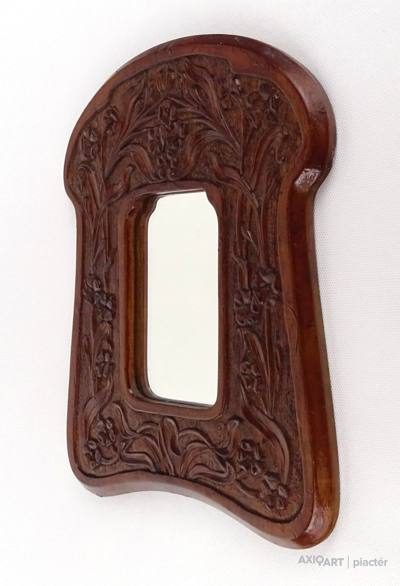[1Q840/143] Szép állapotú antik faragott szecessziós fa keretben található tükör. Falra akasztási lehetőséggel rendelkezik. A keret szecessziós virágmintákkal díszített. Magasság: 27.5 cm Szélesség: 22 cm Súly: 0.4 kg