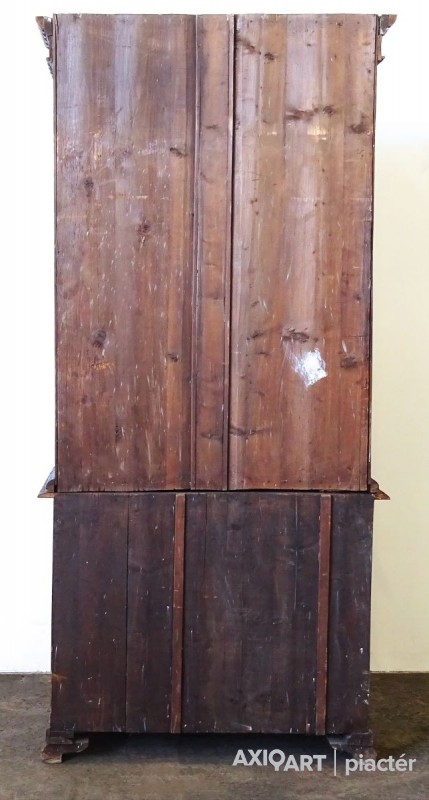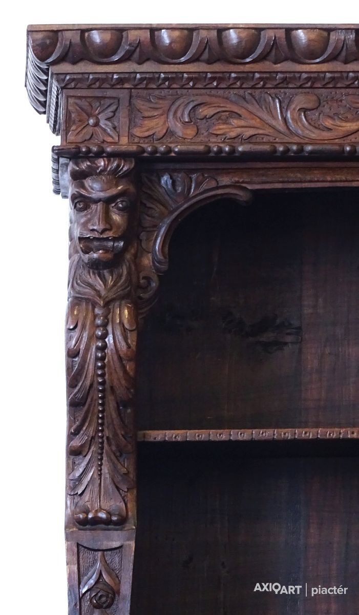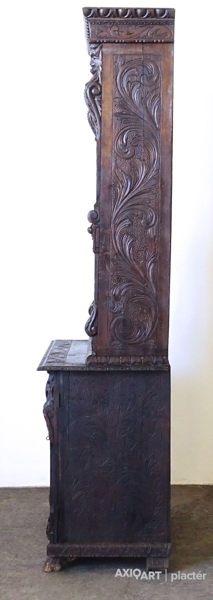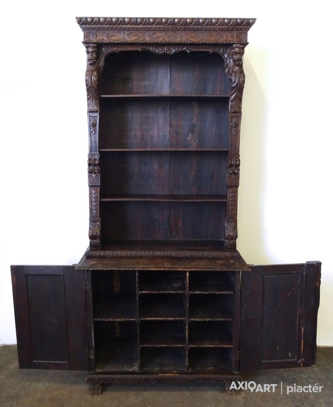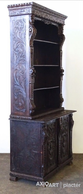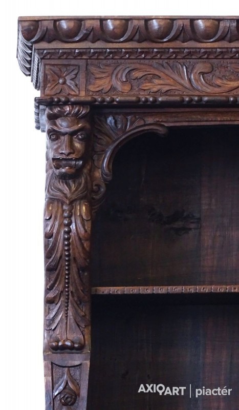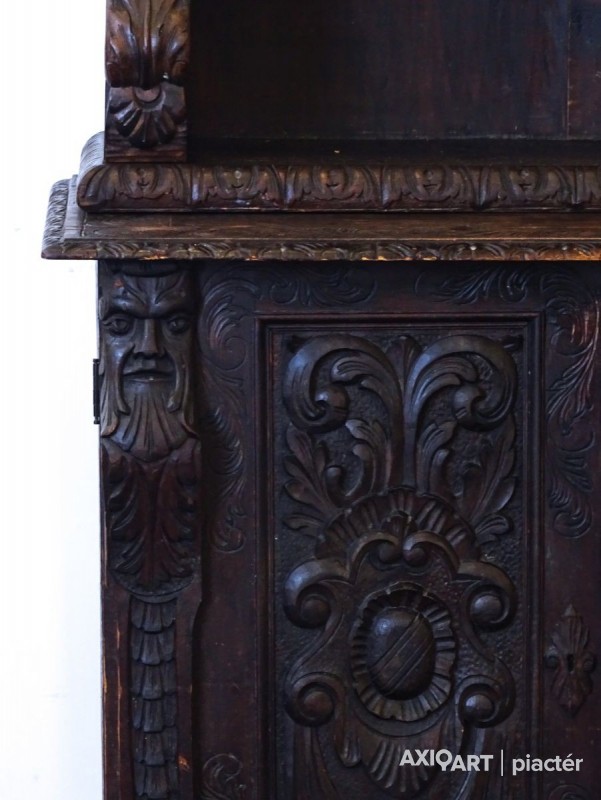Antik, szép állapotú, hatalmas, két részből álló rendkívül dúsan faragott szekrény. Az oldalak is teli vésett, virágindás díszítésűek. Nagy ritka bútor. Faragványokkal gazdagon díszített, faunfejes, polcos, kétajtós szekrény. 1830-60 körüli darab.
