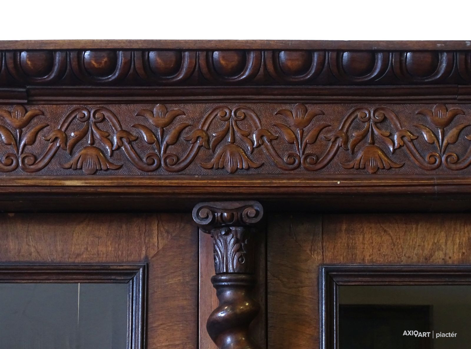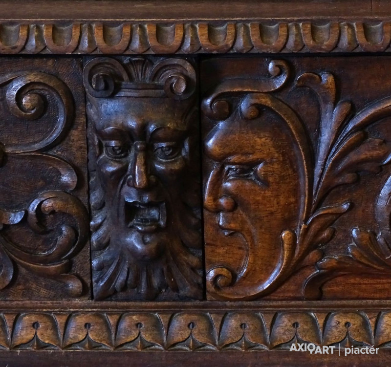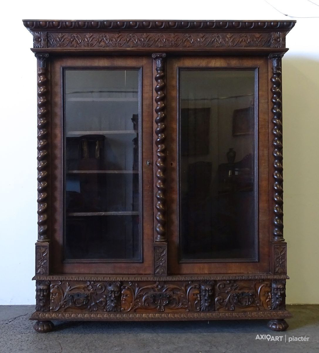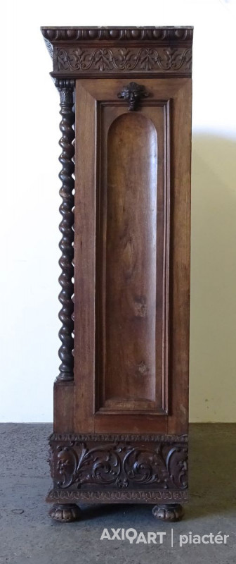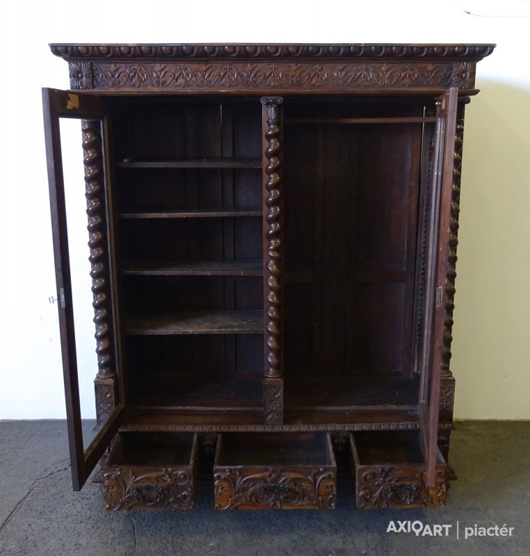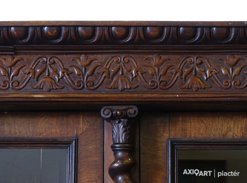 Antik nagy méretű dúsan faragott kétajtós, historizáló, üveges könyvszekrény. Három darab fiókkal rendelkezik, rajtuk egységes gyönyörű kovácsoltvas veretek. A szekrény egyik oldala polcos, a másik része akasztóssá alakított. De a polcfogak megvannak bármikor vissza polcozható könyveknek. A bútor gyönyörű csavart oszlopokkal díszített. Összesen 14 darab faragott faunfej található rajta. Hátoldala is eredeti, faragott, deszkázott hátlapokból áll.