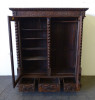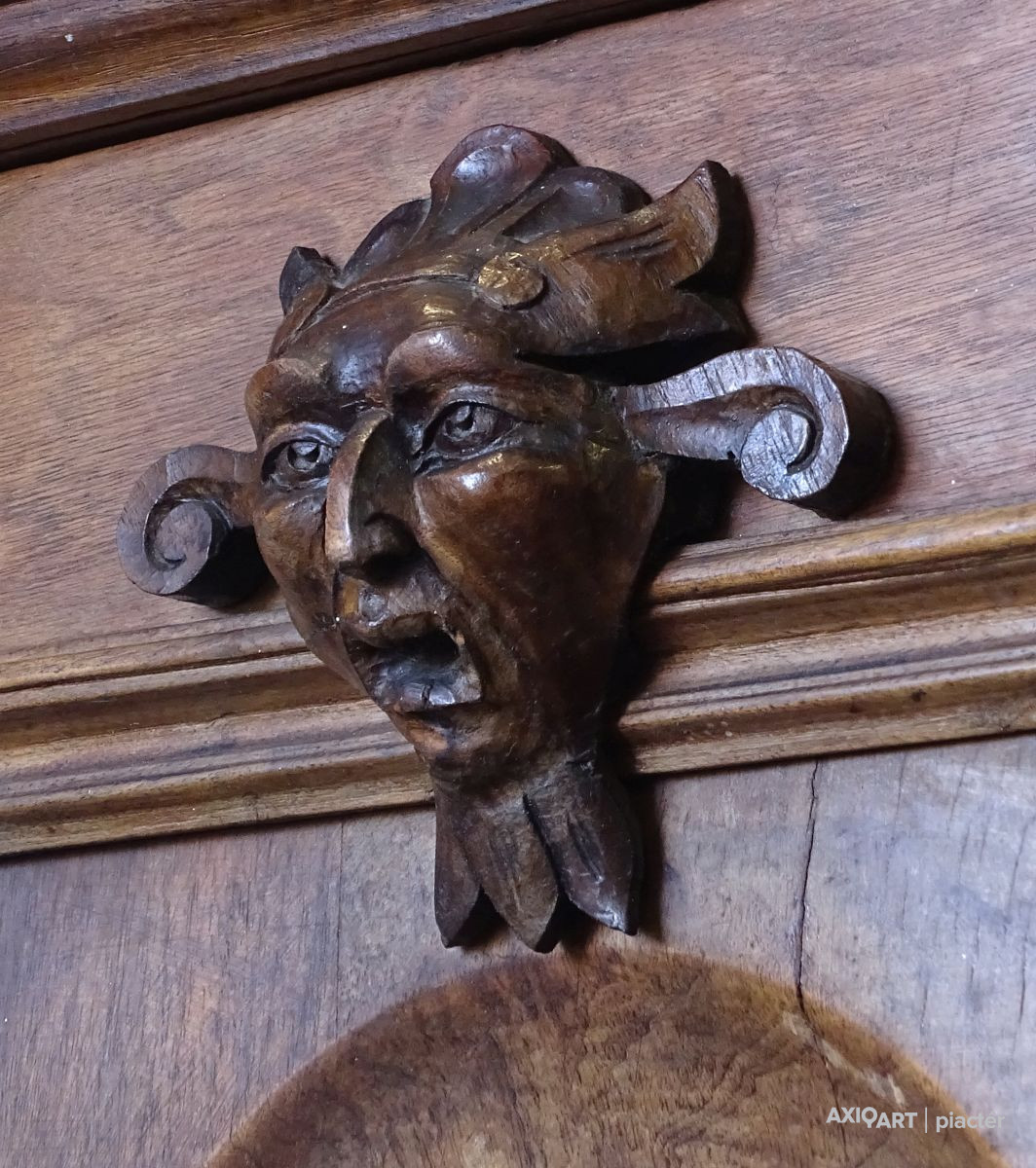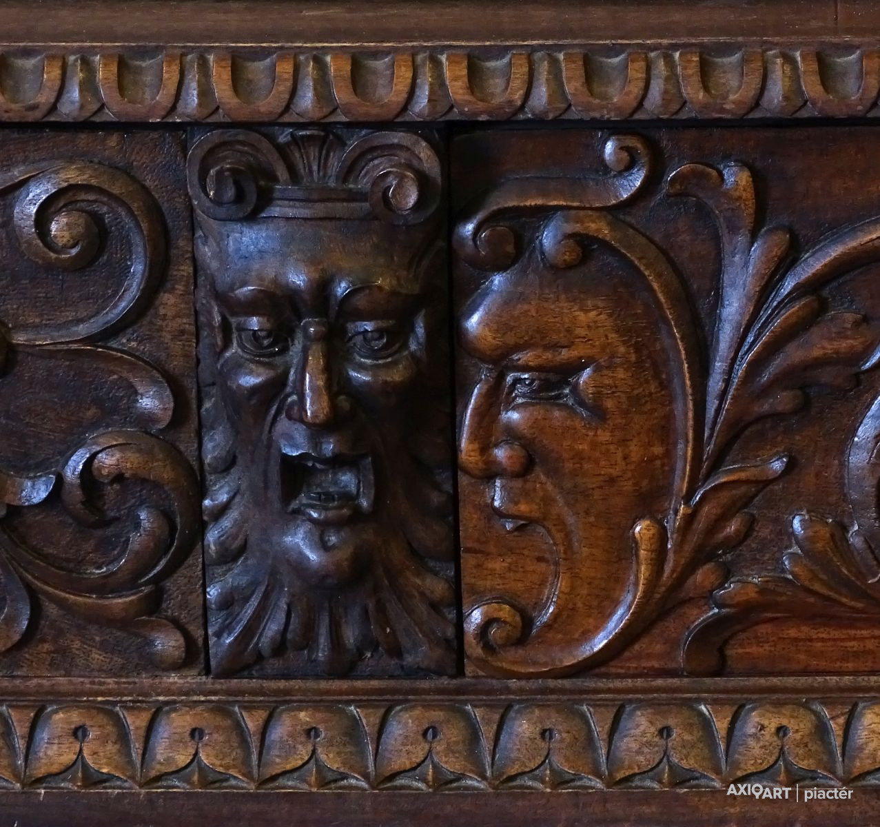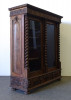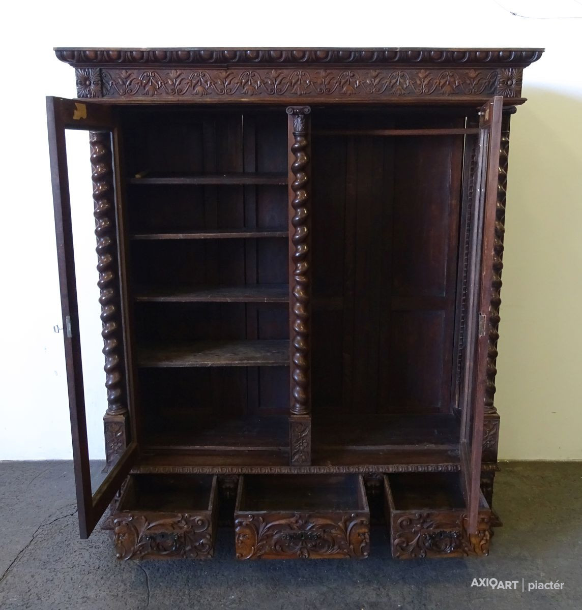 Antik nagy méretű dúsan faragott kétajtós, historizáló, üveges könyvszekrény. Három darab fiókkal rendelkezik, rajtuk egységes gyönyörű kovácsoltvas veretek. A szekrény egyik oldala polcos, a másik része akasztóssá alakított. De a polcfogak megvannak bármikor vissza polcozható könyveknek. A bútor gyönyörű csavart oszlopokkal díszített. Összesen 14 darab faragott faunfej található rajta. Hátoldala is eredeti, faragott, deszkázott hátlapokból áll.
