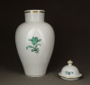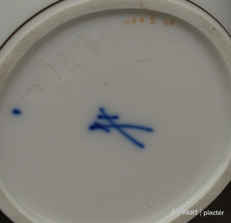 [1E332/BX-8] Hibátlan állapotú, jelzett, nagy méretű, virágokkal díszített, aranyozott, kézzel festett, fedeles Meisseni porcelán urna, urnaváza. Alján kék kardos Meisseni márkajelzés. Mélynyomással formaszám: H127 Magasság: 25.5 cm Szélesség: 11.5 cm Súly: 0.828 kg