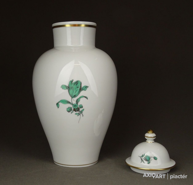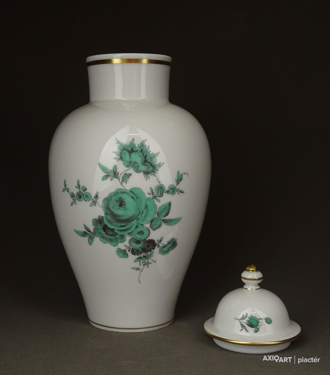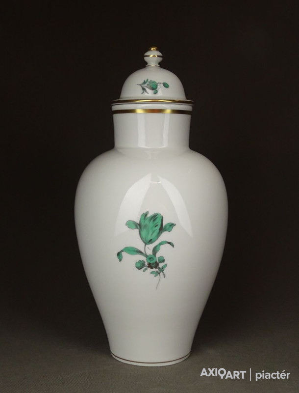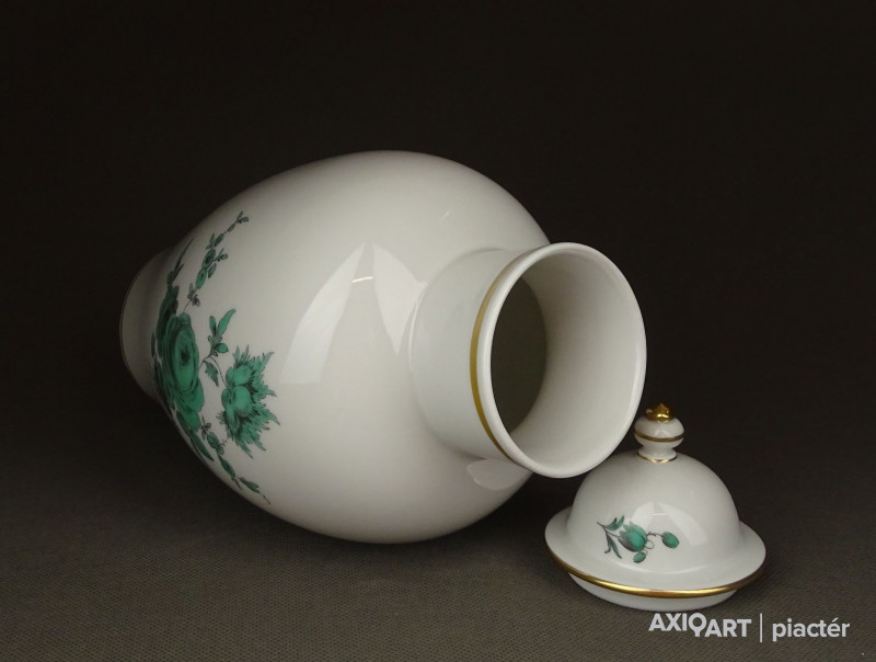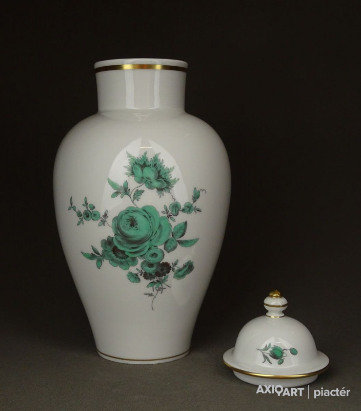 Hibátlan állapotú, jelzett, nagy méretű, virágokkal díszített, aranyozott, kézzel festett, fedeles Meisseni porcelán urna, urnaváza.