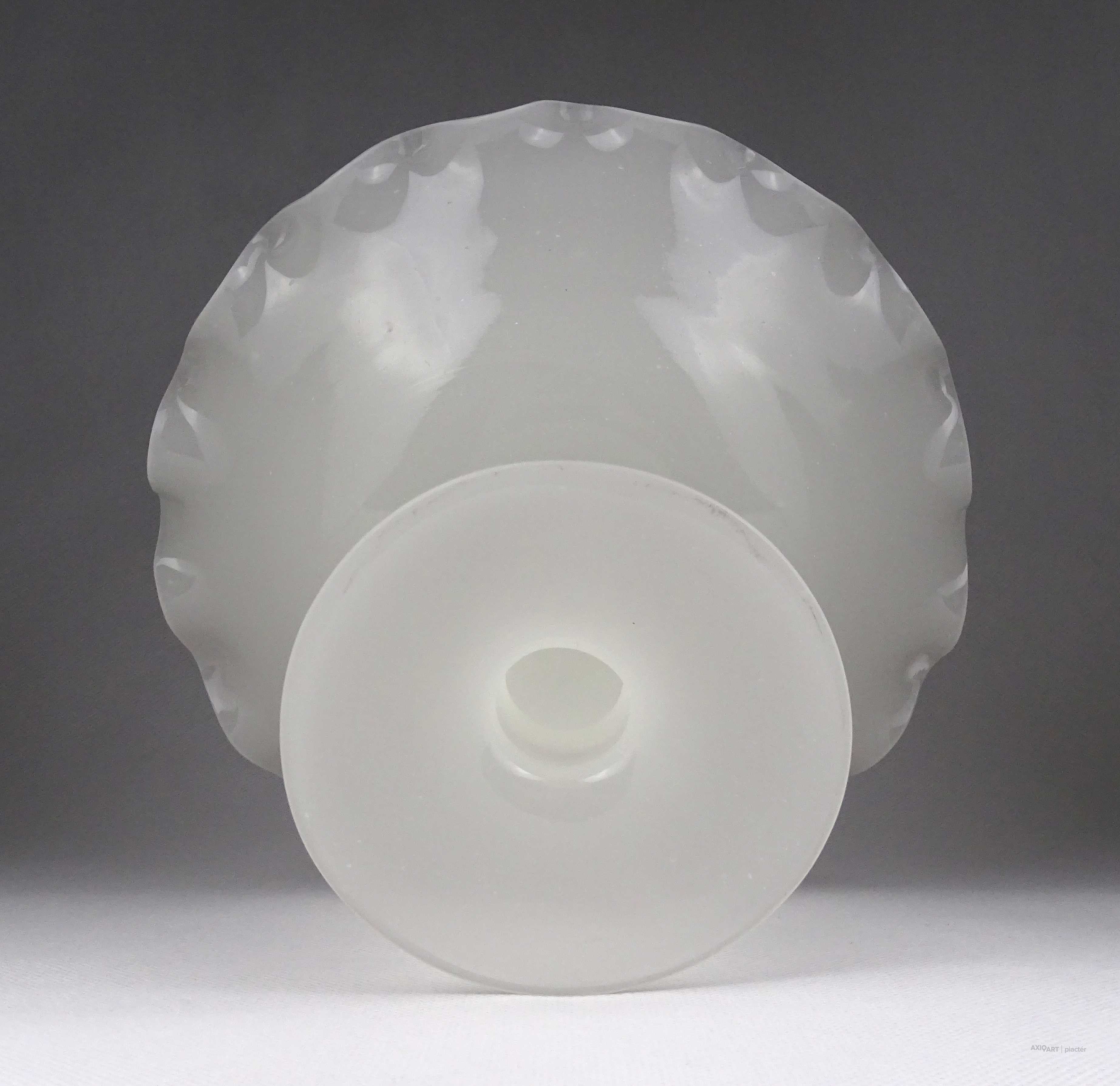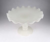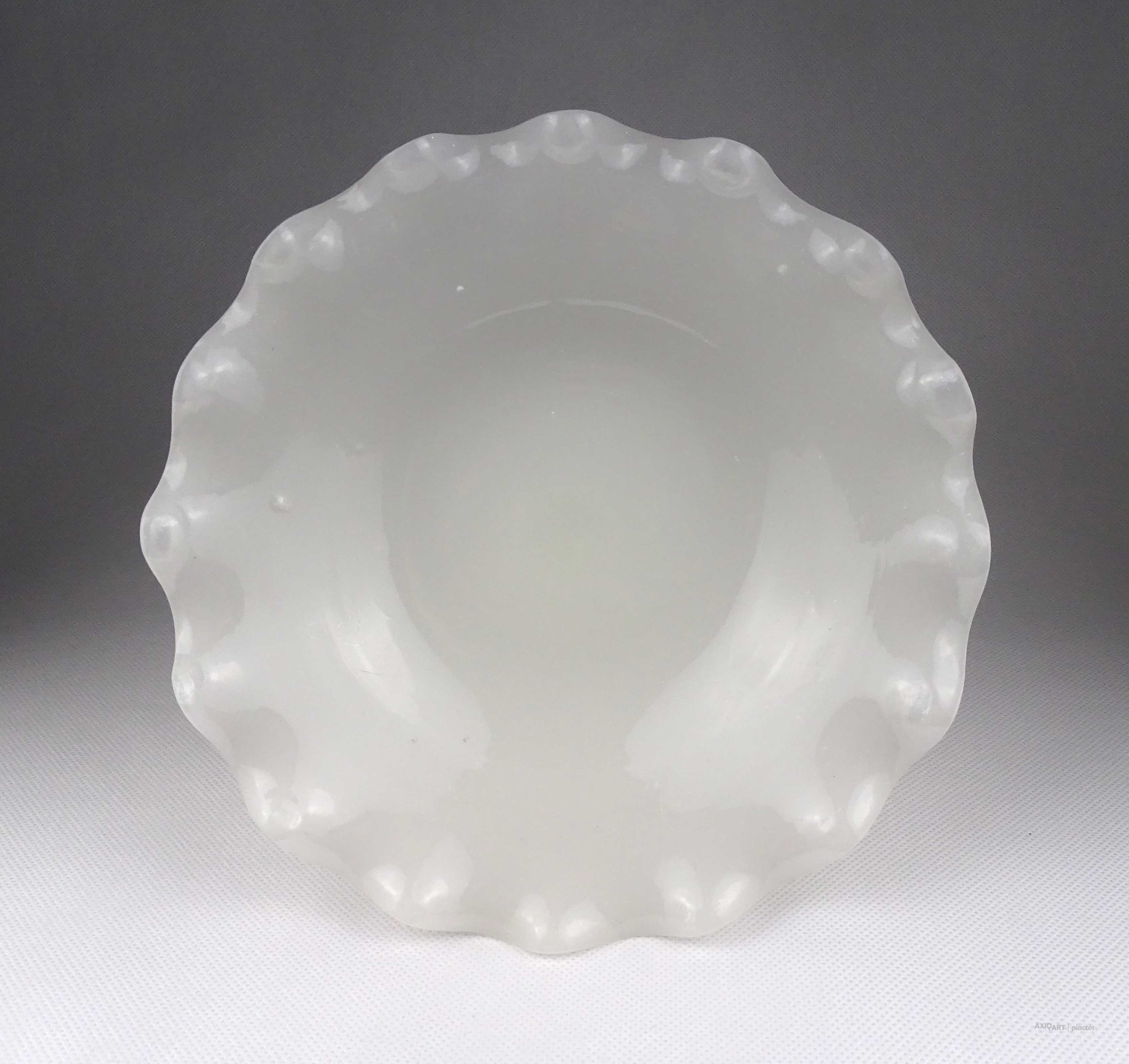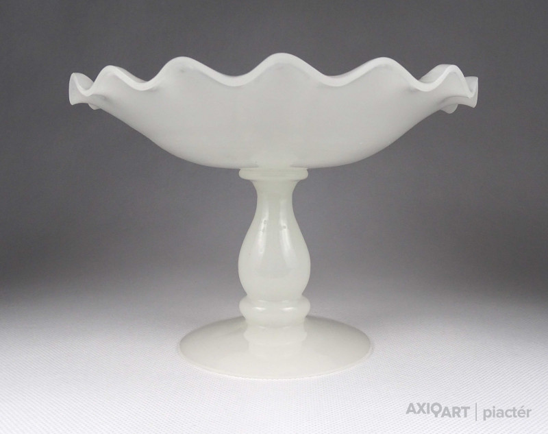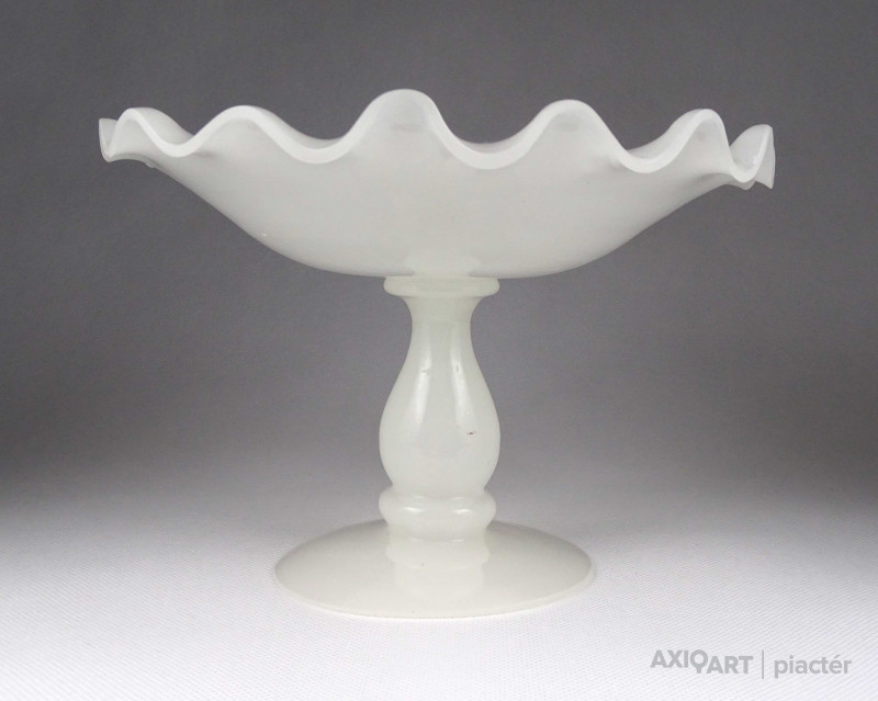 [1Z102/Z267] Antik, hibátlan állapotú, fehér kalcedon üveg, fújtüveg művészi talpas asztalközép kínáló tál, gyümölcskínáló tál. Magasság: 14.7 cm Szélesség: 21.5 cm Súly: 0.71 kg