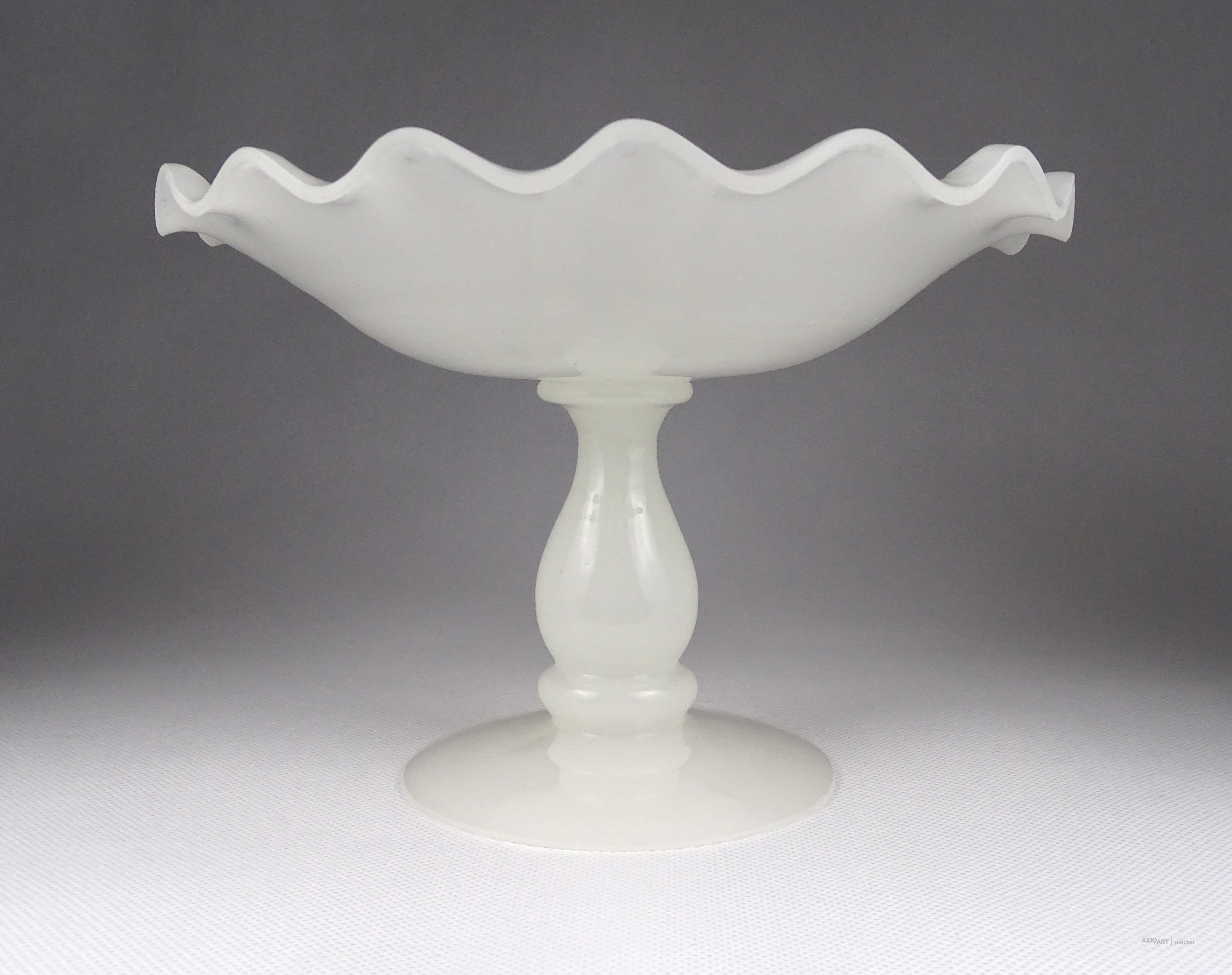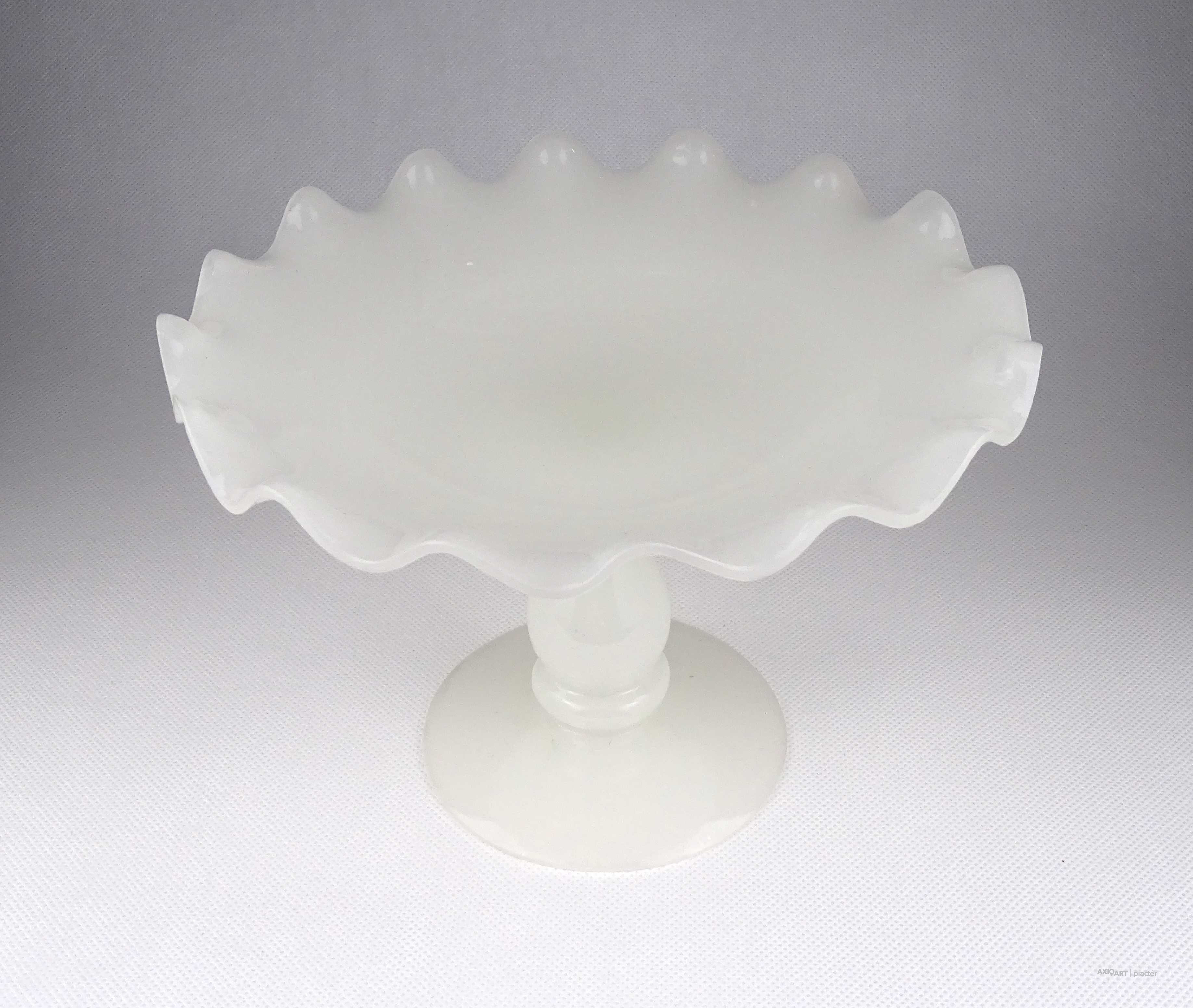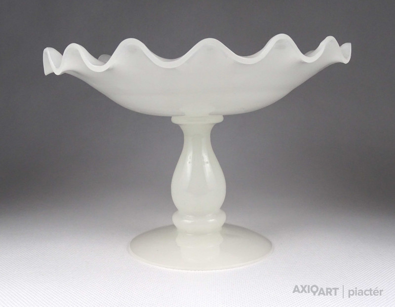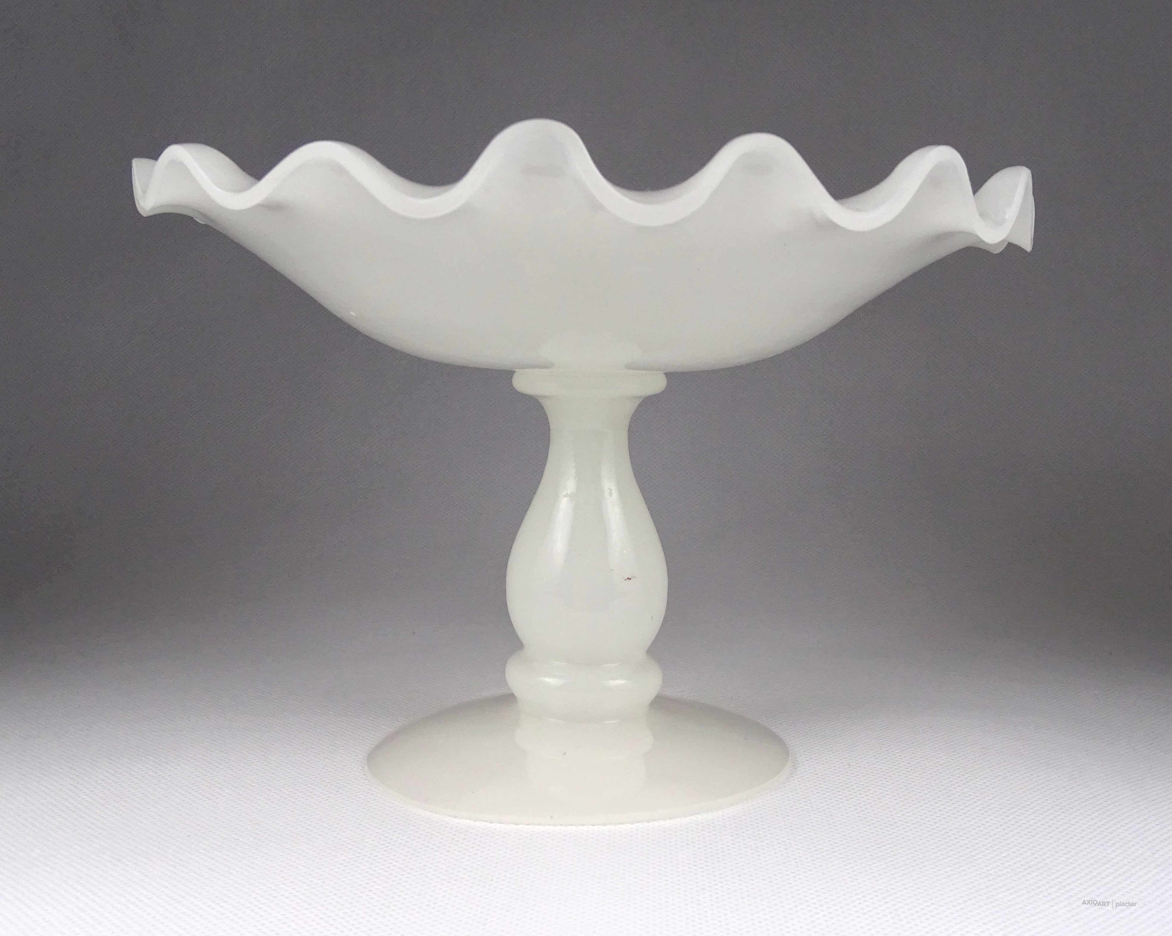 Antik, hibátlan állapotú, fehér kalcedon üveg, fújtüveg művészi talpas asztalközép kínáló tál, gyümölcskínáló tál.