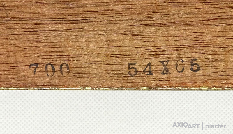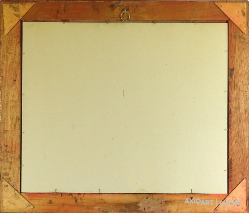 [1Y029/Z018] Olaj farost festmény, üveglap mögött, hibátlan képcsarnokos keretben. Hátoldalán Képcsarnok Vállalat papír címkéje: A művész neve: SCHÉNER MIHÁLY A kép címe: TÁJ Magasság: 66.5 cm Szélesség: 86 cm Súly: 6.54 kg Schéner Mihály festő, grafikus, szobrász, keramikus, bábtervező Medgyesegyháza, 1923-01-9 Elhalálozott: Budapest, 2009. május 11. Honlap: http://www.kormendigaleria.hu/kiadvany.html 1942-1947: Magyar Képzőművészeti Főiskola, tanára: Rudnay Gyula. 1978: Munkácsy-díj; 1984: érdemes művész; 1989: kiváló művész; 1995: Kossuth-díj. 1992-től a Magyar Művészeti Akadémia, 1993-tól a Széchenyi Irodalmi és Művészeti Akadémia tagja. 1956-ig tanított. 1982: Nagyatádi Faszobrász Alkotótelep, 1985: Nemzetközi Acélszobrász Alkotótelep, Dunaújváros. A stílusában felismerhető, mégis sokféle műtárgyat létrehozó ~ gazdag, állandóan alakuló életműve a folyton változó világban helyét kereső, az alkotói szabadságot megvalósító XX. századi képzőművész példázata lehetne. Magát expresszív-szürrealista alkotónak nevezi. Egyaránt dolgozik festékkel, textillel, fával, fémmel. Rajzol, szerkeszt, farag, épít, gyúr, varr és ragaszt, felhasználja a mézesbábok öntőformáit. Festő, rajzoló, textilszobor- és bábkészítő, fazekas, asztalos, esztergályos. Háromlépcsős folyamatban gondolkozik: rajzban tervez, majd fest, szobrot készít, “formába önt”, mindig a végső plasztikai megoldást keresi. Ami állandó és mégis játékosan változékony megjelenésű Schéner művészetében, az a gyermekkori emlékek által meghatározott népi mesterségek iránti tiszteletet kifejező motívumkincs, a tárgyi folklór formakészlete, amely már-már kézjegyként ismétlődik munkáin. Mitologikussá nőtt képzelete új lényeket teremt, pl: a Pigulát, amely disznótestű, emberfejű teremtmény. Schéner festményein a szürrealista motívumokat konstruktív szerkezetbe rendezi, a geometriát és az organikus természeti motívumokat egyaránt beépíti műveibe. A népi, népművészeti formakincsből merített lovas huszárok, betyárok, szegénylegények cifra szűr mentéje, piros csákója, fekete csizmája, az önálló életet élő zsinórdíszek és mézeskalács bábok, a kiskocsik a gyermekkori vásárok, búcsúk színes forgatagába vezet. A primér motívumokat aztán felváltják a vastagon felhordott felületbe karcolt jelek, vonalhálózatok, amelyek a játszó gyermek homokba rajzolt ábráit, a pásztorember fába vésett üzeneteit, az ősember barlang falába rótt mágikus jeleneteit idézik meg. A művész pillanatnyi érdeklődésének megfelelően a színek búvópatakként tűnnek el és jelennek meg ismét. A 60-as években leginkább a formákkal való játék érdekelte, a festmények felülete egyre gazdagodott: a táblaképek felületén applikációk jelentek meg, vagy lemállasztott rétegek hagyták maguk után hiányukat, motívumok nélküli ősformák, archetipikus képzetek bukkantak fel művészetében. A véletlenszerűnek látszó rétegekkel való játék azonban tudatos komponálás eredménye, amely később nyilvánvaló ritmusnak és formai szerkesztettségnek adja át a helyét, mint a Törvénytáblák c. sorozaton. A különböző művészi kifejezési formák egymásra termékenyítő hatással vannak, át- meg áthatják egymást. Textilszobrai, amelyekkel új műfajt teremtett, ugyanazzal az automatikus, expresszív-szürrealista módszerrel készülnek, mint festményei. A hagyományosan a népművészetben alkalmazott anyag, a filc lehetőséget ad a népi formakincs felelevenítésére, amely azonban a művész különös szürrealista átiratában jelenik meg. A szívekkel kivarrt, zsinórdíszes Posztókotlós c. művén mézesbábok lógnak, hátán huszárok lovagolnak. Egész sor textilből készült kéz-plasztikát alkot, amelyeket az ujjakra rávarrt díszekkel öltöztet, személyesít meg. A színes-különös világból aztán ~ újra puritán képi és formai rendbe juttatja el a nézőt, majd nemsokára tépett, gyűrt, vágott, csorgatott, repedezni hagyott szenvedélyesen vonagló képi felületeket hagy hátra. Schéner készített apró gyermekjátékokat, térstruktúra-tereket, mászókákat is. A magyar népi formák mellett szürreális játékaiban gyakran alkalmaz görög mitológiai alakokat, “elkentaurosodott” lovakat, Gorgó-fejeket, sellőket, hárpiákat, Pán-ábrázolásokat. Schéner nemcsak saját művészetéről publikál, hanem művésztársairól is számos írása jelenik meg, elsősorban az Új Auróra c. folyóiratban, amelynek egy ideig főmunkatársa volt. Irodalom kiállítása, Magyar Építőművészet, 1962/4. Húsz év után, Művészet, 1965/4. BOZÓKY M.: ~, Tiszatáj, 1968/5. PERNECZKY G.: Nincs uborkaszezon, Élet és Irodalom, 1969. augusztus 8. BARÁNSZKY-JÓB L.: ~, Művészet, 1969/9. LÁSZLÓ GY.: ~ kaposvári kiállítása, Jelenkor, 1969/4. MAJOR M.: Pásztorok, betyárok, huszárok - kezek, Tükör, 1970. szeptember 15. FRANK J.: Bemutatjuk ~t, Élet és Irodalom, 1972. május 6. ról kiállítása ürügyén, Képzőművészeti Almanach, Budapest, 1972 Sötétkék kokasok, Élet és Irodalom, 1973. szeptember 9. MAJOR M.: ~ játékai, Élet és Irodalom, 1974. július 27. BARTA J.: Egy különös művész, Alföld, 1974/6. VADAS J.: Szárnykészítők, Élet és Irodalom, 1975. október 4. JUHÁSZ F.: A halál ellen játszani, Élet és Irodalom, 1975. május 17. PAP G.: Kincsek és műkincsek, Művészet, 1975/6. P. SZŰCS J.: Az utak kettéválnak, Művészet, 1978/3. Békési művészet, Művészet, 1978/7. SZAMOSI F.: ~ [kismonográfia], Budapest, 1978 VADAS J.: Játék a játékkal, Élet és Irodalom, 1979. augusztus 18. NÉMETH L.: ~ műveiről, Művészet, 1979/4. MIKLÓS P.: Mit akar ez a múzeum?, Művésze