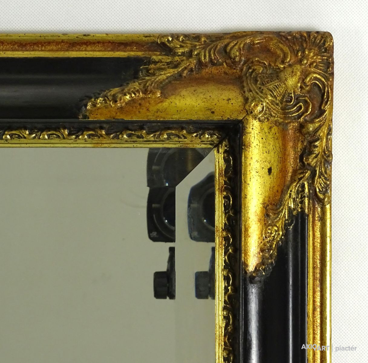 Gyönyörű, aranyozott és fekete színű antik keretben található metszett, fazettázott tükör. Hátulján falra akasztási lehetőség található. Azonnal falra akasztható állapotban van.