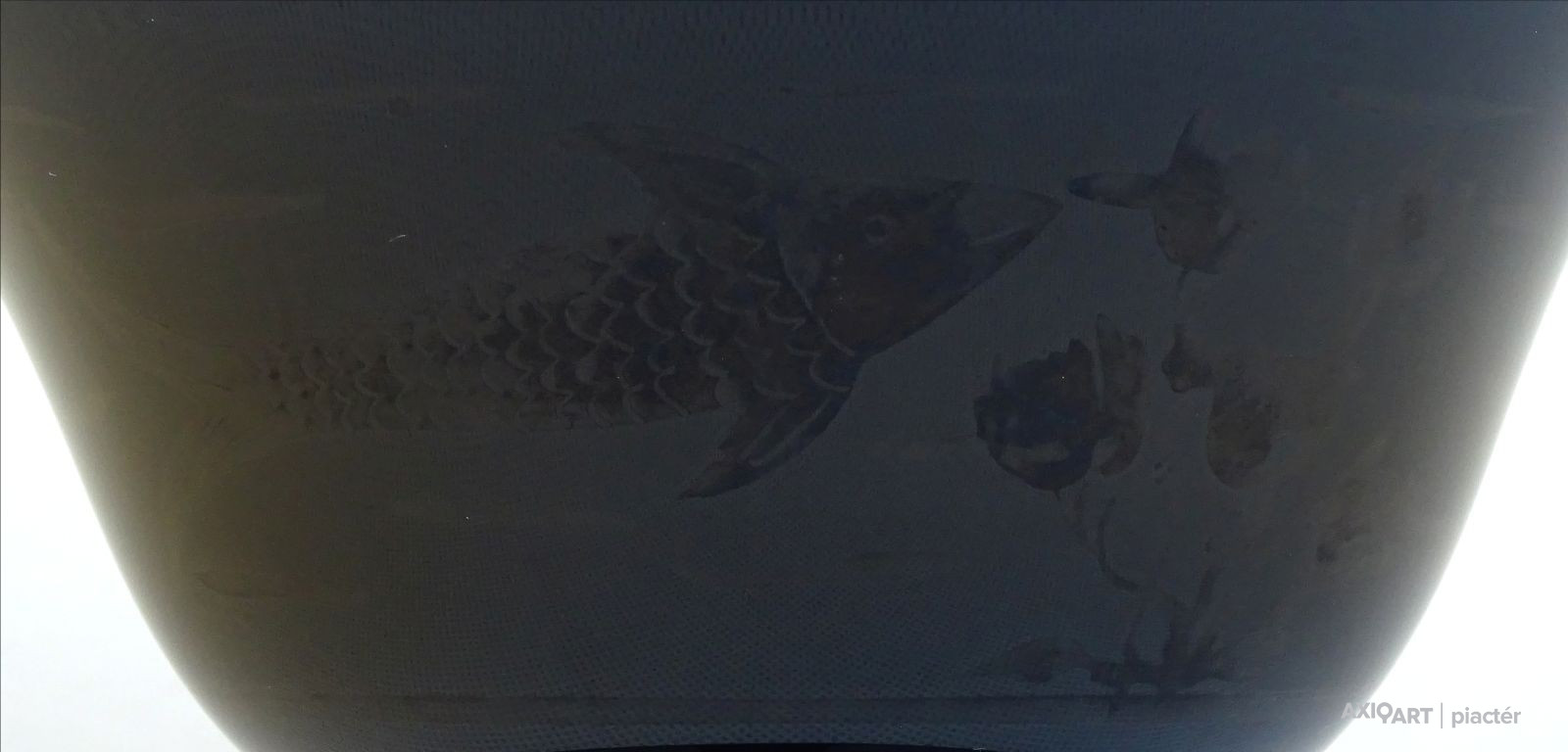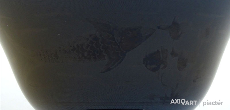Antik, hibátlan állapotú, fekete színű, talpas üveg kehely, fagylaltos kehely. A kehely peremén kívülről kopottas ezüst szegély nyomai és oldalán halvány hal motívum látható.