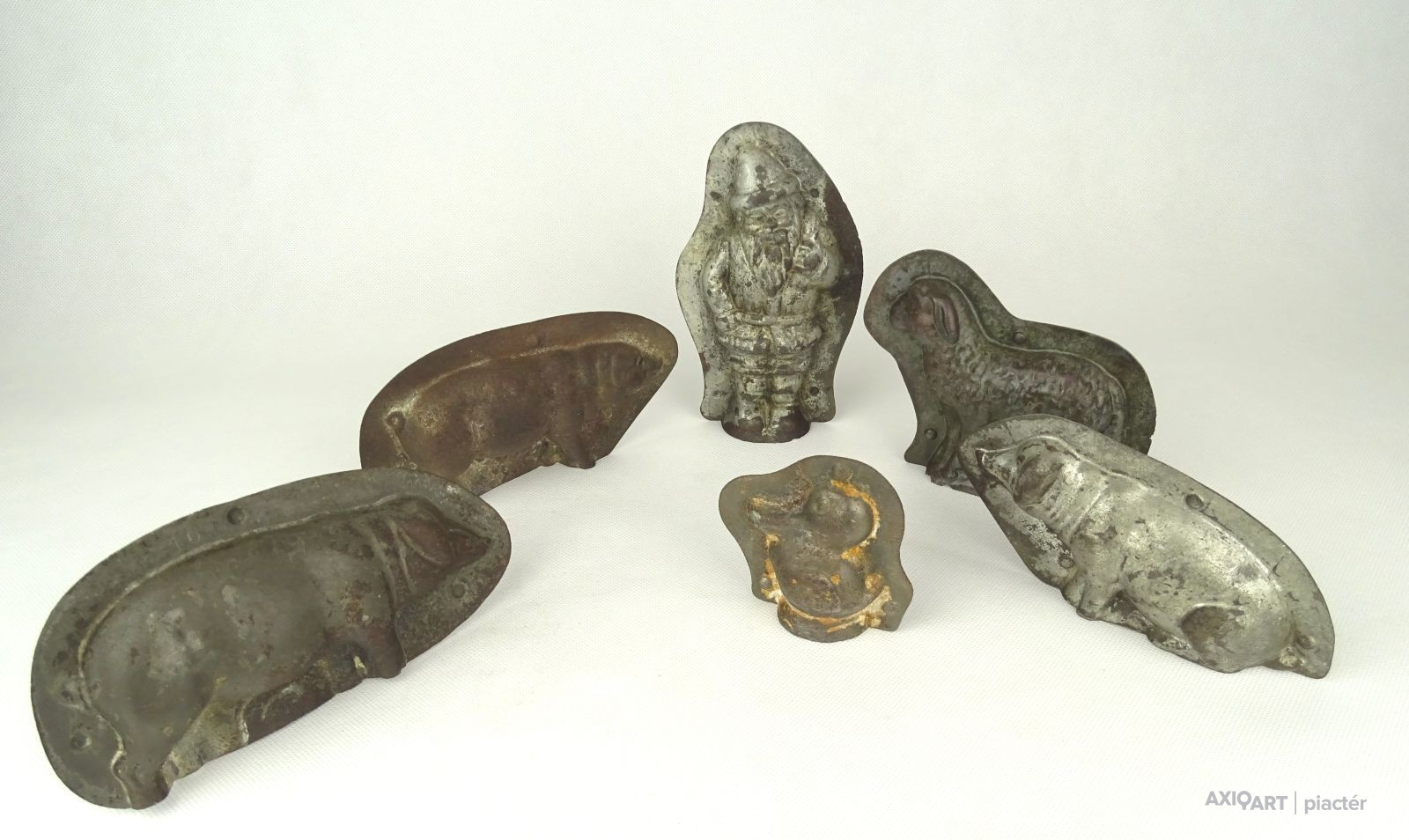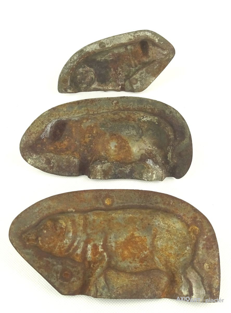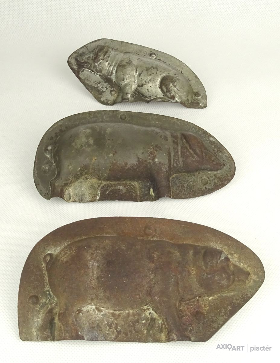 [1G107/X040] Antik, vegyes, csoki öntő forma, cukrászati eszköz. Méretek: - 3 db újévi malac 16.5 x 8 x 2 cm, 15.8 x 8 x 2 cm, 15 x 8 x 2 cm - 1 bárány 13 x 10.5 x 1 cm - 1 kacsa 7.5 x 7.5 x 1 cm - 1 Mikulás 9 x 15 x 2 cm Súly: 0.282 kg